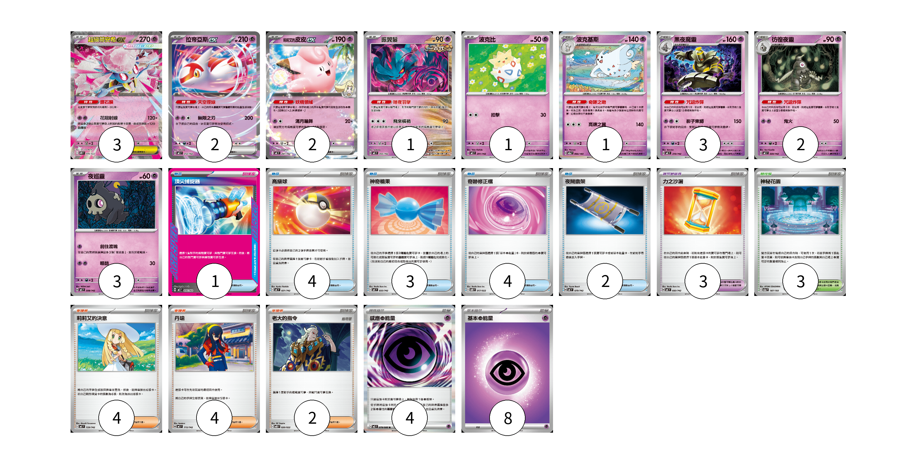牌組構築方案 以此牌組為基礎新構築牌組 顯示卡面 顯示列表 寶可夢卡(18) 3 2 2 1 1 1 3 2 3 寶可夢道具(3) 3 物品卡(14) 1 4 3 4 2 支援者卡(10) 4 4 2 競技場卡(3) 3 能量卡(12) 4 8 寶可夢卡(18) 卡牌名稱 張數 卡牌名稱 張數 超級蒂安希ex MBD 006/022 03 拉帝亞斯ex MC 312/742 02 莉莉艾的皮皮ex MC 287/742 02 振翼髮 MC 355/742 01 波克比 MC 291/742 01 波克基斯 M2a 066/193 01 黑夜魔靈 MC 310/742 03 彷徨夜靈 MC 309/742 02 夜巡靈 MC 308/742 03 寶可夢道具(3) 卡牌名稱 張數 卡牌名稱 張數 力之沙漏 MC 683/742 03 物品卡(14) 卡牌名稱 張數 卡牌名稱 張數 頂尖捕捉器 MC 656/742 01 高級球 MC 651/742 04 神奇糖果 MC 655/742 03 奇跡修正檔 MBD 017/022 04 夜間擔架 MC 670/742 02 支援者卡(10) 卡牌名稱 張數 卡牌名稱 張數 莉莉艾的決意 MC 729/742 04 丹瑜 MC 715/742 04 老大的指令 MBD 020/022 02 競技場卡(3) 卡牌名稱 張數 卡牌名稱 張數 神秘花園 M2a 187/193 03 能量卡(12) 卡牌名稱 張數 卡牌名稱 張數 感應【超】能量 M3 079/080 04 基本【超】能量 MC PSY 08 以此牌組為基礎新構築牌組 牌組編碼 DXQczJ-jpbEaN-ugyMEu copy 列印牌組單 牌組編碼已複製 分享至SNS