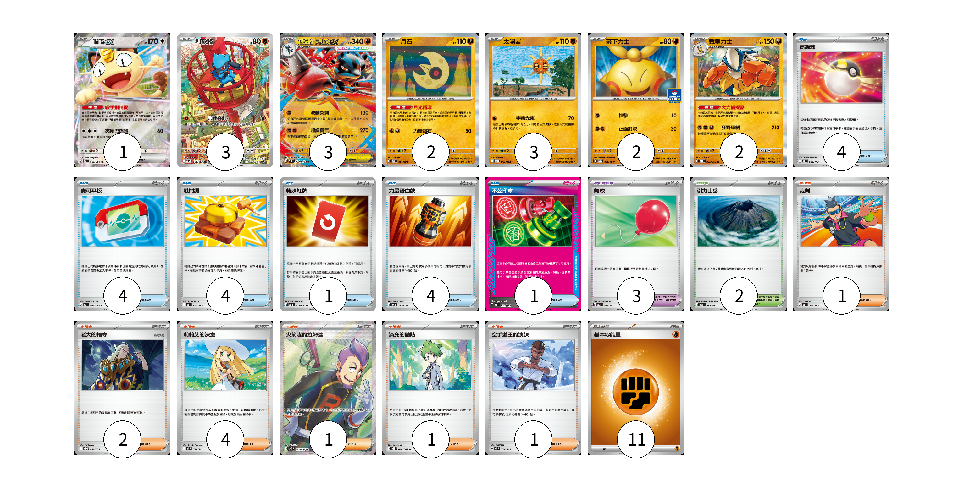 牌組構築方案 以此牌組為基礎新構築牌組 顯示卡面 顯示列表 寶可夢卡(16) 1 3 3 2 3 2 2 寶可夢道具(3) 3 物品卡(18) 4 4 4 1 4 1 支援者卡(10) 1 2 4 1 1 1 競技場卡(2) 2 能量卡(11) 11 寶可夢卡(16) 卡牌名稱 張數 卡牌名稱 張數 喵喵ex M3 061/080 01 利歐路 M1L 068/063 03 超級路卡利歐ex M1L 029/063 03 月石 M2a 086/193 02 太陽岩 M2a 087/193 03 幕下力士 M-P 015/M-P 02 鐵掌力士 M1L 025/063 02 寶可夢道具(3) 卡牌名稱 張數 卡牌名稱 張數 氣球 MC 688/742 03 物品卡(18) 卡牌名稱 張數 卡牌名稱 張數 高級球 MC 651/742 04 寶可平板 M3 070/080 04 戰鬥鑼 MC 654/742 04 特殊紅牌 M4 072/083 01 力量蛋白飲 MC 652/742 04 不公印章 MC 633/742 01 支援者卡(10) 卡牌名稱 張數 卡牌名稱 張數 裁判 MC 711/742 01 老大的指令 MBD 020/022 02 莉莉艾的決意 MC 729/742 04 火箭隊的拉姆達 SV10 122/098 01 滿充的體貼 M1S 060/063 01 空手道王的演練 MC 704/742 01 競技場卡(2) 卡牌名稱 張數 卡牌名稱 張數 引力山岳 M2a 183/193 02 能量卡(11) 卡牌名稱 張數 卡牌名稱 張數 基本【鬥】能量 MC FIG 11 以此牌組為基礎新構築牌組 牌組編碼 DZXvnT-fhyGbx-dAxMPv copy 列印牌組單 牌組編碼已複製 分享至SNS