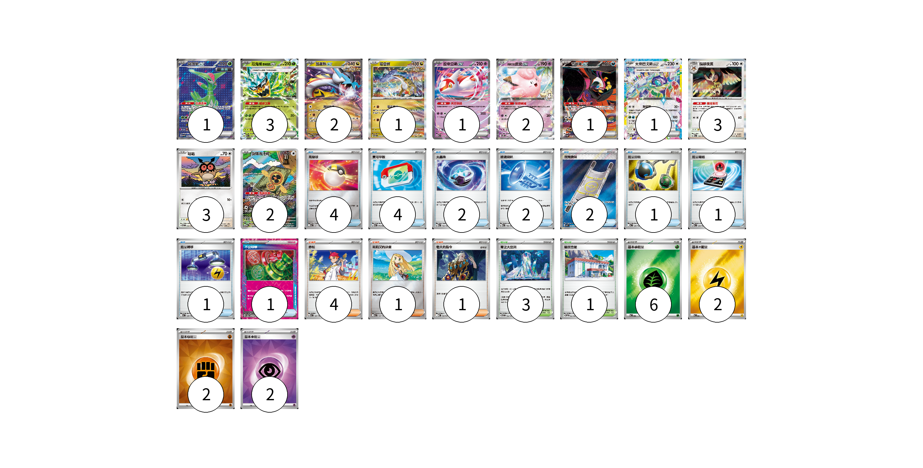 牌組構築方案 以此牌組為基礎新構築牌組 顯示卡面 顯示列表 寶可夢卡(20) 1 3 2 1 1 2 1 1 3 3 2 物品卡(18) 4 4 2 2 2 1 1 1 1 支援者卡(6) 4 1 1 競技場卡(4) 3 1 能量卡(12) 6 2 2 2 寶可夢卡(20) 卡牌名稱 張數 卡牌名稱 張數 鐵斑葉ex SV5M 084/071 01 厄鬼椪 碧草面具ex MC 082/742 03 猛雷鼓ex MC 554/742 02 猛雷鼓 SV7 075/102 01 拉帝亞斯ex MC 312/742 01 莉莉艾的皮皮ex SV9 033/100 02 吉雉雞ex SV6a 089/064 01 太樂巴戈斯ex SV8a 136/187 01 貓頭夜鷹 M2a 138/193 03 咕咕 SV7 076/102 03 旋轉洛托姆 M2a 213/193 02 物品卡(18) 卡牌名稱 張數 卡牌名稱 張數 高級球 MC 651/742 04 寶可平板 M3 070/080 04 太晶珠 M2a 152/193 02 玻璃喇叭 M2a 149/193 02 夜間擔架 M1L 083/063 02 能量回收 MC 636/742 01 能量輸送 MC 639/742 01 能量轉移 MC 638/742 01 不公印章 SV5a 053/066 01 支援者卡(6) 卡牌名稱 張數 卡牌名稱 張數 赤松 MC 696/742 04 莉莉艾的決意 MC 729/742 01 老大的指令 MBD 020/022 01 競技場卡(4) 卡牌名稱 張數 卡牌名稱 張數 零之大空洞 SV7 102/102 03 居民會館 SV5a 065/066 01 能量卡(12) 卡牌名稱 張數 卡牌名稱 張數 基本【草】能量 MC GRA 06 基本【雷】能量 MC LIG 02 基本【鬥】能量 SVM FIG 02 基本【超】能量 SVM PSY 02 以此牌組為基礎新構築牌組 牌組編碼 DaCnAP-ihlGGi-RRlkDn copy 列印牌組單 牌組編碼已複製 分享至SNS