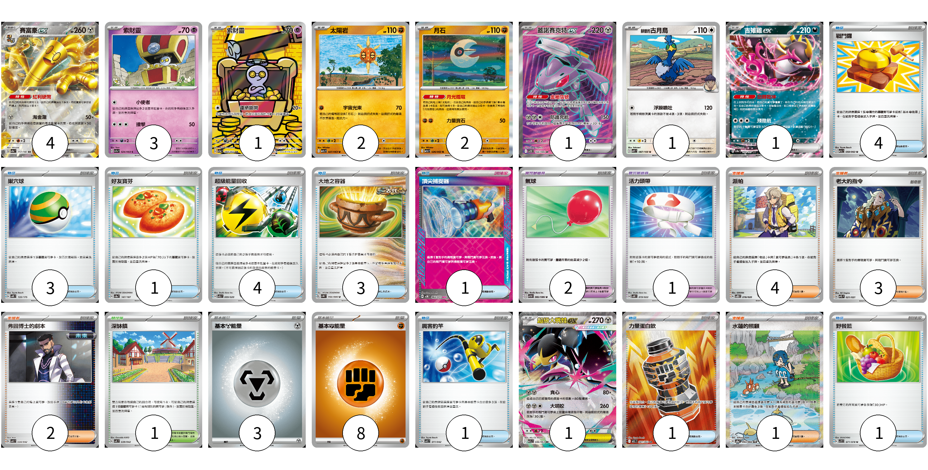 牌組構築方案 以此牌組為基礎新構築牌組 顯示卡面 顯示列表 寶可夢卡(16) 4 3 1 2 2 1 1 1 1 寶可夢道具(3) 2 1 物品卡(19) 4 3 1 4 3 1 1 1 1 支援者卡(10) 4 3 2 1 競技場卡(1) 1 能量卡(11) 3 8 寶可夢卡(16) 卡牌名稱 張數 卡牌名稱 張數 賽富豪ex SV8a 117/187 04 索財靈 SV7a 024/064 03 索財靈 SV3a 068/062 01 太陽岩 M1L 027/063 02 月石 M1L 026/063 02 蓋諾賽克特ex SV11B 164/086 01 赫普的古月鳥 SV9 087/100 01 吉雉雞ex SV8a 104/187 01 超級大嘴娃ex M1L 046/063 01 寶可夢道具(3) 卡牌名稱 張數 卡牌名稱 張數 氣球 SV11B 082/086 02 活力頭帶 SVAW 019/023 01 物品卡(19) 卡牌名稱 張數 卡牌名稱 張數 戰鬥鑼 M1L 059/063 04 巢穴球 SVM 133/175 03 好友寶芬 SV8a 147/187 01 超級能量回收 SVEL 009/020 04 大地之容器 SV4K 060/066 03 頂尖捕捉器 SV5M 062/071 01 厲害釣竿 SVK 011/042 01 力量蛋白飲 M1L 081/063 01 野餐籃 SV1V 071/078 01 支援者卡(10) 卡牌名稱 張數 卡牌名稱 張數 派帕 SVOD 018/020 04 老大的指令 SVTL 021/021 03 弗圖博士的劇本 SVK 034/042 02 水蓮的照顧 SV5a 093/066 01 競技場卡(1) 卡牌名稱 張數 卡牌名稱 張數 深缽鎮 SVK 039/042 01 能量卡(11) 卡牌名稱 張數 卡牌名稱 張數 基本【鋼】能量 M-P MET 03 基本【鬥】能量 M-P FIG 08 以此牌組為基礎新構築牌組 牌組編碼 DbqIUm-UwnVPi-koYgOh copy 列印牌組單 牌組編碼已複製 分享至SNS