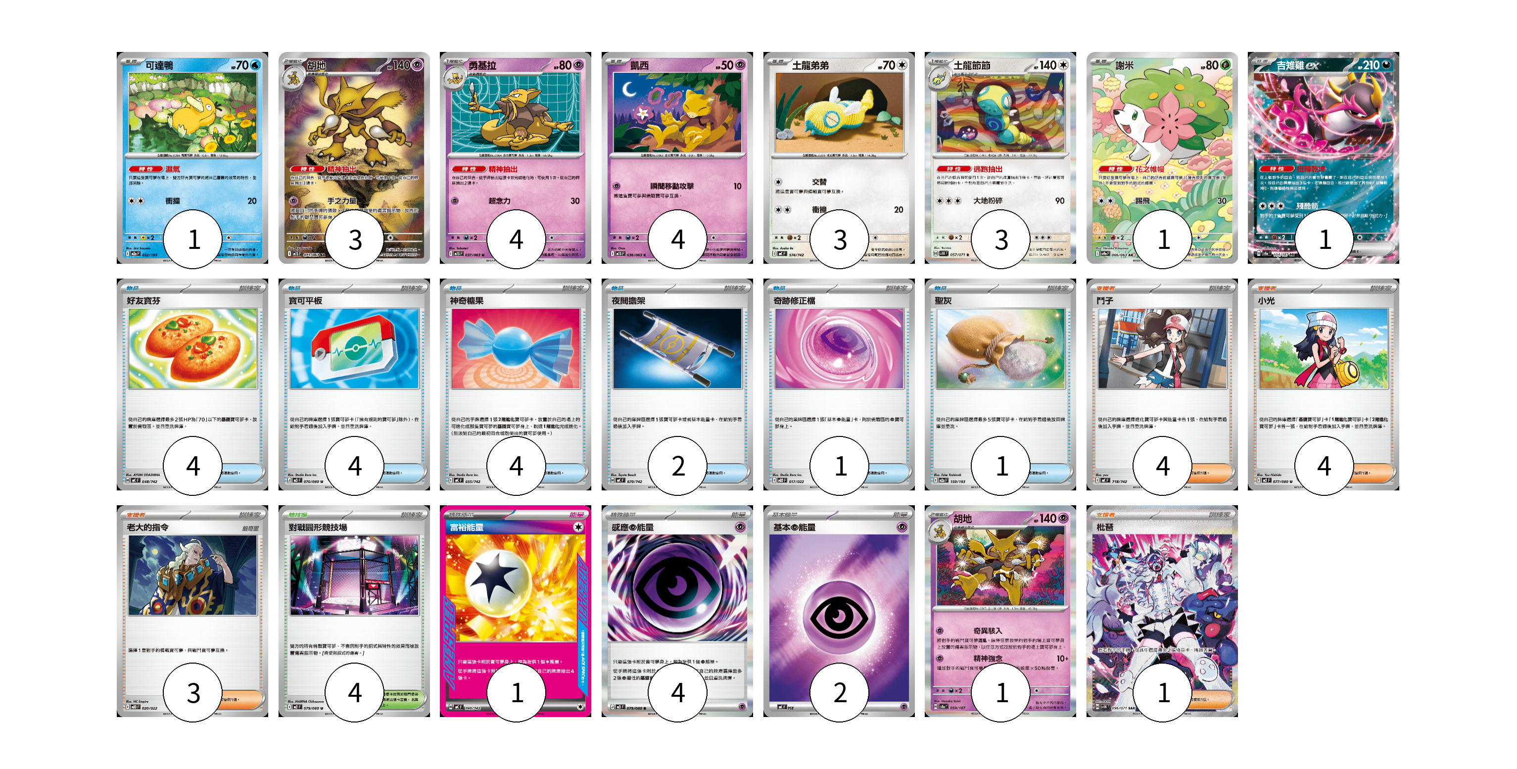 牌組構築方案 以此牌組為基礎新構築牌組 顯示卡面 顯示列表 寶可夢卡(21) 1 3 4 4 3 3 1 1 1 物品卡(16) 4 4 4 2 1 1 支援者卡(12) 4 4 3 1 競技場卡(4) 4 能量卡(7) 1 4 2 寶可夢卡(21) 卡牌名稱 張數 卡牌名稱 張數 可達鴨 M2a 032/193 01 胡地 M1S 071/063 03 勇基拉 M1S 037/063 04 凱西 M1S 036/063 04 土龍弟弟 MC 574/742 03 土龍節節 SV5K 057/071 03 謝米 SV9a 066/063 01 吉雉雞ex SV8a 104/187 01 胡地 SV8a 059/187 01 物品卡(16) 卡牌名稱 張數 卡牌名稱 張數 好友寶芬 MC 648/742 04 寶可平板 M3 070/080 04 神奇糖果 MC 655/742 04 夜間擔架 MC 670/742 02 奇跡修正檔 MBD 017/022 01 聖灰 M2a 150/193 01 支援者卡(12) 卡牌名稱 張數 卡牌名稱 張數 鬥子 MC 718/742 04 小光 M2 077/080 04 老大的指令 MBD 020/022 03 枇琶 SV5K 096/071 01 競技場卡(4) 卡牌名稱 張數 卡牌名稱 張數 對戰圓形競技場 M2 079/080 04 能量卡(7) 卡牌名稱 張數 卡牌名稱 張數 富裕能量 MC 740/742 01 感應【超】能量 M3 079/080 04 基本【超】能量 MC PSY 02 以此牌組為基礎新構築牌組 牌組編碼 DcmBEH-WLBhVP-YPVTCT copy 列印牌組單 牌組編碼已複製 分享至SNS
