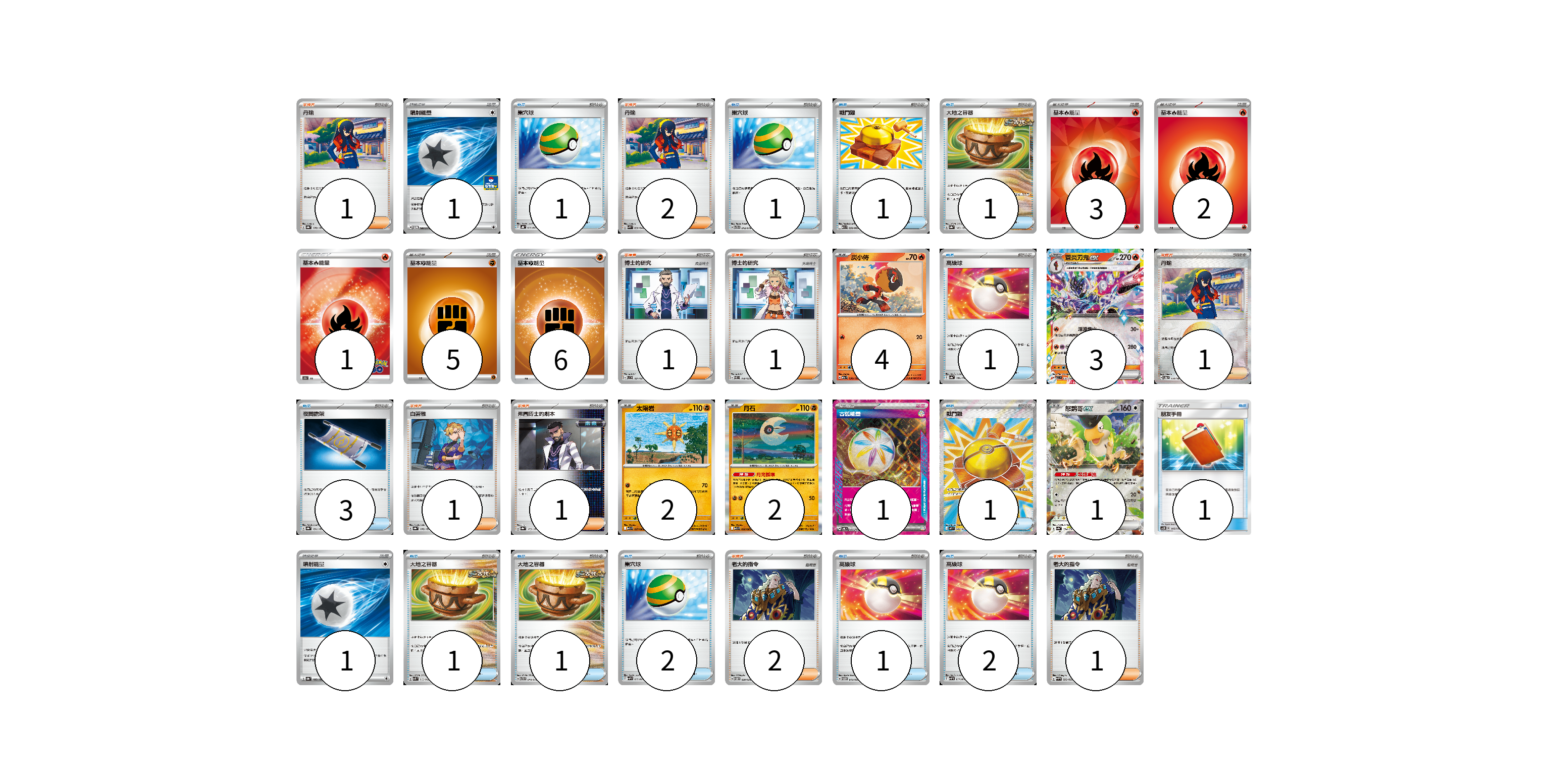 牌組構築方案 以此牌組為基礎新構築牌組 顯示卡面 顯示列表 寶可夢卡(12) 4 3 2 2 1 物品卡(17) 1 1 1 1 1 3 1 1 1 1 2 1 2 支援者卡(11) 1 2 1 1 1 1 1 2 1 能量卡(20) 1 3 2 1 5 6 1 1 寶可夢卡(12) 卡牌名稱 張數 卡牌名稱 張數 炭小侍 M2a 030/193 04 蒼炎刃鬼ex M2a 031/193 03 太陽岩 M1L 027/063 02 月石 M1L 026/063 02 怒鸚哥ex SV4a 154/190 01 物品卡(17) 卡牌名稱 張數 卡牌名稱 張數 巢穴球 SVHK 012/022 01 巢穴球 SVTG 012/019 01 戰鬥鑼 M1L 059/063 01 大地之容器 SV8a 143/187 01 高級球 SV4a 161/190 01 夜間擔架 SV8a 151/187 03 戰鬥鑼 M1L 082/063 01 朋友手冊 AC2D 145/176 01 大地之容器 SVK 012/042 01 大地之容器 SVTG 010/019 01 巢穴球 SVHM 012/022 02 高級球 SVTM 012/022 01 高級球 SVHM 013/022 02 支援者卡(11) 卡牌名稱 張數 卡牌名稱 張數 丹瑜 SV8a 170/187 01 丹瑜 SVK 030/042 02 博士的研究(弗圖博士) SVC 021/021 01 博士的研究 SVEL 018/020 01 丹瑜 SV8a 170/187 01 白蕾雅 SV8a 176/187 01 弗圖博士的劇本 SV8a 175/187 01 老大的指令 SVTM 020/022 02 老大的指令 SVHM 022/022 01 能量卡(20) 卡牌名稱 張數 卡牌名稱 張數 噴射能量 SV-P 180/SV-P 01 基本【火】能量 SVQL FIR 03 基本【火】能量 SVTL FIR 02 基本火能量 S10b FIR 01 基本鬥能量 sv-p FIG 05 基本鬥能量 SLL FIG 06 古舊能量 SV6 101/101 01 噴射能量 SV8a 185/187 01 以此牌組為基礎新構築牌組 牌組編碼 DfpCkw-SMrHWH-QLzIEa copy 列印牌組單 牌組編碼已複製 分享至SNS
