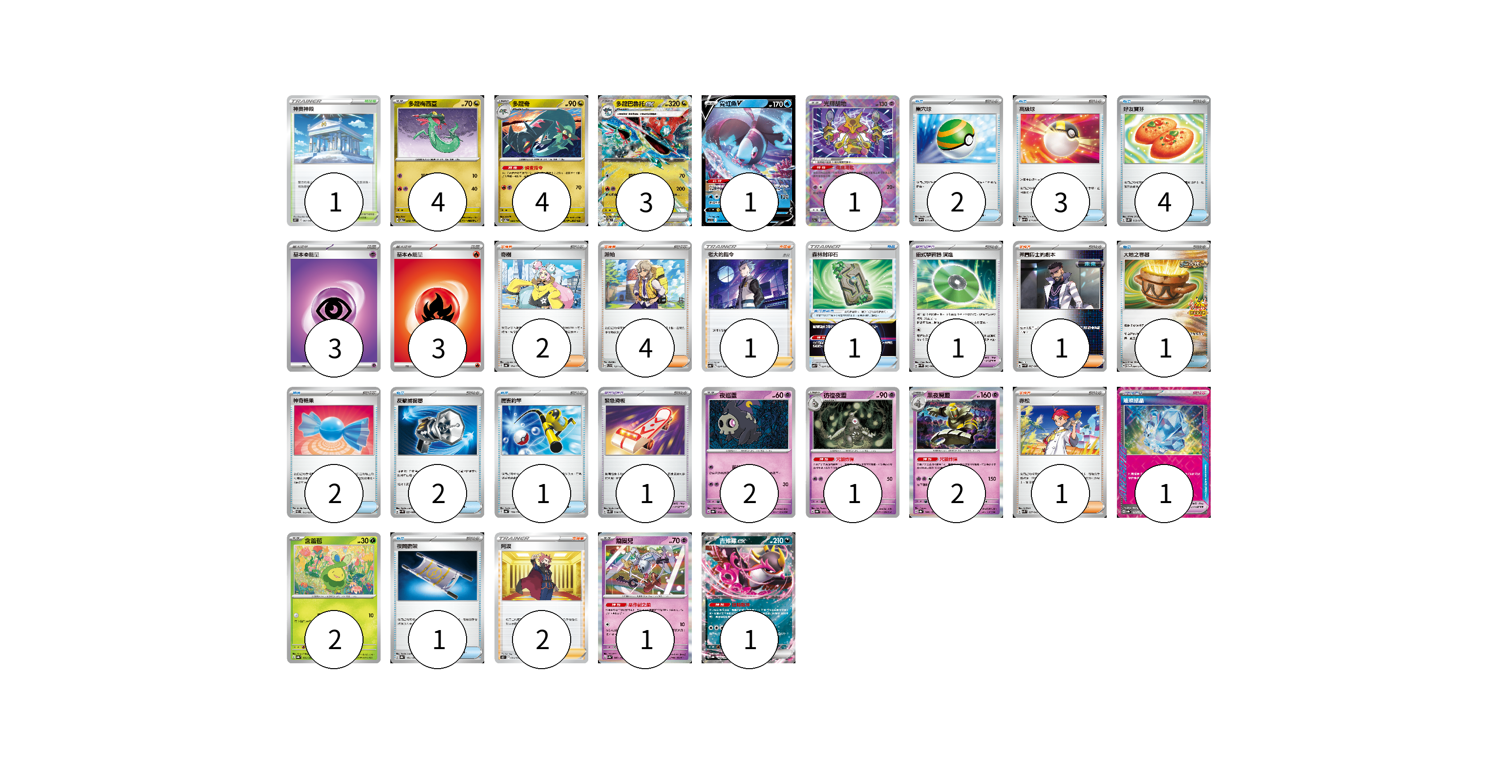 牌組構築方案 以此牌組為基礎新構築牌組 顯示卡面 顯示列表 寶可夢卡(22) 4 4 3 1 1 2 1 2 2 1 1 寶可夢道具(3) 1 1 1 物品卡(17) 2 3 4 1 1 2 2 1 1 支援者卡(11) 2 4 1 1 1 2 競技場卡(1) 1 能量卡(6) 3 3 寶可夢卡(22) 卡牌名稱 張數 卡牌名稱 張數 多龍梅西亞 SV6 079/101 04 多龍奇 SV6 080/101 04 多龍巴魯托ex SV6 081/101 03 霓虹魚V SVHK 004/022 01 光輝胡地 S11a 031/068 01 夜巡靈 SV8a 064/187 02 彷徨夜靈 SV8a 065/187 01 黑夜魔靈 SV8a 066/187 02 含羞苞 SV8a 001/187 02 鑰圈兒 SV4a 087/190 01 吉雉雞ex SV8a 104/187 01 寶可夢道具(3) 卡牌名稱 張數 卡牌名稱 張數 招式學習器 演進 SV4M 063/066 01 緊急滑板 SV5K 064/071 01 璀璨結晶 SV8a 152/187 01 物品卡(17) 卡牌名稱 張數 卡牌名稱 張數 巢穴球 SVHM 012/022 02 高級球 SVHM 013/022 03 好友寶芬 SV5K 063/071 04 森林封印石 SVF 024/038 01 大地之容器 SV-P 084/SV-P 01 神奇糖果 SVEL 013/020 02 反擊捕捉器 SV4M 059/066 02 厲害釣竿 SV4a 158/190 01 夜間擔架 SV8a 151/187 01 支援者卡(11) 卡牌名稱 張數 卡牌名稱 張數 奇樹 SV4a 174/190 02 派帕 SVD 137/139 04 老大的指令(赤日) SVB 024/028 01 弗圖博士的劇本 SV4M 065/066 01 赤松 SVK 027/042 01 阿渡 S12 096/098 02 競技場卡(1) 卡牌名稱 張數 卡牌名稱 張數 神奧神殿 S10P 067/067 01 能量卡(6) 卡牌名稱 張數 卡牌名稱 張數 基本【超】能量 SVHM PSY 03 基本【火】能量 SVHK FIR 03 以此牌組為基礎新構築牌組 牌組編碼 DhHeYE-DUZAjR-TDBRor copy 列印牌組單 牌組編碼已複製 分享至SNS