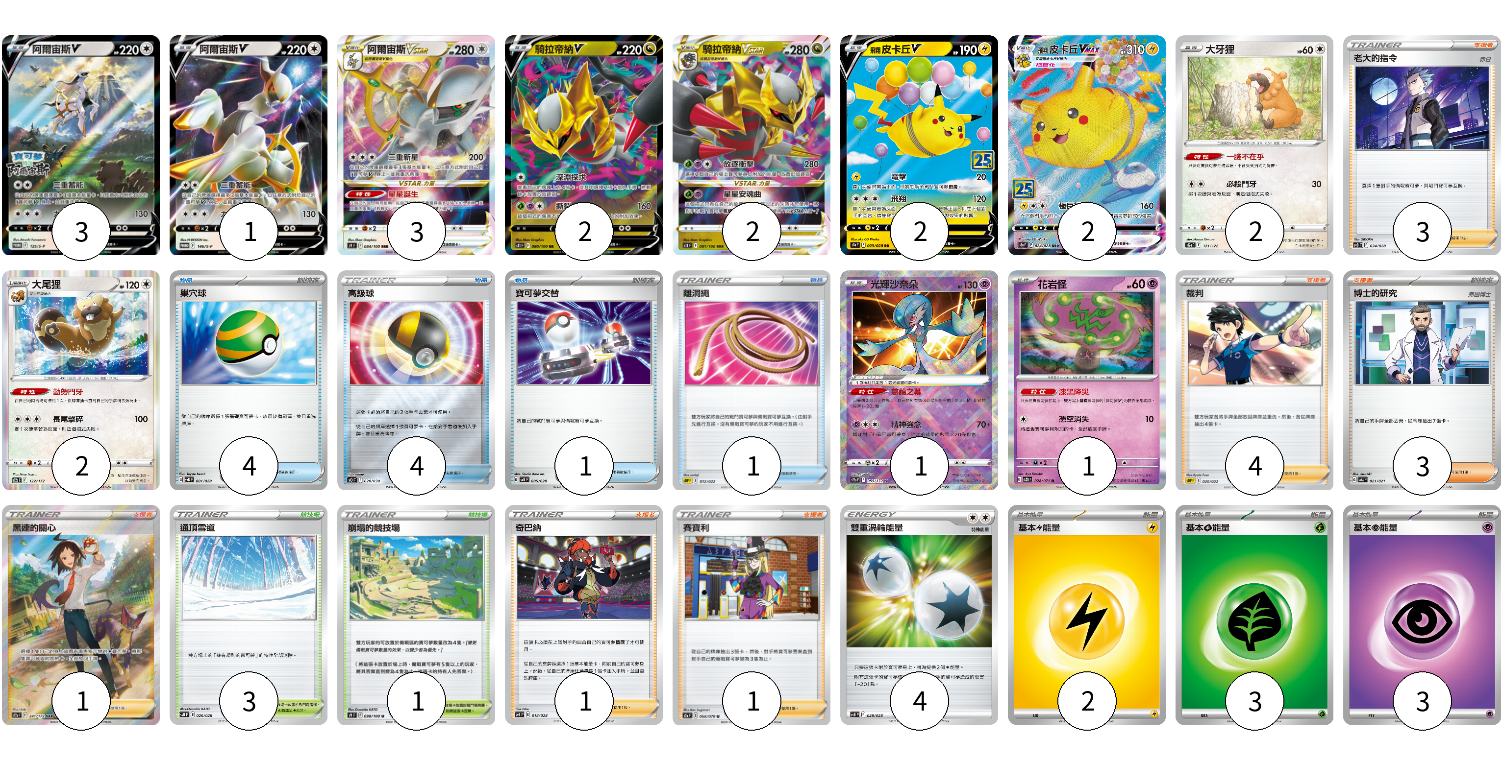 牌組構築方案 以此牌組為基礎新構築牌組 顯示卡面 顯示列表 寶可夢卡(21) 3 1 3 2 2 2 2 2 2 1 1 物品卡(10) 4 4 1 1 支援者卡(13) 3 4 3 1 1 1 競技場卡(4) 3 1 能量卡(12) 4 2 3 3 寶可夢卡(21) 卡牌名稱 張數 卡牌名稱 張數 阿爾宙斯V S-P 125/S-P 03 阿爾宙斯V S-P 146/S-P 01 阿爾宙斯VSTAR S9 084/100 03 騎拉帝納V S11 080/100 02 騎拉帝納VSTAR S11 081/100 02 飛翔皮卡丘V S8a 023/028 02 飛翔皮卡丘VMAX S8a 024/028 02 大牙狸 S12a 121/172 02 大尾狸 S12a 122/172 02 光輝沙奈朵 S12a 055/172 01 花岩怪 SV2D 028/071 01 物品卡(10) 卡牌名稱 張數 卡牌名稱 張數 巢穴球 SVB 001/028 04 高級球 SO 020/030 04 寶可夢交替 SVB 005/028 01 離洞繩 SDP 012/022 01 支援者卡(13) 卡牌名稱 張數 卡牌名稱 張數 老大的指令(赤日) SVB 024/028 03 裁判 SDP 020/022 04 博士的研究(弗圖博士) SVAL 021/021 03 黑連的關心 S12a 241/172 01 奇巴納 SVB 018/028 01 賽寶利 S5a 068/070 01 競技場卡(4) 卡牌名稱 張數 卡牌名稱 張數 通頂雪道 SVB 026/028 03 崩塌的競技場 S9 098/100 01 能量卡(12) 卡牌名稱 張數 卡牌名稱 張數 雙重渦輪能量 SVB 028/028 04 基本【雷】能量 SVC LIG 02 基本【草】能量 SVAM GRA 03 基本【超】能量 SVAW PSY 03 以此牌組為基礎新構築牌組 牌組編碼 DibZfC-uMboHQ-oyguhb copy 列印牌組單 牌組編碼已複製 分享至SNS