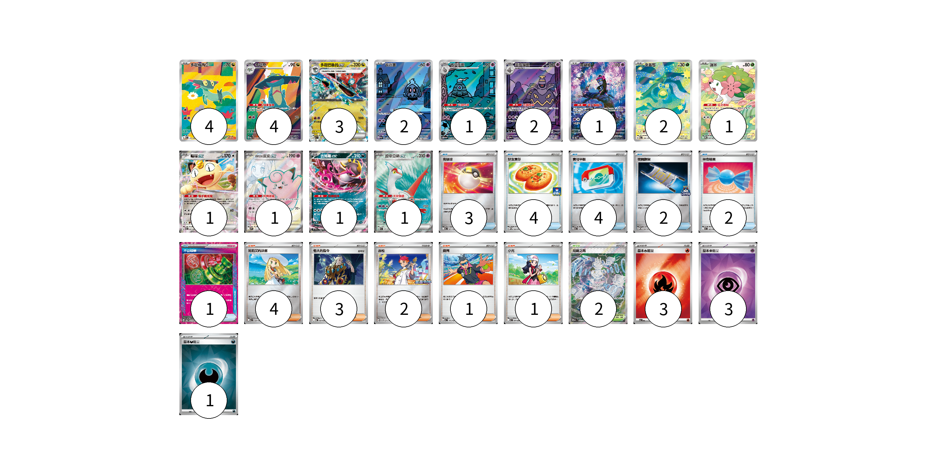 牌組構築方案 以此牌組為基礎新構築牌組 顯示卡面 顯示列表 寶可夢卡(24) 4 4 3 2 1 2 1 2 1 1 1 1 1 物品卡(16) 3 4 4 2 2 1 支援者卡(11) 4 3 2 1 1 競技場卡(2) 2 能量卡(7) 3 3 1 寶可夢卡(24) 卡牌名稱 張數 卡牌名稱 張數 多龍梅西亞 M2a 211/193 04 多龍奇 M2a 212/193 04 多龍巴魯托ex M2a 134/193 03 夜巡靈 SV6a 068/064 02 彷徨夜靈 SV6a 069/064 01 黑夜魔靈 SV6a 070/064 02 願增猿 SV6 107/101 01 含羞苞 M2a 196/193 02 謝米 SV9a 066/063 01 喵喵ex M3 061/080 01 莉莉艾的皮皮ex SV9 115/100 01 吉雉雞ex M2a 114/193 01 拉帝亞斯ex SV7a 078/064 01 物品卡(16) 卡牌名稱 張數 卡牌名稱 張數 高級球 MC 651/742 03 好友寶芬 SV-P 212/SV-P 04 寶可平板 MC 662/742 04 夜間擔架 SV-P 204/SV-P 02 神奇糖果 MC 655/742 02 不公印章 SV5a 053/066 01 支援者卡(11) 卡牌名稱 張數 卡牌名稱 張數 莉莉艾的決意 MC 729/742 04 老大的指令 MBG 021/022 03 赤松 SV-P 150/SV-P 02 裁判 MC 711/742 01 小光 M2 077/080 01 競技場卡(2) 卡牌名稱 張數 卡牌名稱 張數 阻礙之塔 M2a 222/193 02 能量卡(7) 卡牌名稱 張數 卡牌名稱 張數 基本【火】能量 MC FIR 03 基本【超】能量 SVOD PSY 03 基本【惡】能量 SVOM DAR 01 以此牌組為基礎新構築牌組 牌組編碼 DitQGx-QKkStP-lUoiTa copy 列印牌組單 牌組編碼已複製 分享至SNS