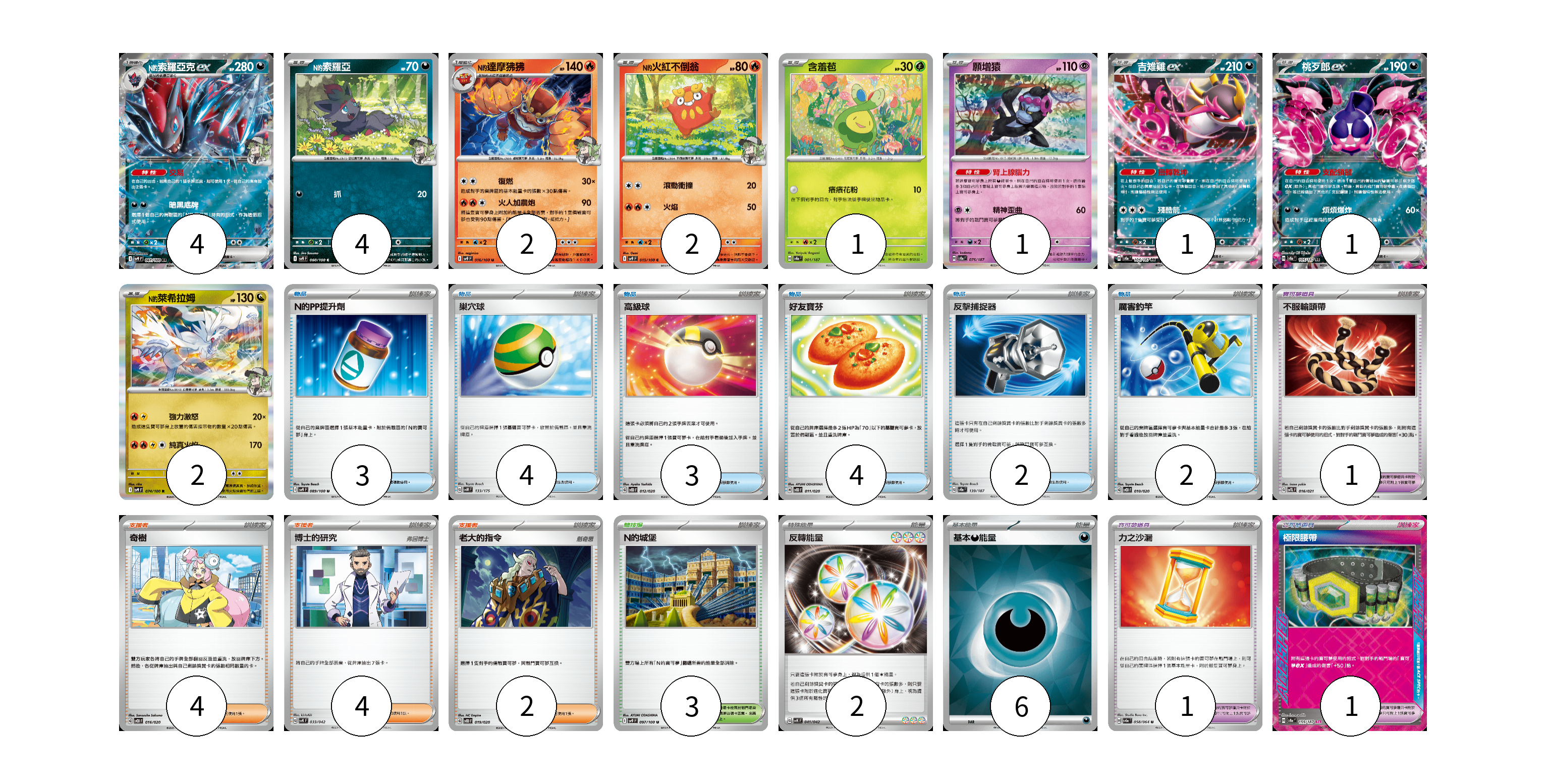 牌組構築方案 以此牌組為基礎新構築牌組 顯示卡面 顯示列表 寶可夢卡(18) 4 4 2 2 1 1 1 1 2 寶可夢道具(3) 1 1 1 物品卡(18) 3 4 3 4 2 2 支援者卡(10) 4 4 2 競技場卡(3) 3 能量卡(8) 2 6 寶可夢卡(18) 卡牌名稱 張數 卡牌名稱 張數 N的索羅亞克ex SV9 061/100 04 N的索羅亞 SV9 060/100 04 N的達摩狒狒 SV9 016/100 02 N的火紅不倒翁 SV9 015/100 02 含羞苞 SV8a 001/187 01 願增猿 SV8a 075/187 01 吉雉雞ex SV8a 104/187 01 桃歹郎ex SV8a 105/187 01 N的萊希拉姆 SV9 074/100 02 寶可夢道具(3) 卡牌名稱 張數 卡牌名稱 張數 不服輸頭帶 SVTL 016/021 01 力之沙漏 SV6a 058/064 01 極限腰帶 SV8a 159/187 01 物品卡(18) 卡牌名稱 張數 卡牌名稱 張數 N的PP提升劑 SV9 089/100 03 巢穴球 SVM 133/175 04 高級球 SVOD 012/020 03 好友寶芬 SVOD 011/020 04 反擊捕捉器 SV8a 139/187 02 厲害釣竿 SVOD 010/020 02 支援者卡(10) 卡牌名稱 張數 卡牌名稱 張數 奇樹 SVOD 016/020 04 博士的研究 SVK 033/042 04 老大的指令 SVOD 019/020 02 競技場卡(3) 卡牌名稱 張數 卡牌名稱 張數 N的城堡 SV9 097/100 03 能量卡(8) 卡牌名稱 張數 卡牌名稱 張數 反轉能量 SVK 041/042 02 基本【惡】能量 SVOM DAR 06 以此牌組為基礎新構築牌組 牌組編碼 DjXzlq-ICqpHt-LsKAeL copy 列印牌組單 牌組編碼已複製 分享至SNS