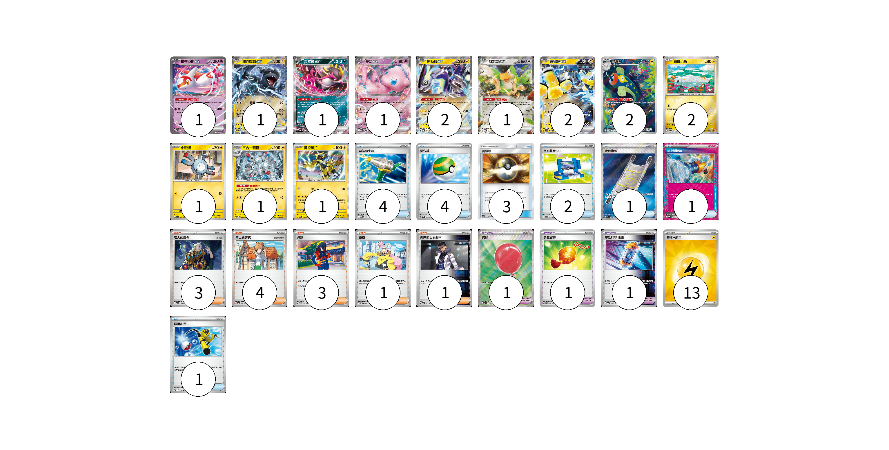 牌組構築方案 以此牌組為基礎新構築牌組 顯示卡面 顯示列表 寶可夢卡(16) 1 1 1 1 2 1 2 2 2 1 1 1 寶可夢道具(3) 1 1 1 物品卡(16) 4 4 3 2 1 1 1 支援者卡(12) 3 4 3 1 1 能量卡(13) 13 寶可夢卡(16) 卡牌名稱 張數 卡牌名稱 張數 拉帝亞斯ex MBD 003/022 01 捷克羅姆ex SV11B 037/086 01 吉雉雞ex SV8a 104/187 01 夢幻ex SV4a 076/190 01 密勒頓ex SV4a 071/190 02 怒鸚哥ex SV4a 154/190 01 鐵臂膀ex SV4M 027/066 02 麻麻鰻 SV11B 118/086 02 麻麻小魚 SV11B 033/086 02 小磁怪 M1S 027/063 01 三合一磁怪 SV8 035/106 01 捷拉奧拉 SV9a 040/063 01 寶可夢道具(3) 卡牌名稱 張數 卡牌名稱 張數 氣球 M1L 084/063 01 勇氣護符 SVTR 015/021 01 驅勁能量 未來 SV8a 158/187 01 物品卡(16) 卡牌名稱 張數 卡牌名稱 張數 電氣發生器 SV4a 156/190 04 巢穴球 SVAW 014/023 04 高級球 AS6D 147/168 03 寶可裝置3.0 SVB 004/028 02 夜間擔架 M1L 083/063 01 頂尖捕捉器 SV8a 148/187 01 厲害釣竿 SVOM 011/021 01 支援者卡(12) 卡牌名稱 張數 卡牌名稱 張數 老大的指令 MBG 021/022 03 博士的研究 SV11B 084/086 04 丹瑜 SVTR 016/021 03 奇樹 SVOM 018/021 01 弗圖博士的劇本 SVK 034/042 01 能量卡(13) 卡牌名稱 張數 卡牌名稱 張數 基本【雷】能量 SVQP LIG 13 以此牌組為基礎新構築牌組 牌組編碼 DrCvSw-KVZyfc-OIjkYw copy 列印牌組單 牌組編碼已複製 分享至SNS