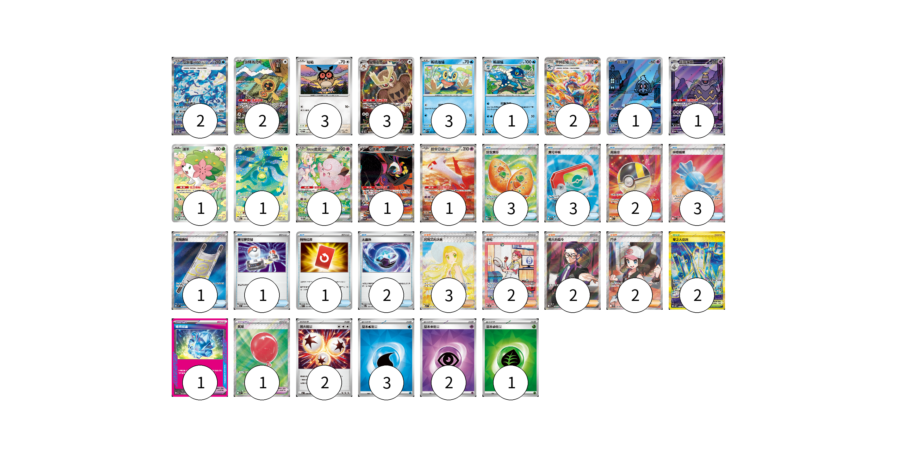 牌組構築方案 以此牌組為基礎新構築牌組 顯示卡面 顯示列表 寶可夢卡(23) 2 2 3 3 3 1 2 1 1 1 1 1 1 1 寶可夢道具(2) 1 1 物品卡(16) 3 3 2 3 1 1 1 2 支援者卡(9) 3 2 2 2 競技場卡(2) 2 能量卡(8) 2 3 2 1 寶可夢卡(23) 卡牌名稱 張數 卡牌名稱 張數 厄鬼椪 水井面具ex SV6 127/101 02 旋轉洛托姆 M2a 213/193 02 咕咕 SV7 076/102 03 貓頭夜鷹 SV7 114/102 03 呱呱泡蛙 M4 020/083 03 呱頭蛙 M4 021/083 01 甲賀忍蛙ex SV5a 090/066 02 夜巡靈 SV6a 068/064 01 黑夜魔靈 SV6a 070/064 01 謝米 SV9a 066/063 01 含羞苞 M2a 196/193 01 莉莉艾的皮皮ex SV9 126/100 01 吉雉雞ex SV6a 089/064 01 拉帝亞斯ex SV7a 087/064 01 寶可夢道具(2) 卡牌名稱 張數 卡牌名稱 張數 璀璨結晶 MC 680/742 01 氣球 M1L 084/063 01 物品卡(16) 卡牌名稱 張數 卡牌名稱 張數 好友寶芬 M1S 081/063 03 寶可平板 M3 103/080 03 高級球 M2a 216/193 02 神奇糖果 M1S 082/063 03 夜間擔架 M1L 083/063 01 寶可夢交替 MJ 019/022 01 特殊紅牌 M4 072/083 01 太晶珠 M2a 152/193 02 支援者卡(9) 卡牌名稱 張數 卡牌名稱 張數 莉莉艾的決意 M1L 091/063 03 赤松 SV8a 227/187 02 老大的指令(烏羽) MC 760/742 02 鬥子 SV11W 166/086 02 競技場卡(2) 卡牌名稱 張數 卡牌名稱 張數 零之大空洞 SV7 135/102 02 能量卡(8) 卡牌名稱 張數 卡牌名稱 張數 燃火能量 MC 736/742 02 基本【水】能量 SVM WAT 03 基本【超】能量 SVM PSY 02 基本【草】能量 SVM GRA 01 以此牌組為基礎新構築牌組 牌組編碼 DsauhH-oDMSfe-nxbSmc copy 列印牌組單 牌組編碼已複製 分享至SNS