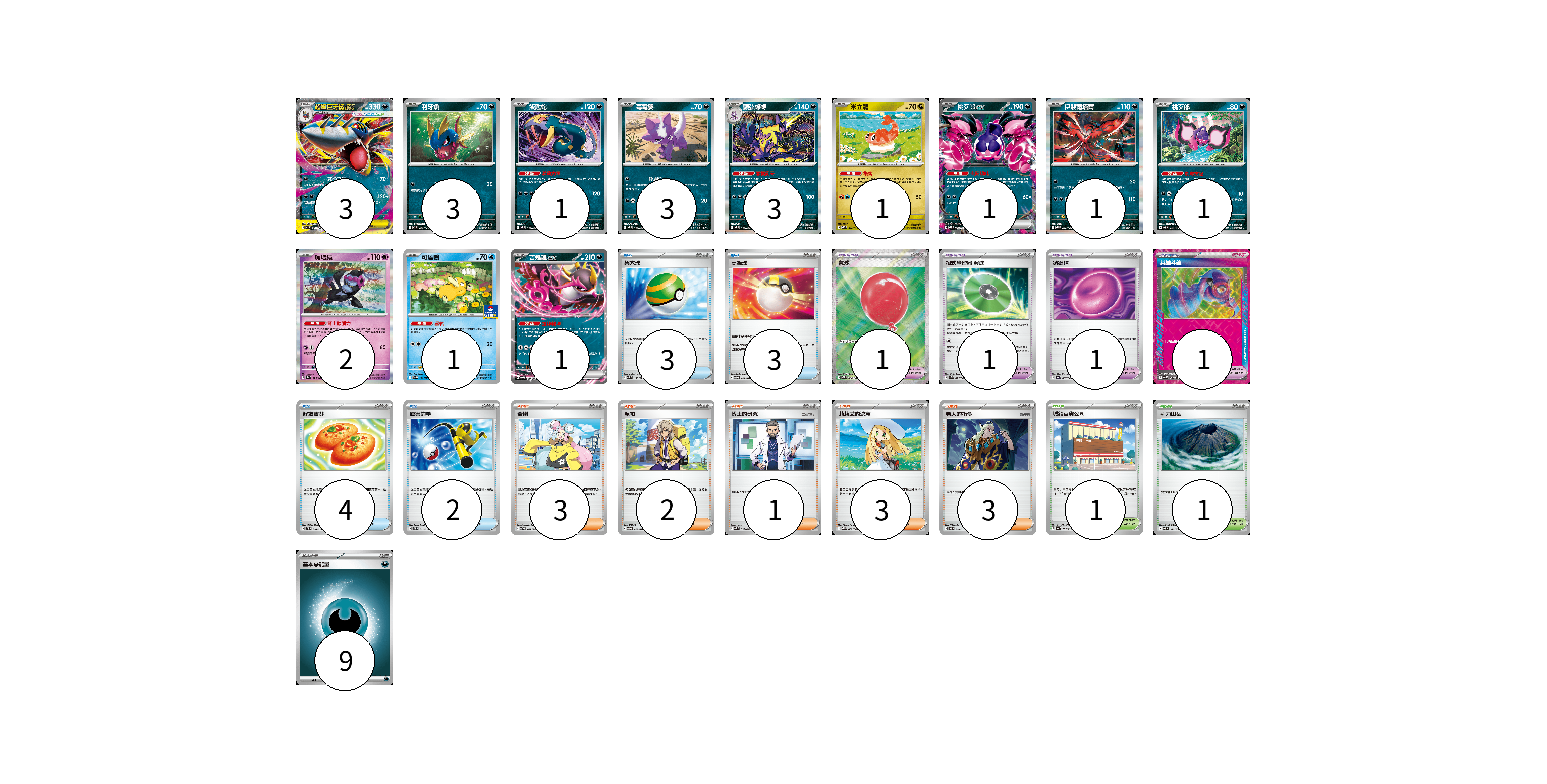 牌組構築方案 以此牌組為基礎新構築牌組 顯示卡面 顯示列表 寶可夢卡(21) 3 3 1 3 3 1 1 1 1 2 1 1 寶可夢道具(4) 1 1 1 1 物品卡(12) 3 3 4 2 支援者卡(12) 3 2 1 3 3 競技場卡(2) 1 1 能量卡(9) 9 寶可夢卡(21) 卡牌名稱 張數 卡牌名稱 張數 超級巨牙鯊ex M2 051/080 03 利牙魚 M2 050/080 03 飯匙蛇 M2 052/080 01 毒電嬰 M2 056/080 03 顫弦蠑螈 M2 057/080 03 米立龍 MBD 010/022 01 桃歹郎ex MBG 009/022 01 伊裴爾塔爾 M1L 040/063 01 桃歹郎 SV8 075/106 01 願增猿 SV8a 075/187 02 可達鴨 SV-P 220/SV-P 01 吉雉雞ex SVOM 009/021 01 寶可夢道具(4) 卡牌名稱 張數 卡牌名稱 張數 氣球 M1L 084/063 01 招式學習器 演進 SVK 025/042 01 鎖鏈糬 SV6a 057/064 01 英雄斗篷 SV5M 064/071 01 物品卡(12) 卡牌名稱 張數 卡牌名稱 張數 巢穴球 SVM 133/175 03 高級球 SVOD 012/020 03 好友寶芬 SVTL 010/021 04 厲害釣竿 SVTR 012/021 02 支援者卡(12) 卡牌名稱 張數 卡牌名稱 張數 奇樹 SVTG 017/019 03 派帕 SVOD 018/020 02 博士的研究 SVK 033/042 01 莉莉艾的決意 M1L 062/063 03 老大的指令 SVOD 019/020 03 競技場卡(2) 卡牌名稱 張數 卡牌名稱 張數 城鎮百貨公司 SV4a 183/190 01 引力山岳 SV8 106/106 01 能量卡(9) 卡牌名稱 張數 卡牌名稱 張數 基本【惡】能量 MBG DAR 09 以此牌組為基礎新構築牌組 牌組編碼 DzLCQZ-lJIQHw-gIxcOY copy 列印牌組單 牌組編碼已複製 分享至SNS