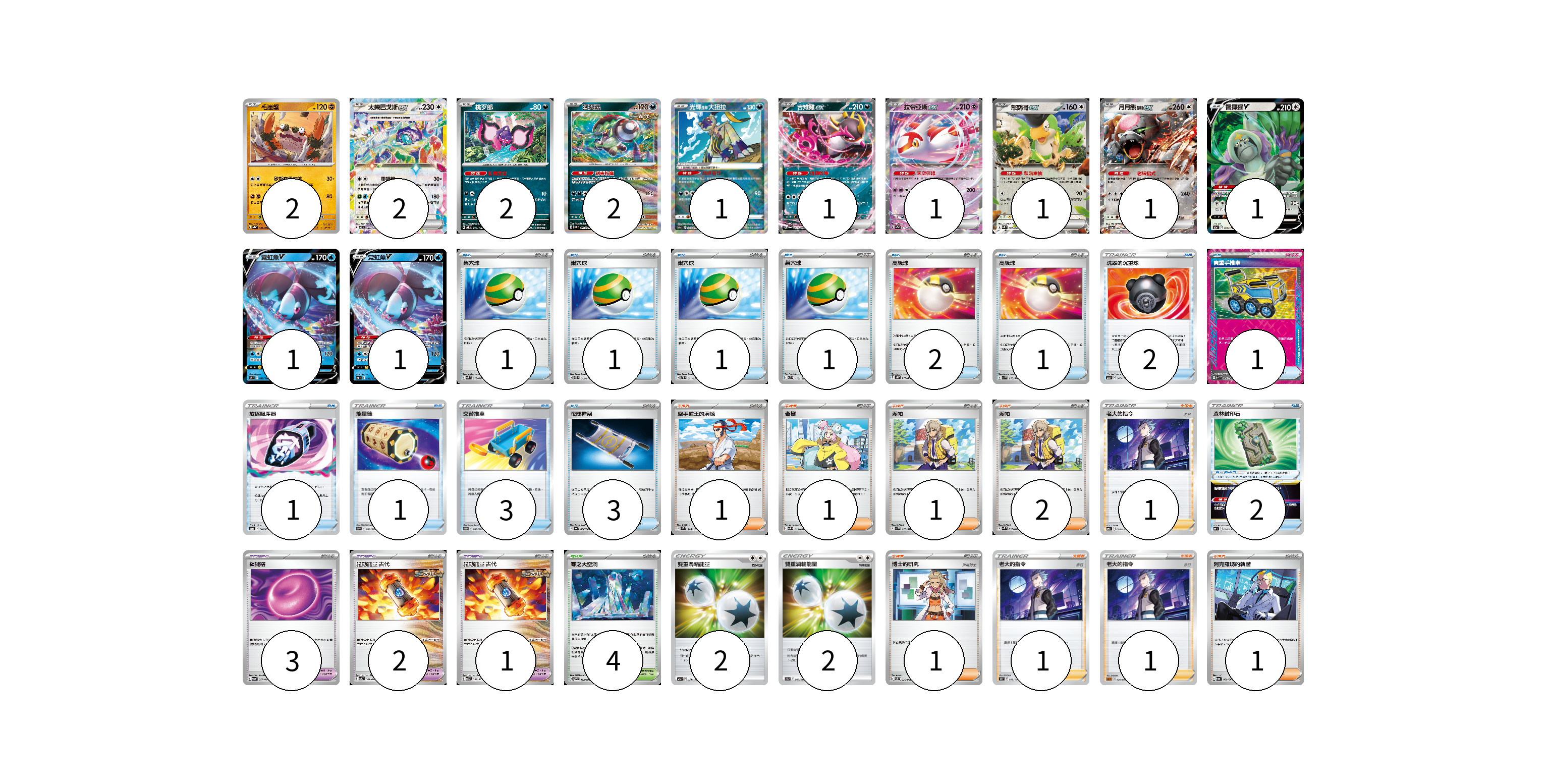 牌組構築方案 以此牌組為基礎新構築牌組 顯示卡面 顯示列表 寶可夢卡(16) 2 2 2 2 1 1 1 1 1 1 1 1 寶可夢道具(6) 3 2 1 物品卡(20) 1 1 1 1 2 1 2 1 1 1 3 3 2 支援者卡(10) 1 1 1 2 1 1 1 1 1 競技場卡(4) 4 能量卡(4) 2 2 寶可夢卡(16) 卡牌名稱 張數 卡牌名稱 張數 毛崖蟹 SV3a 031/062 02 太樂巴戈斯ex SV7 088/102 02 桃歹郎 SV8 075/106 02 猛惡菇 SV4K 053/066 02 光輝洗翠 大狃拉 S10a 046/071 01 吉雉雞ex SV6a 038/064 01 拉帝亞斯ex SV7a 019/064 01 怒鸚哥ex SVK 006/042 01 月月熊 赫月 ex SV5a 052/066 01 智揮猩V S12a 130/172 01 霓虹魚V S9 030/100 01 霓虹魚V SVF 002/038 01 寶可夢道具(6) 卡牌名稱 張數 卡牌名稱 張數 鎖鏈糬 SV6a 057/064 03 驅勁能量 古代 SV4K 061/066 02 驅勁能量 古代 SV5K 065/071 01 物品卡(20) 卡牌名稱 張數 卡牌名稱 張數 巢穴球 SVK 016/042 01 巢穴球 SVTG 012/019 01 巢穴球 SVTL 011/021 01 巢穴球 SVD 118/139 01 高級球 SVHK 013/022 02 高級球 SV1V 070/078 01 洗翠的沉重球 S12a 140/172 02 貴重手推車 SVK 020/042 01 放逐吸塵器 S12a 144/172 01 能量籤 S10P 060/067 01 交替推車 S10D 060/067 03 夜間擔架 SV6a 056/064 03 森林封印石 SVF 024/038 02 支援者卡(10) 卡牌名稱 張數 卡牌名稱 張數 空手道王的演練 SVM 148/175 01 奇樹 SVF 029/038 01 派帕 SV1V 076/078 01 派帕 SVK 035/042 02 老大的指令(赤日) SVB 024/028 01 博士的研究 SVF 030/038 01 老大的指令(赤日) SK 025/030 01 老大的指令(赤日) SLL 020/021 01 阿克羅瑪的執著 SV6a 059/064 01 競技場卡(4) 卡牌名稱 張數 卡牌名稱 張數 零之大空洞 SV7 102/102 04 能量卡(4) 卡牌名稱 張數 卡牌名稱 張數 雙重渦輪能量 S12a 171/172 02 雙重渦輪能量 S11a 067/068 02 以此牌組為基礎新構築牌組 牌組編碼 EAePRi-lWItoJ-CFtRtW copy 列印牌組單 牌組編碼已複製 分享至SNS