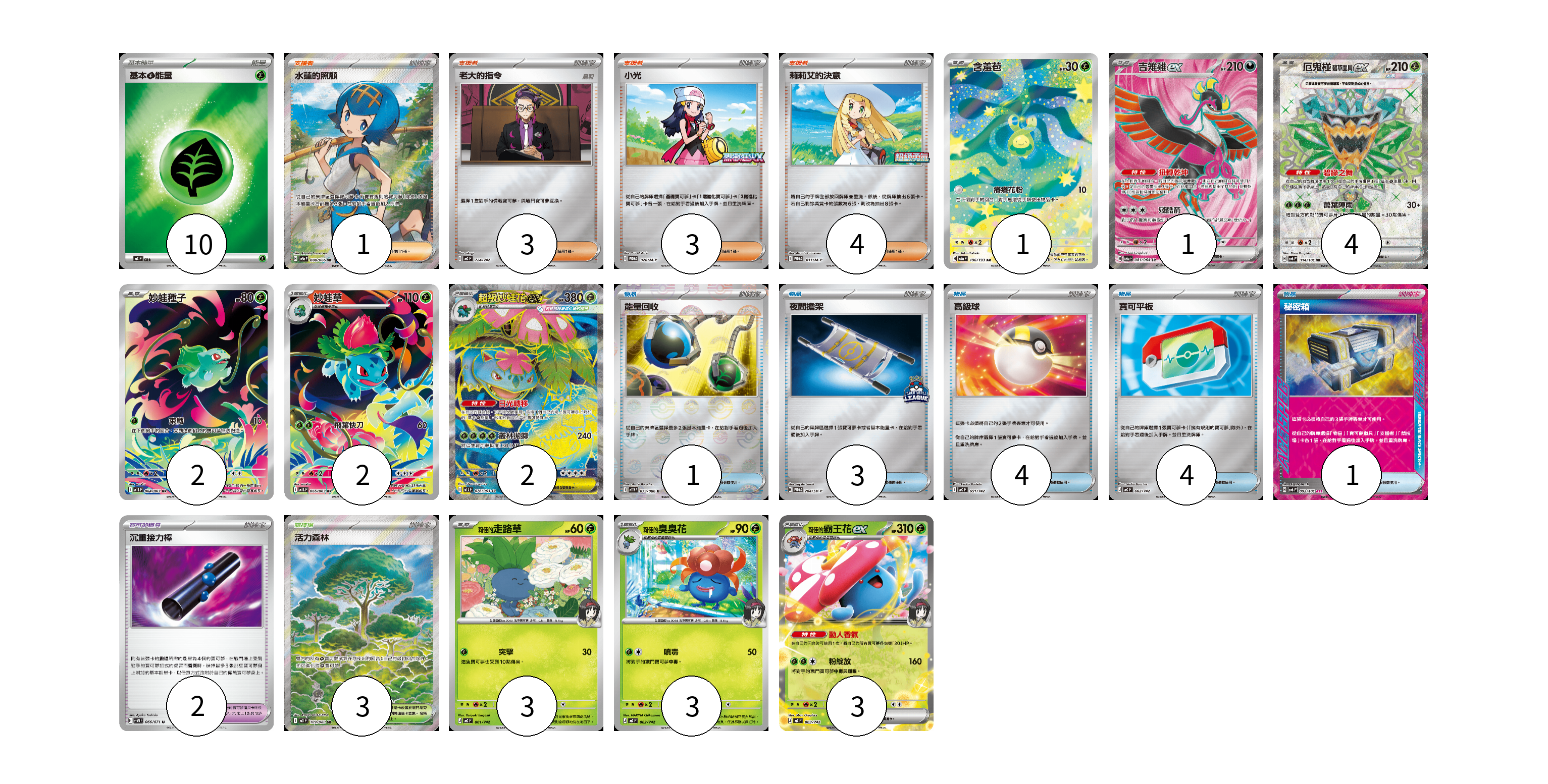 牌組構築方案 以此牌組為基礎新構築牌組 顯示卡面 顯示列表 寶可夢卡(21) 1 1 4 2 2 2 3 3 3 寶可夢道具(2) 2 物品卡(13) 1 3 4 4 1 支援者卡(11) 1 3 3 4 競技場卡(3) 3 能量卡(10) 10 寶可夢卡(21) 卡牌名稱 張數 卡牌名稱 張數 含羞苞 M2a 196/193 01 吉雉雞ex SV6a 081/064 01 厄鬼椪 碧草面具ex SV6 114/101 04 妙蛙種子 M1L 064/063 02 妙蛙草 M1L 065/063 02 超級妙蛙花ex M1L 076/063 02 莉佳的走路草 MC 001/742 03 莉佳的臭臭花 MC 002/742 03 莉佳的霸王花ex MC 003/742 03 寶可夢道具(2) 卡牌名稱 張數 卡牌名稱 張數 沉重接力棒 SV5M 066/071 02 物品卡(13) 卡牌名稱 張數 卡牌名稱 張數 能量回收 SV11W 079/086 01 夜間擔架 SV-P 204/SV-P 03 高級球 MC 651/742 04 寶可平板 MC 662/742 04 秘密箱 SV6 092/101 01 支援者卡(11) 卡牌名稱 張數 卡牌名稱 張數 水蓮的照顧 SV5a 088/066 01 老大的指令 MC 724/742 03 小光 M-P 028/M-P 03 莉莉艾的決意 M-P 011/M-P 04 競技場卡(3) 卡牌名稱 張數 卡牌名稱 張數 活力森林 M3 109/080 03 能量卡(10) 卡牌名稱 張數 卡牌名稱 張數 基本【草】能量 MC GRA 10 以此牌組為基礎新構築牌組 牌組編碼 EAjLAw-fIirsK-VVWqDr copy 列印牌組單 牌組編碼已複製 分享至SNS
