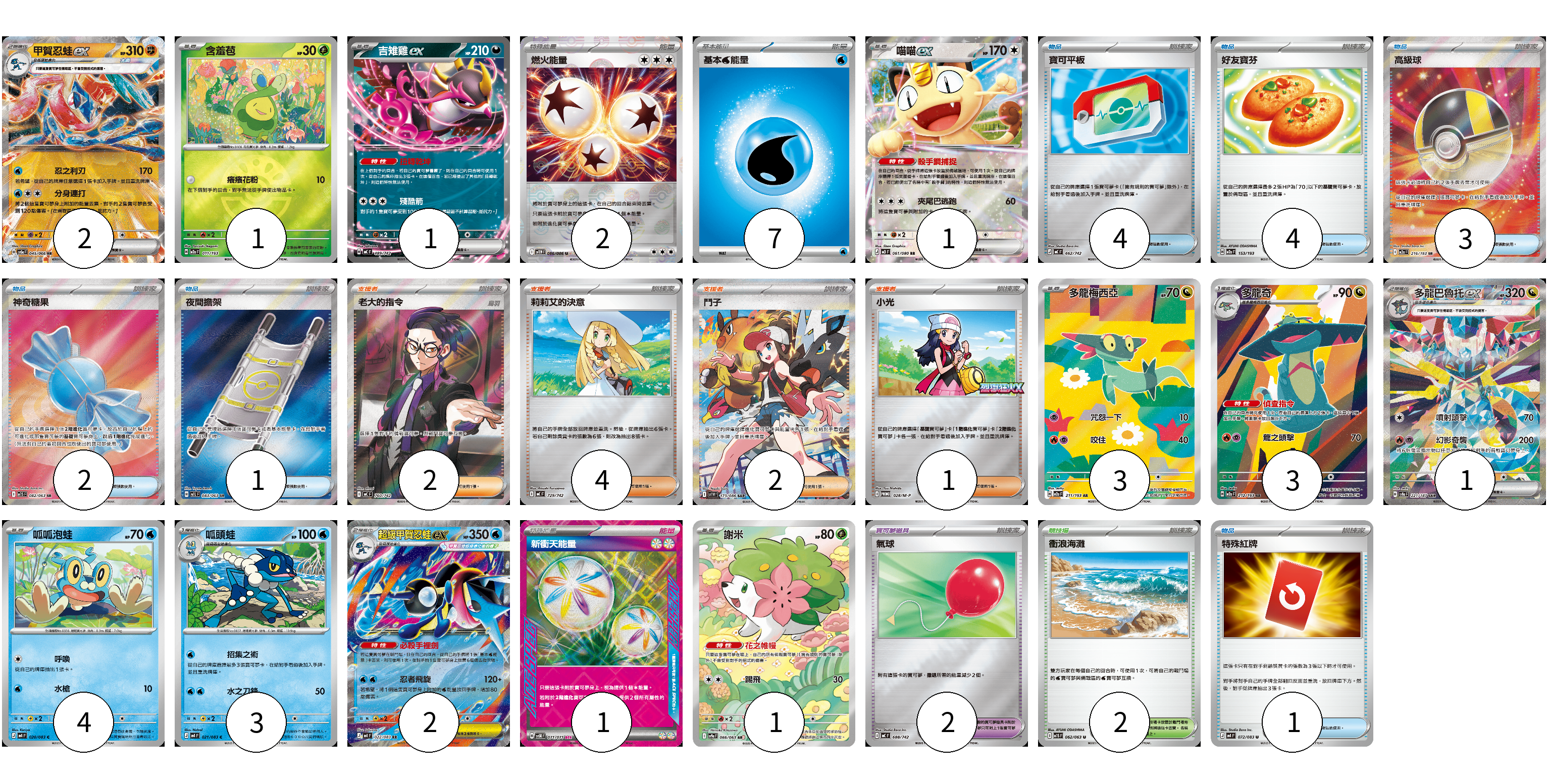 牌組構築方案 以此牌組為基礎新構築牌組 顯示卡面 顯示列表 寶可夢卡(22) 2 1 1 1 3 3 1 4 3 2 1 寶可夢道具(2) 2 物品卡(15) 4 4 3 2 1 1 支援者卡(9) 2 4 2 1 競技場卡(2) 2 能量卡(10) 2 7 1 寶可夢卡(22) 卡牌名稱 張數 卡牌名稱 張數 甲賀忍蛙ex SV5a 045/066 02 含羞苞 M2a 011/193 01 吉雉雞ex MC 489/742 01 喵喵ex M3 061/080 01 多龍梅西亞 M2a 211/193 03 多龍奇 M2a 212/193 03 多龍巴魯托ex SV8a 221/187 01 呱呱泡蛙 M4 020/083 04 呱頭蛙 M4 021/083 03 超級甲賀忍蛙ex M4 022/083 02 謝米 SV9a 066/063 01 寶可夢道具(2) 卡牌名稱 張數 卡牌名稱 張數 氣球 MC 688/742 02 物品卡(15) 卡牌名稱 張數 卡牌名稱 張數 寶可平板 MC 662/742 04 好友寶芬 M2a 153/193 04 高級球 M2a 216/193 03 神奇糖果 M1S 082/063 02 夜間擔架 M1L 083/063 01 特殊紅牌 M4 072/083 01 支援者卡(9) 卡牌名稱 張數 卡牌名稱 張數 老大的指令(烏羽) MC 760/742 02 莉莉艾的決意 MC 729/742 04 鬥子 SV11W 173/086 02 小光 M-P 028/M-P 01 競技場卡(2) 卡牌名稱 張數 卡牌名稱 張數 衝浪海灘 M1S 062/063 02 能量卡(10) 卡牌名稱 張數 卡牌名稱 張數 燃火能量 SV11W 086/086 02 基本【水】能量 MC WAT 07 新衝天能量 SV5K 071/071 01 以此牌組為基礎新構築牌組 牌組編碼 EBwRur-lGspbj-xYYvez copy 列印牌組單 牌組編碼已複製 分享至SNS
