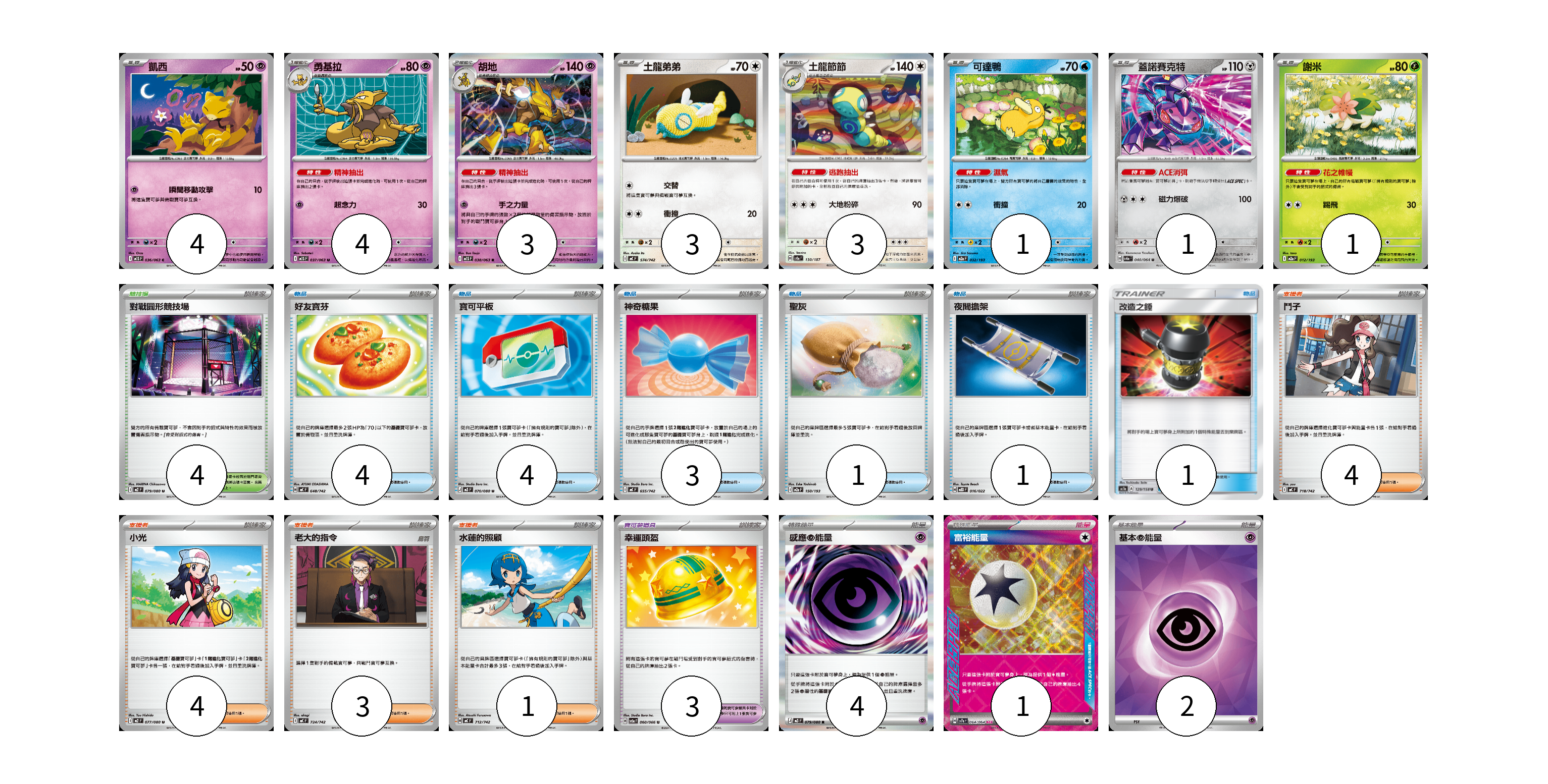 牌組構築方案 以此牌組為基礎新構築牌組 顯示卡面 顯示列表 寶可夢卡(20) 4 4 3 3 3 1 1 1 寶可夢道具(3) 3 物品卡(14) 4 4 3 1 1 1 支援者卡(12) 4 4 3 1 競技場卡(4) 4 能量卡(7) 4 1 2 寶可夢卡(20) 卡牌名稱 張數 卡牌名稱 張數 凱西 M1S 036/063 04 勇基拉 M1S 037/063 04 胡地 M1S 038/063 03 土龍弟弟 MC 574/742 03 土龍節節 SV8a 130/187 03 可達鴨 M2a 032/193 01 蓋諾賽克特 SV6a 040/064 01 謝米 M2a 012/193 01 寶可夢道具(3) 卡牌名稱 張數 卡牌名稱 張數 幸運頭盔 SV5a 060/066 03 物品卡(14) 卡牌名稱 張數 卡牌名稱 張數 好友寶芬 MC 648/742 04 寶可平板 M3 070/080 04 神奇糖果 MC 655/742 03 聖灰 M2a 150/193 01 夜間擔架 MBD 016/022 01 改造之錘 AC1a 129/158 01 支援者卡(12) 卡牌名稱 張數 卡牌名稱 張數 鬥子 MC 718/742 04 小光 M2 077/080 04 老大的指令 MC 724/742 03 水蓮的照顧 MC 712/742 01 競技場卡(4) 卡牌名稱 張數 卡牌名稱 張數 對戰圓形競技場 M2 079/080 04 能量卡(7) 卡牌名稱 張數 卡牌名稱 張數 感應【超】能量 M3 079/080 04 富裕能量 SV7a 064/064 01 基本【超】能量 SVM PSY 02 以此牌組為基礎新構築牌組 牌組編碼 EEMWuf-fqEoUX-mqCVYS copy 列印牌組單 牌組編碼已複製 分享至SNS