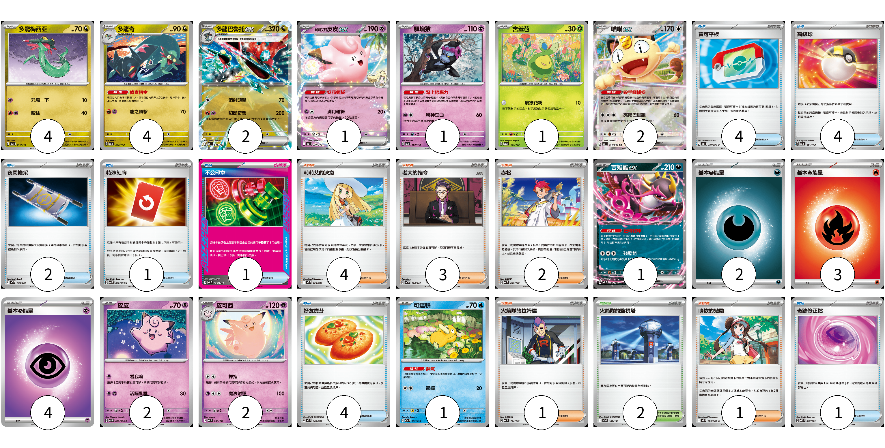 牌組構築方案 以此牌組為基礎新構築牌組 顯示卡面 顯示列表 寶可夢卡(21) 4 4 2 1 1 1 2 1 2 2 1 物品卡(17) 4 4 2 1 1 4 1 支援者卡(11) 4 3 2 1 1 競技場卡(2) 2 能量卡(9) 2 3 4 寶可夢卡(21) 卡牌名稱 張數 卡牌名稱 張數 多龍梅西亞 MC 546/742 04 多龍奇 MC 547/742 04 多龍巴魯托ex MC 548/742 02 莉莉艾的皮皮ex MC 287/742 01 願增猿 MC 358/742 01 含羞苞 M2a 011/193 01 喵喵ex M3 061/080 02 吉雉雞ex MC 489/742 01 皮皮 M3 029/080 02 皮可西 MC 286/742 02 可達鴨 M2a 032/193 01 物品卡(17) 卡牌名稱 張數 卡牌名稱 張數 寶可平板 M3 070/080 04 高級球 MC 651/742 04 夜間擔架 MC 670/742 02 特殊紅牌 M4 072/083 01 不公印章 MC 633/742 01 好友寶芬 MC 648/742 04 奇跡修正檔 MBD 017/022 01 支援者卡(11) 卡牌名稱 張數 卡牌名稱 張數 莉莉艾的決意 MC 729/742 04 老大的指令 MC 724/742 03 赤松 MC 696/742 02 火箭隊的拉姆達 MC 734/742 01 鳴依的勉勵 M3 075/080 01 競技場卡(2) 卡牌名稱 張數 卡牌名稱 張數 火箭隊的監視塔 M2a 189/193 02 能量卡(9) 卡牌名稱 張數 卡牌名稱 張數 基本【惡】能量 MC DAR 02 基本【火】能量 MC FIR 03 基本【超】能量 M-P PSY 04 以此牌組為基礎新構築牌組 牌組編碼 EFqzru-pZsuUP-YFCvjr copy 列印牌組單 牌組編碼已複製 分享至SNS