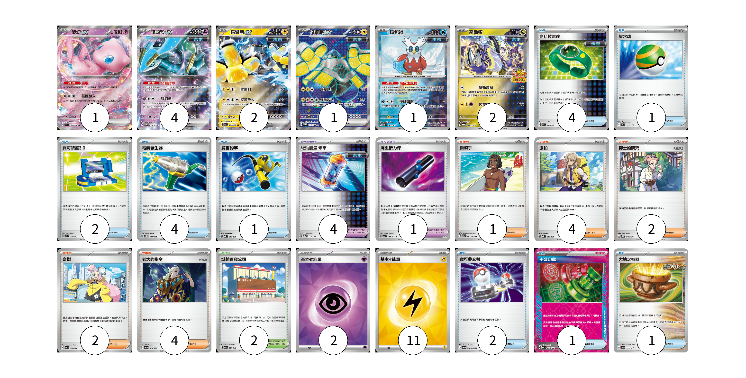 牌組構築方案 以此牌組為基礎新構築牌組 顯示卡面 顯示列表 寶可夢卡(11) 1 4 2 1 1 2 寶可夢道具(5) 4 1 物品卡(16) 4 1 2 4 1 2 1 1 支援者卡(13) 1 4 2 2 4 競技場卡(2) 2 能量卡(13) 2 11 寶可夢卡(11) 卡牌名稱 張數 卡牌名稱 張數 夢幻ex SV4a 076/190 01 鐵頭殼ex SV5M 036/071 04 鐵臂膀ex SV8a 054/187 02 鐵臂膀ex SV4M 079/066 01 鐵包袱 SV8a 047/187 01 密勒頓 SV-P 080/SV-P 02 寶可夢道具(5) 卡牌名稱 張數 卡牌名稱 張數 驅勁能量 未來 SV8a 158/187 04 沉重接力棒 SV5M 066/071 01 物品卡(16) 卡牌名稱 張數 卡牌名稱 張數 高科技雷達 SV8a 144/187 04 巢穴球 SVM 133/175 01 寶可裝置3.0 SVK 021/042 02 電氣發生器 SVTR 011/021 04 厲害釣竿 SVOD 010/020 01 寶可夢交替 SV9a 058/063 02 不公印章 SV5a 053/066 01 大地之容器 SV8a 143/187 01 支援者卡(13) 卡牌名稱 張數 卡牌名稱 張數 衝浪手 SV7a 061/064 01 派帕 SVOD 018/020 04 博士的研究 SVOM 019/021 02 奇樹 SVOD 016/020 02 老大的指令 SVOD 019/020 04 競技場卡(2) 卡牌名稱 張數 卡牌名稱 張數 城鎮百貨公司 SVK 037/042 02 能量卡(13) 卡牌名稱 張數 卡牌名稱 張數 基本【超】能量 SVOD PSY 02 基本【雷】能量 SVK LIG 11 以此牌組為基礎新構築牌組 牌組編碼 EJQBua-QYCTNO-MIASoi copy 列印牌組單 牌組編碼已複製 分享至SNS