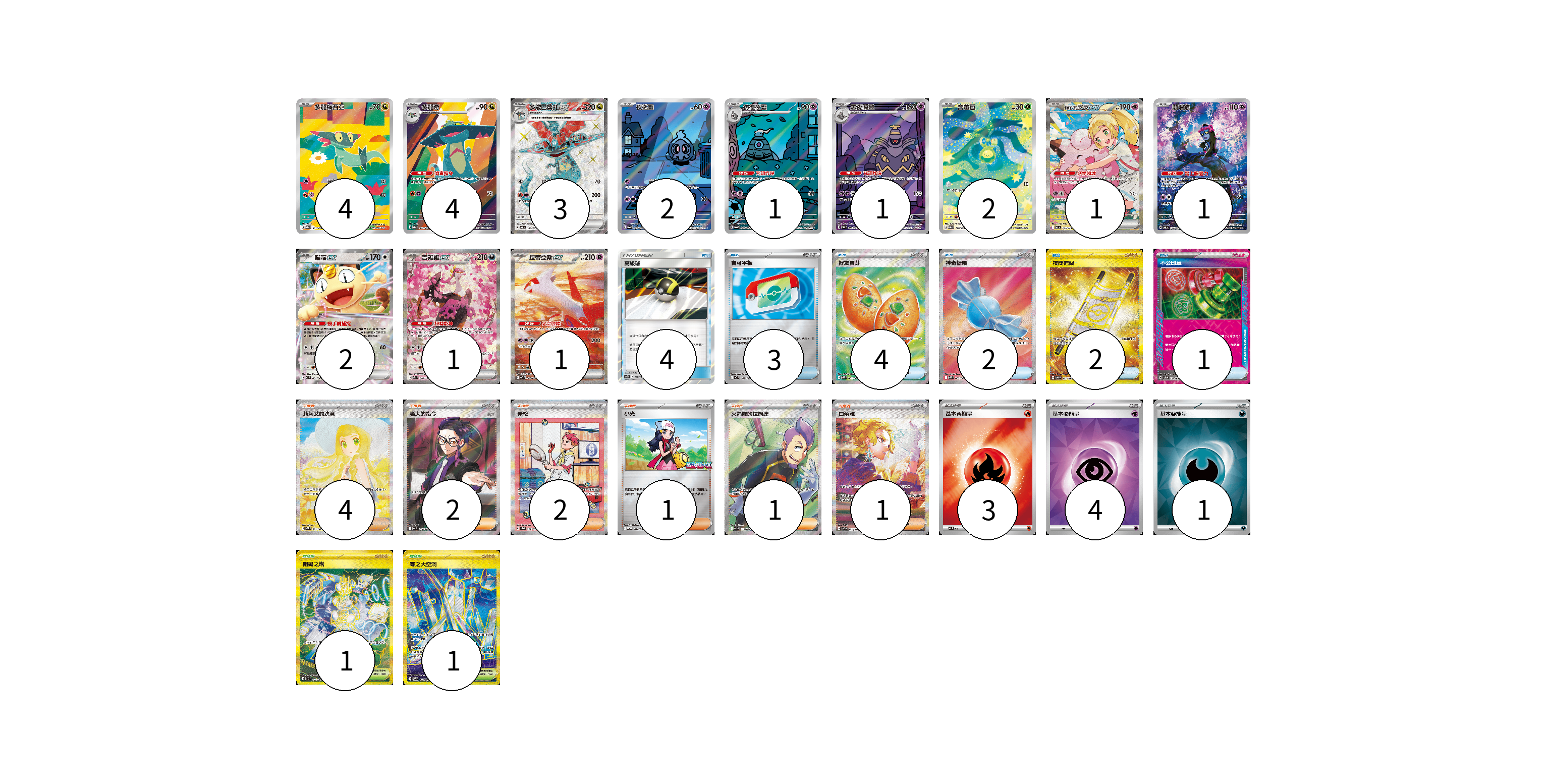 牌組構築方案 以此牌組為基礎新構築牌組 顯示卡面 顯示列表 寶可夢卡(23) 4 4 3 2 1 1 2 1 1 2 1 1 物品卡(16) 4 3 4 2 2 1 支援者卡(11) 4 2 2 1 1 1 競技場卡(2) 1 1 能量卡(8) 3 4 1 寶可夢卡(23) 卡牌名稱 張數 卡牌名稱 張數 多龍梅西亞 M2a 211/193 04 多龍奇 M2a 212/193 04 多龍巴魯托ex SV6 120/101 03 夜巡靈 SV6a 068/064 02 彷徨夜靈 SV6a 069/064 01 黑夜魔靈 SV6a 070/064 01 含羞苞 M2a 196/193 02 莉莉艾的皮皮ex MC 765/742 01 願增猿 SV6 107/101 01 喵喵ex M3 061/080 02 吉雉雞ex M2a 244/193 01 拉帝亞斯ex SV7a 087/064 01 物品卡(16) 卡牌名稱 張數 卡牌名稱 張數 高級球 AS5b 178/186 04 寶可平板 MC 662/742 03 好友寶芬 M1S 081/063 04 神奇糖果 M1S 082/063 02 夜間擔架 SV8 137/106 02 不公印章 SV5a 053/066 01 支援者卡(11) 卡牌名稱 張數 卡牌名稱 張數 莉莉艾的決意 M1L 091/063 04 老大的指令(烏羽) MC 760/742 02 赤松 SV8a 227/187 02 小光 M-P 028/M-P 01 火箭隊的拉姆達 SV10 122/098 01 白蕾雅 SV7 132/102 01 競技場卡(2) 卡牌名稱 張數 卡牌名稱 張數 阻礙之塔 SV10 132/098 01 零之大空洞 SV7 135/102 01 能量卡(8) 卡牌名稱 張數 卡牌名稱 張數 基本【火】能量 MC FIR 03 基本【超】能量 SVOD PSY 04 基本【惡】能量 SVOM DAR 01 以此牌組為基礎新構築牌組 牌組編碼 EOhBvl-kdjGNA-IWFXCO copy 列印牌組單 牌組編碼已複製 分享至SNS