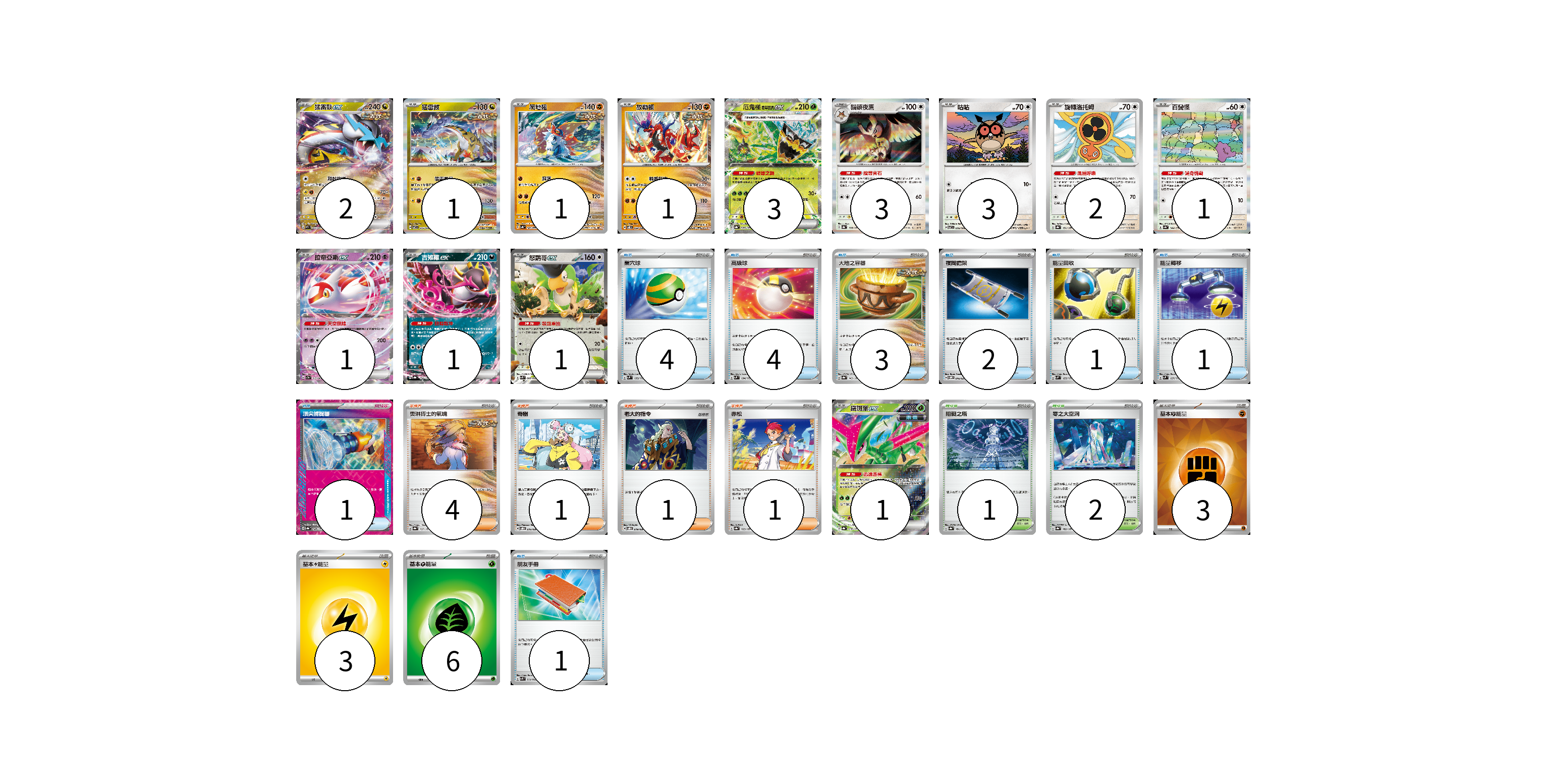 牌組構築方案 以此牌組為基礎新構築牌組 顯示卡面 顯示列表 寶可夢卡(21) 2 1 1 1 3 3 3 2 1 1 1 1 1 物品卡(17) 4 4 3 2 1 1 1 1 支援者卡(7) 4 1 1 1 競技場卡(3) 1 2 能量卡(12) 3 3 6 寶可夢卡(21) 卡牌名稱 張數 卡牌名稱 張數 猛雷鼓ex SV5K 053/071 02 猛雷鼓 SV7 075/102 01 爬地翅 SV4K 041/066 01 故勒頓 SV8 069/106 01 厄鬼椪 碧草面具ex SV8a 020/187 03 貓頭夜鷹 SV8a 128/187 03 咕咕 SV7 076/102 03 旋轉洛托姆 SV8a 131/187 02 百變怪 SV4a 144/190 01 拉帝亞斯ex SV7a 019/064 01 吉雉雞ex SV8a 104/187 01 怒鸚哥ex SVK 006/042 01 鐵斑葉ex SV8a 016/187 01 物品卡(17) 卡牌名稱 張數 卡牌名稱 張數 巢穴球 SVM 133/175 04 高級球 SVM 134/175 04 大地之容器 SV8a 143/187 03 夜間擔架 SVOM 016/021 02 能量回收 SVM 125/175 01 能量轉移 SVM 127/175 01 頂尖捕捉器 SV8a 148/187 01 朋友手冊 SVK 014/042 01 支援者卡(7) 卡牌名稱 張數 卡牌名稱 張數 奧琳博士的氣魄 SV8a 167/187 04 奇樹 SVOD 016/020 01 老大的指令 SVOD 019/020 01 赤松 SV8a 163/187 01 競技場卡(3) 卡牌名稱 張數 卡牌名稱 張數 阻礙之塔 SV8a 181/187 01 零之大空洞 SV8a 182/187 02 能量卡(12) 卡牌名稱 張數 卡牌名稱 張數 基本【鬥】能量 SVK FIG 03 基本【雷】能量 SVHM LIG 03 基本【草】能量 SVF GRA 06 以此牌組為基礎新構築牌組 牌組編碼 EQasWp-zhGdoH-vFaNuj copy 列印牌組單 牌組編碼已複製 分享至SNS