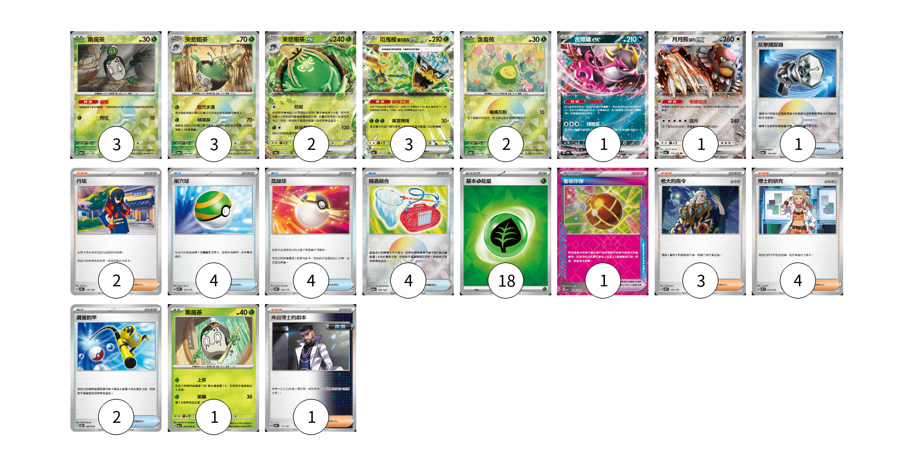 牌組構築方案 以此牌組為基礎新構築牌組 顯示卡面 顯示列表 寶可夢卡(16) 3 3 2 3 2 1 1 1 寶可夢道具(1) 1 物品卡(15) 1 4 4 4 2 支援者卡(10) 2 3 4 1 能量卡(18) 18 寶可夢卡(16) 卡牌名稱 張數 卡牌名稱 張數 斯魔茶 SV8a 017/187 03 來悲粗茶 SV8a 018/187 03 來悲粗茶ex SV8a 019/187 02 厄鬼椪 碧草面具ex SV8a 020/187 03 含羞苞 SV8a 001/187 02 吉雉雞ex SV8a 104/187 01 月月熊 赫月ex SV8a 134/187 01 斯魔茶 SV6 013/101 01 寶可夢道具(1) 卡牌名稱 張數 卡牌名稱 張數 奢華炸彈 SV7 096/102 01 物品卡(15) 卡牌名稱 張數 卡牌名稱 張數 反擊捕捉器 SV8a 139/187 01 巢穴球 SVM 133/175 04 高級球 SVM 134/175 04 捕蟲組合 SV8a 150/187 04 厲害釣竿 SVTG 009/019 02 支援者卡(10) 卡牌名稱 張數 卡牌名稱 張數 丹瑜 SV8a 170/187 02 老大的指令 SVM 172/175 03 博士的研究 SVK 032/042 04 弗圖博士的劇本 SV8a 175/187 01 能量卡(18) 卡牌名稱 張數 卡牌名稱 張數 基本【草】能量 SVK GRA 18 以此牌組為基礎新構築牌組 牌組編碼 ERFLQa-kxwgES-lspnec copy 列印牌組單 牌組編碼已複製 分享至SNS