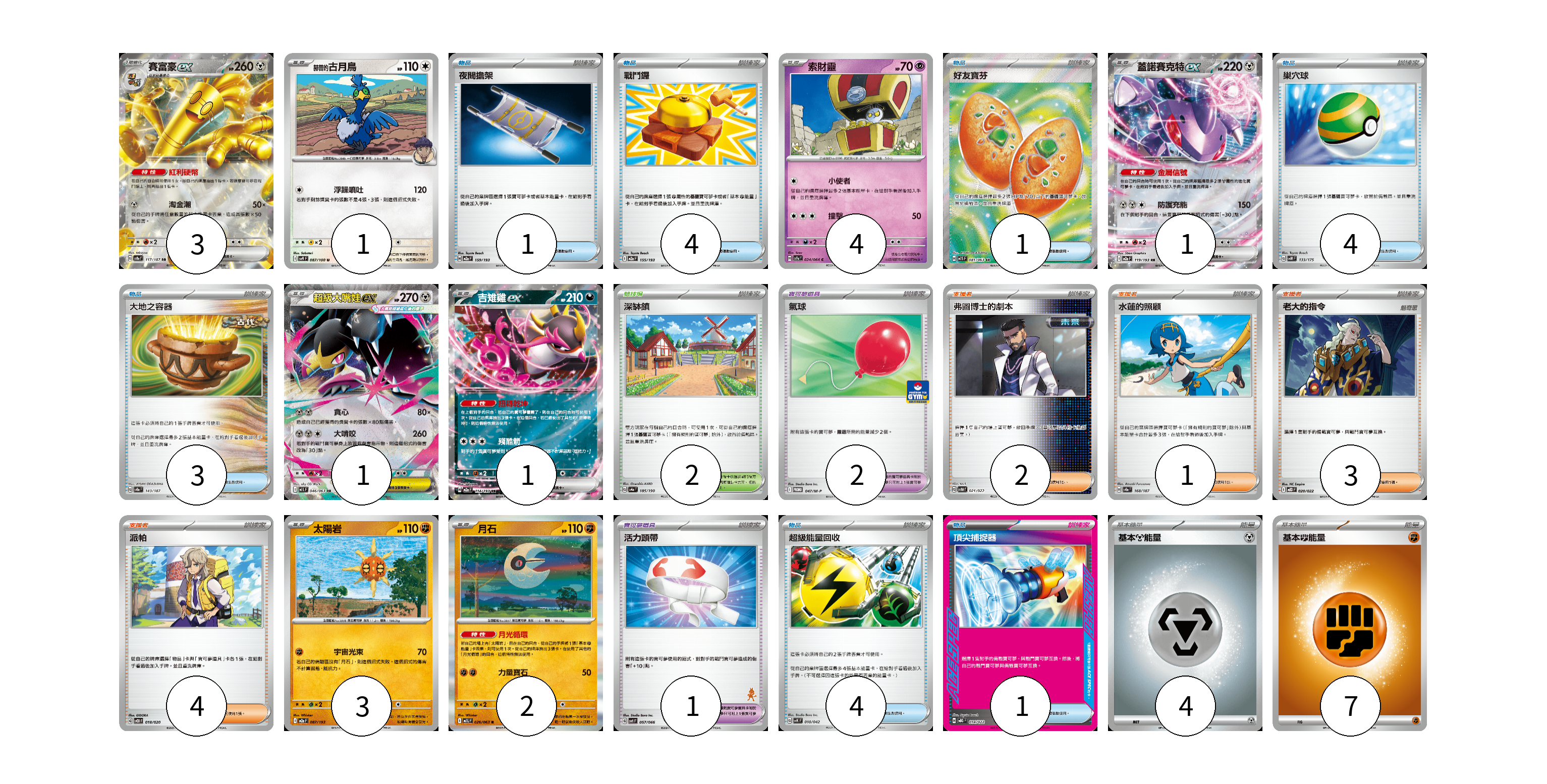 牌組構築方案 以此牌組為基礎新構築牌組 顯示卡面 顯示列表 寶可夢卡(16) 3 1 4 1 1 1 3 2 寶可夢道具(3) 2 1 物品卡(18) 1 4 1 4 3 4 1 支援者卡(10) 2 1 3 4 競技場卡(2) 2 能量卡(11) 4 7 寶可夢卡(16) 卡牌名稱 張數 卡牌名稱 張數 賽富豪ex SV8a 117/187 03 赫普的古月鳥 SV9 087/100 01 索財靈 SV7a 024/064 04 蓋諾賽克特ex M2a 119/193 01 超級大嘴娃ex M1L 046/063 01 吉雉雞ex M2a 114/193 01 太陽岩 M2a 087/193 03 月石 M1L 026/063 02 寶可夢道具(3) 卡牌名稱 張數 卡牌名稱 張數 氣球 M-P 047/M-P 02 活力頭帶 SVI 057/066 01 物品卡(18) 卡牌名稱 張數 卡牌名稱 張數 夜間擔架 M2a 159/193 01 戰鬥鑼 M2a 155/193 04 好友寶芬 M1S 081/063 01 巢穴球 SVM 133/175 04 大地之容器 SV8a 143/187 03 超級能量回收 SVK 010/042 04 頂尖捕捉器 MBG 014/022 01 支援者卡(10) 卡牌名稱 張數 卡牌名稱 張數 弗圖博士的劇本 SVHM 021/022 02 水蓮的照顧 SV8a 168/187 01 老大的指令 MBD 020/022 03 派帕 SVOD 018/020 04 競技場卡(2) 卡牌名稱 張數 卡牌名稱 張數 深缽鎮 SV4a 185/190 02 能量卡(11) 卡牌名稱 張數 卡牌名稱 張數 基本【鋼】能量 M-P MET 04 基本【鬥】能量 M-P FIG 07 以此牌組為基礎新構築牌組 牌組編碼 ESvWlR-hGRSQM-aKunLg copy 列印牌組單 牌組編碼已複製 分享至SNS