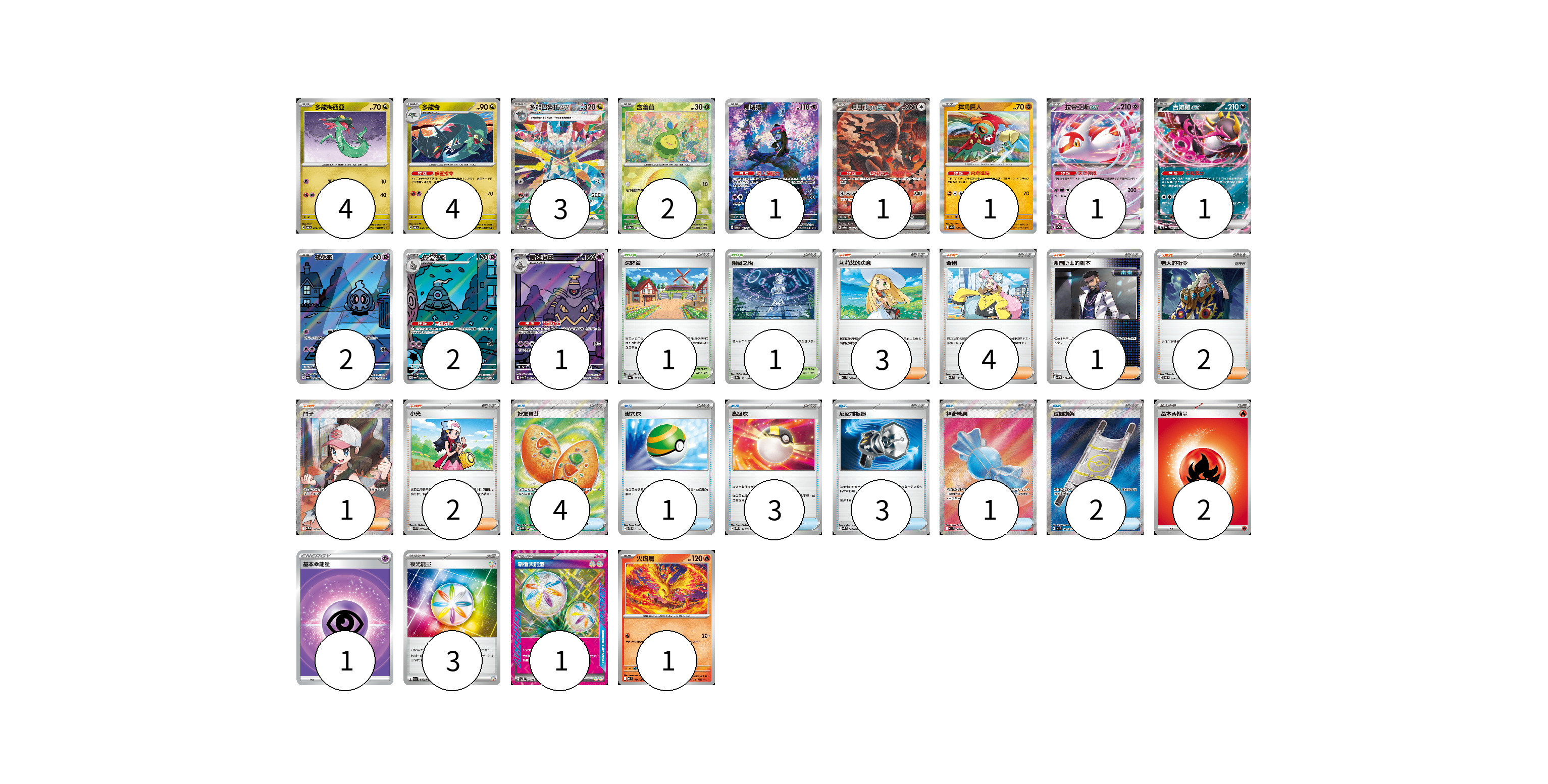 牌組構築方案 以此牌組為基礎新構築牌組 顯示卡面 顯示列表 寶可夢卡(24) 4 4 3 2 1 1 1 1 1 2 2 1 1 物品卡(14) 4 1 3 3 1 2 支援者卡(13) 3 4 1 2 1 2 競技場卡(2) 1 1 能量卡(7) 2 1 3 1 寶可夢卡(24) 卡牌名稱 張數 卡牌名稱 張數 多龍梅西亞 SV6 079/101 04 多龍奇 SV6 080/101 04 多龍巴魯托ex SV8a 221/187 03 含羞苞 SV8a 001/187 02 願增猿 SV6 107/101 01 月月熊 赫月ex SV8a 225/187 01 摔角鷹人 SV1S 045/078 01 拉帝亞斯ex SV7a 019/064 01 吉雉雞ex SV6a 038/064 01 夜巡靈 SV6a 068/064 02 彷徨夜靈 SV6a 069/064 02 黑夜魔靈 SV6a 070/064 01 火焰鳥 M2 014/080 01 物品卡(14) 卡牌名稱 張數 卡牌名稱 張數 好友寶芬 M1S 081/063 04 巢穴球 SVTG 012/019 01 高級球 SVQL 015/022 03 反擊捕捉器 SVK 009/042 03 神奇糖果 M1S 082/063 01 夜間擔架 M1L 083/063 02 支援者卡(13) 卡牌名稱 張數 卡牌名稱 張數 莉莉艾的決意 M1L 062/063 03 奇樹 SVM 160/175 04 弗圖博士的劇本 SVHM 021/022 01 老大的指令 SVOD 019/020 02 鬥子 SV11W 166/086 01 小光 M2 077/080 02 競技場卡(2) 卡牌名稱 張數 卡牌名稱 張數 深缽鎮 SV4a 185/190 01 阻礙之塔 SV8a 181/187 01 能量卡(7) 卡牌名稱 張數 卡牌名稱 張數 基本【火】能量 M-P FIR 02 基本【超】能量 SI PSY 01 夜光能量 SV1a 073/073 03 新衝天能量 SV5K 071/071 01 以此牌組為基礎新構築牌組 牌組編碼 ETOBfh-LVtnXK-JjnHOA copy 列印牌組單 牌組編碼已複製 分享至SNS