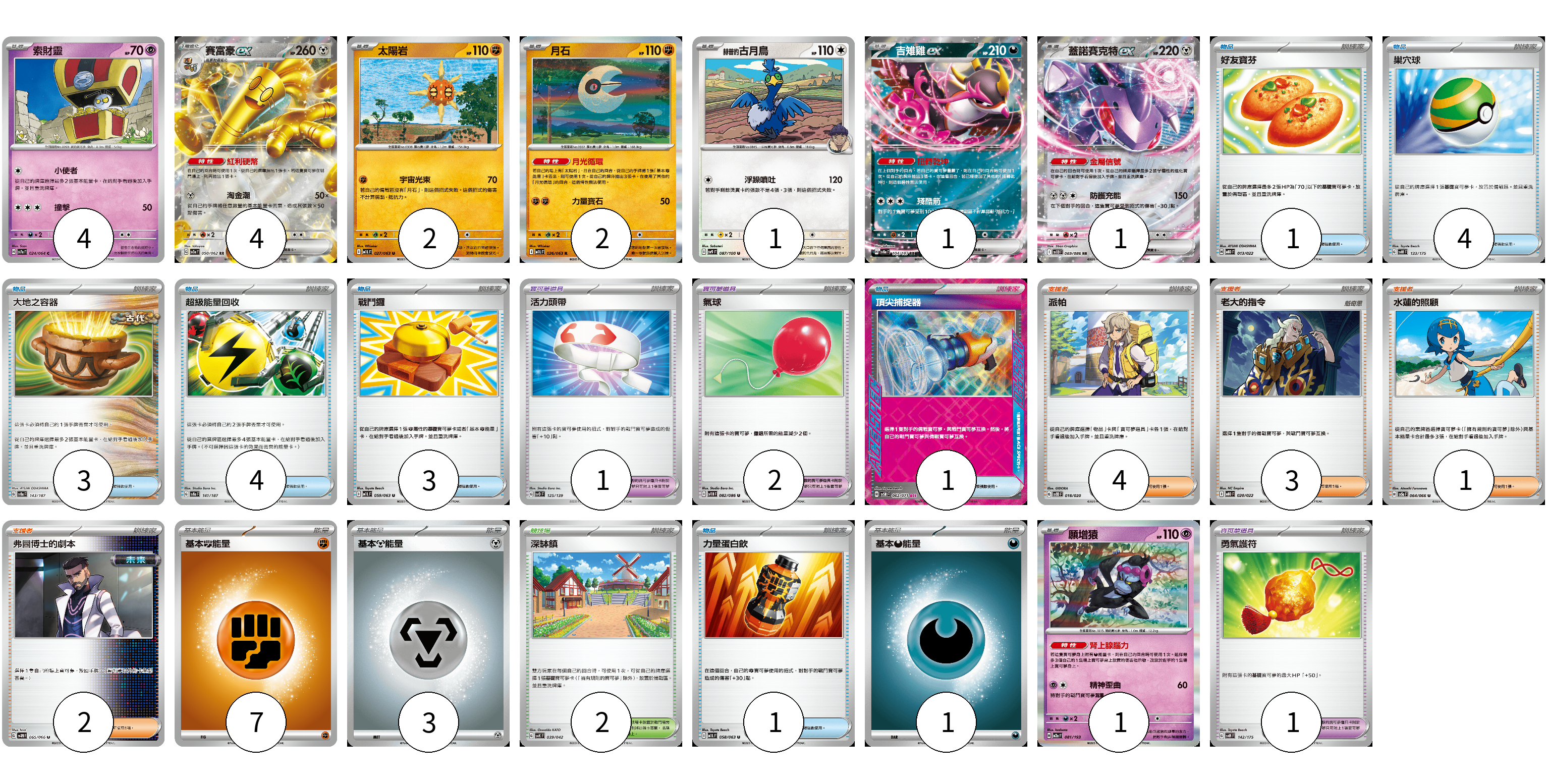 牌組構築方案 以此牌組為基礎新構築牌組 顯示卡面 顯示列表 寶可夢卡(16) 4 4 2 2 1 1 1 1 寶可夢道具(4) 1 2 1 物品卡(17) 1 4 3 4 3 1 1 支援者卡(10) 4 3 1 2 競技場卡(2) 2 能量卡(11) 7 3 1 寶可夢卡(16) 卡牌名稱 張數 卡牌名稱 張數 索財靈 SV7a 024/064 04 賽富豪ex SV3a 050/062 04 太陽岩 M1L 027/063 02 月石 M1L 026/063 02 赫普的古月鳥 SV9 087/100 01 吉雉雞ex SV8a 104/187 01 蓋諾賽克特ex SV11B 069/086 01 願增猿 M2a 081/193 01 寶可夢道具(4) 卡牌名稱 張數 卡牌名稱 張數 活力頭帶 SVD 125/139 01 氣球 SV11B 082/086 02 勇氣護符 SVM 142/175 01 物品卡(17) 卡牌名稱 張數 卡牌名稱 張數 好友寶芬 MBD 013/022 01 巢穴球 SVM 133/175 04 大地之容器 SV8a 143/187 03 超級能量回收 SV8a 141/187 04 戰鬥鑼 M1L 059/063 03 頂尖捕捉器 SV5M 062/071 01 力量蛋白飲 M1L 058/063 01 支援者卡(10) 卡牌名稱 張數 卡牌名稱 張數 派帕 SVOD 018/020 04 老大的指令 MBD 020/022 03 水蓮的照顧 SV5a 064/066 01 弗圖博士的劇本 SV4M 065/066 02 競技場卡(2) 卡牌名稱 張數 卡牌名稱 張數 深缽鎮 SVK 039/042 02 能量卡(11) 卡牌名稱 張數 卡牌名稱 張數 基本【鬥】能量 M-P FIG 07 基本【鋼】能量 M-P MET 03 基本【惡】能量 MBG DAR 01 以此牌組為基礎新構築牌組 牌組編碼 EUbxHa-iTVeKk-qAlgaU copy 列印牌組單 牌組編碼已複製 分享至SNS