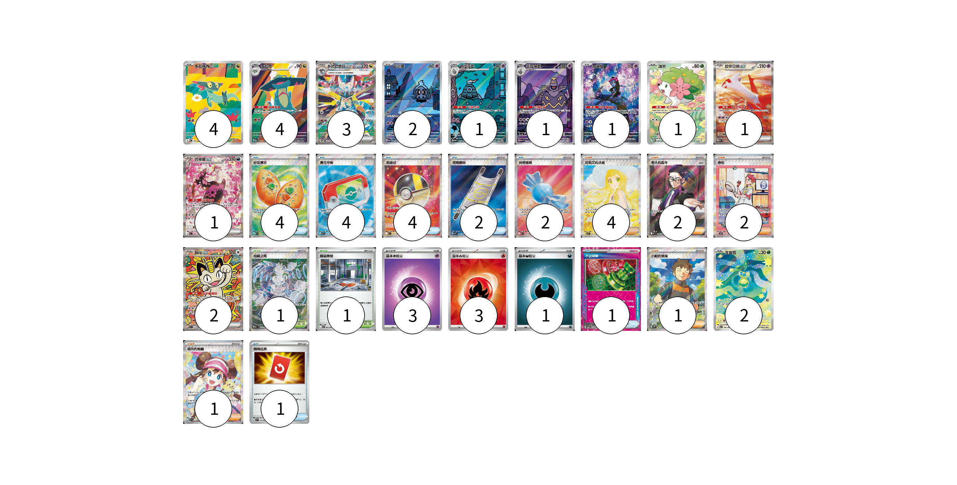 牌組構築方案 以此牌組為基礎新構築牌組 顯示卡面 顯示列表 寶可夢卡(23) 4 4 3 2 1 1 1 1 1 1 2 2 物品卡(18) 4 4 4 2 2 1 1 支援者卡(10) 4 2 2 1 1 競技場卡(2) 1 1 能量卡(7) 3 3 1 寶可夢卡(23) 卡牌名稱 張數 卡牌名稱 張數 多龍梅西亞 M2a 211/193 04 多龍奇 M2a 212/193 04 多龍巴魯托ex SV8a 221/187 03 夜巡靈 SV6a 068/064 02 彷徨夜靈 SV6a 069/064 01 黑夜魔靈 SV6a 070/064 01 願增猿 SV6 107/101 01 謝米 SV9a 066/063 01 拉帝亞斯ex SV7a 087/064 01 吉雉雞ex M2a 244/193 01 喵喵ex M3 114/080 02 含羞苞 M2a 196/193 02 物品卡(18) 卡牌名稱 張數 卡牌名稱 張數 好友寶芬 M1S 081/063 04 寶可平板 M3 103/080 04 高級球 M2a 216/193 04 夜間擔架 M1L 083/063 02 神奇糖果 M1S 082/063 02 不公印章 SV5a 053/066 01 特殊紅牌 M4 072/083 01 支援者卡(10) 卡牌名稱 張數 卡牌名稱 張數 莉莉艾的決意 M1L 091/063 04 老大的指令(烏羽) MC 760/742 02 赤松 SV8a 227/187 02 小剛的發掘 SV9 123/100 01 鳴依的勉勵 M3 115/080 01 競技場卡(2) 卡牌名稱 張數 卡牌名稱 張數 阻礙之塔 M2a 222/193 01 險惡廢墟 M1L 063/063 01 能量卡(7) 卡牌名稱 張數 卡牌名稱 張數 基本【超】能量 M-P PSY 03 基本【火】能量 SVQL FIR 03 基本【惡】能量 M-P DAR 01 以此牌組為基礎新構築牌組 牌組編碼 EUxxdv-frhzOg-rMdcnW copy 列印牌組單 牌組編碼已複製 分享至SNS