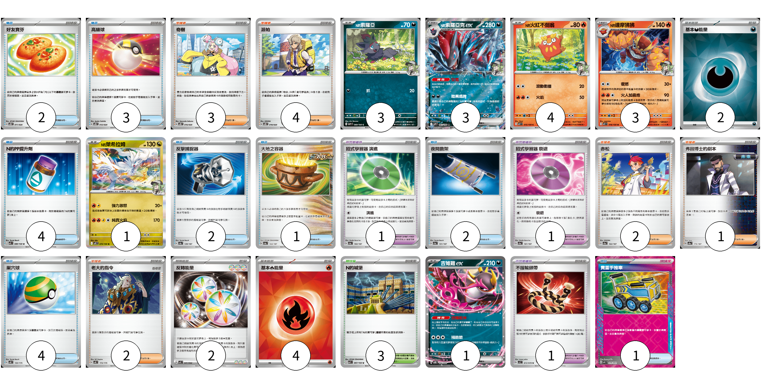 牌組構築方案 以此牌組為基礎新構築牌組 顯示卡面 顯示列表 寶可夢卡(15) 3 3 4 3 1 1 寶可夢道具(3) 1 1 1 物品卡(19) 2 3 4 2 1 2 4 1 支援者卡(12) 3 4 2 1 2 競技場卡(3) 3 能量卡(8) 2 2 4 寶可夢卡(15) 卡牌名稱 張數 卡牌名稱 張數 N的索羅亞 SV9 060/100 03 N的索羅亞克ex SV9 061/100 03 N的火紅不倒翁 SV9 015/100 04 N的達摩狒狒 SV9 016/100 03 N的萊希拉姆 SV9 074/100 01 吉雉雞ex SVOD 004/020 01 寶可夢道具(3) 卡牌名稱 張數 卡牌名稱 張數 招式學習器 演進 SV8a 160/187 01 招式學習器 衰退 SV8a 161/187 01 不服輸頭帶 SV1S 073/078 01 物品卡(19) 卡牌名稱 張數 卡牌名稱 張數 好友寶芬 SVOD 011/020 02 高級球 SVOD 012/020 03 N的PP提升劑 SV9 089/100 04 反擊捕捉器 SV8a 139/187 02 大地之容器 SV8a 143/187 01 夜間擔架 SV8a 151/187 02 巢穴球 SVM 133/175 04 貴重手推車 SVK 020/042 01 支援者卡(12) 卡牌名稱 張數 卡牌名稱 張數 奇樹 SVOD 016/020 03 派帕 SVOD 018/020 04 赤松 SV8a 163/187 02 弗圖博士的劇本 SV8a 175/187 01 老大的指令 SVM 172/175 02 競技場卡(3) 卡牌名稱 張數 卡牌名稱 張數 N的城堡 SV9 097/100 03 能量卡(8) 卡牌名稱 張數 卡牌名稱 張數 基本【惡】能量 SVOM DAR 02 反轉能量 SVK 041/042 02 基本【火】能量 SVK FIR 04 以此牌組為基礎新構築牌組 牌組編碼 EVlEzo-vDUIMY-TWUZCb copy 列印牌組單 牌組編碼已複製 分享至SNS