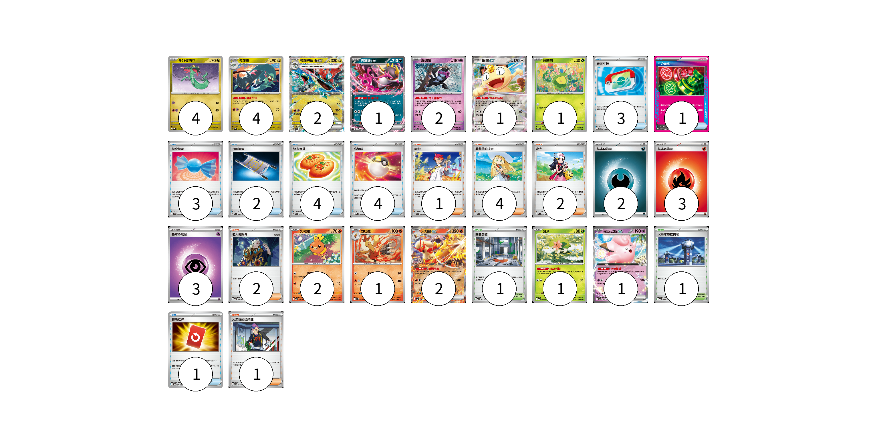 牌組構築方案 以此牌組為基礎新構築牌組 顯示卡面 顯示列表 寶可夢卡(22) 4 4 2 1 2 1 1 2 1 2 1 1 物品卡(18) 3 1 3 2 4 4 1 支援者卡(10) 1 4 2 2 1 競技場卡(2) 1 1 能量卡(8) 2 3 3 寶可夢卡(22) 卡牌名稱 張數 卡牌名稱 張數 多龍梅西亞 SV8a 118/187 04 多龍奇 SV8a 119/187 04 多龍巴魯托ex M2a 134/193 02 吉雉雞ex SVOD 004/020 01 願增猿 MC 358/742 02 喵喵ex M3 061/080 01 含羞苞 M2a 011/193 01 火稚雞 SV10 018/098 02 力壯雞 SV10 019/098 01 火焰雞ex SVM 016/175 02 謝米 SV9a 006/063 01 莉莉艾的皮皮ex MC 287/742 01 物品卡(18) 卡牌名稱 張數 卡牌名稱 張數 寶可平板 M3 070/080 03 不公印章 MC 633/742 01 神奇糖果 MC 655/742 03 夜間擔架 MC 670/742 02 好友寶芬 M2a 153/193 04 高級球 MBG 012/022 04 特殊紅牌 M4 072/083 01 支援者卡(10) 卡牌名稱 張數 卡牌名稱 張數 赤松 MC 696/742 01 莉莉艾的決意 MC 729/742 04 小光 M2 077/080 02 老大的指令 MBD 020/022 02 火箭隊的拉姆達 SV10 094/098 01 競技場卡(2) 卡牌名稱 張數 卡牌名稱 張數 險惡廢墟 M1L 063/063 01 火箭隊的監視塔 M2a 189/193 01 能量卡(8) 卡牌名稱 張數 卡牌名稱 張數 基本【惡】能量 MC DAR 02 基本【火】能量 MC FIR 03 基本【超】能量 MC PSY 03 以此牌組為基礎新構築牌組 牌組編碼 EWDRZm-gUOQPZ-AltadX copy 列印牌組單 牌組編碼已複製 分享至SNS