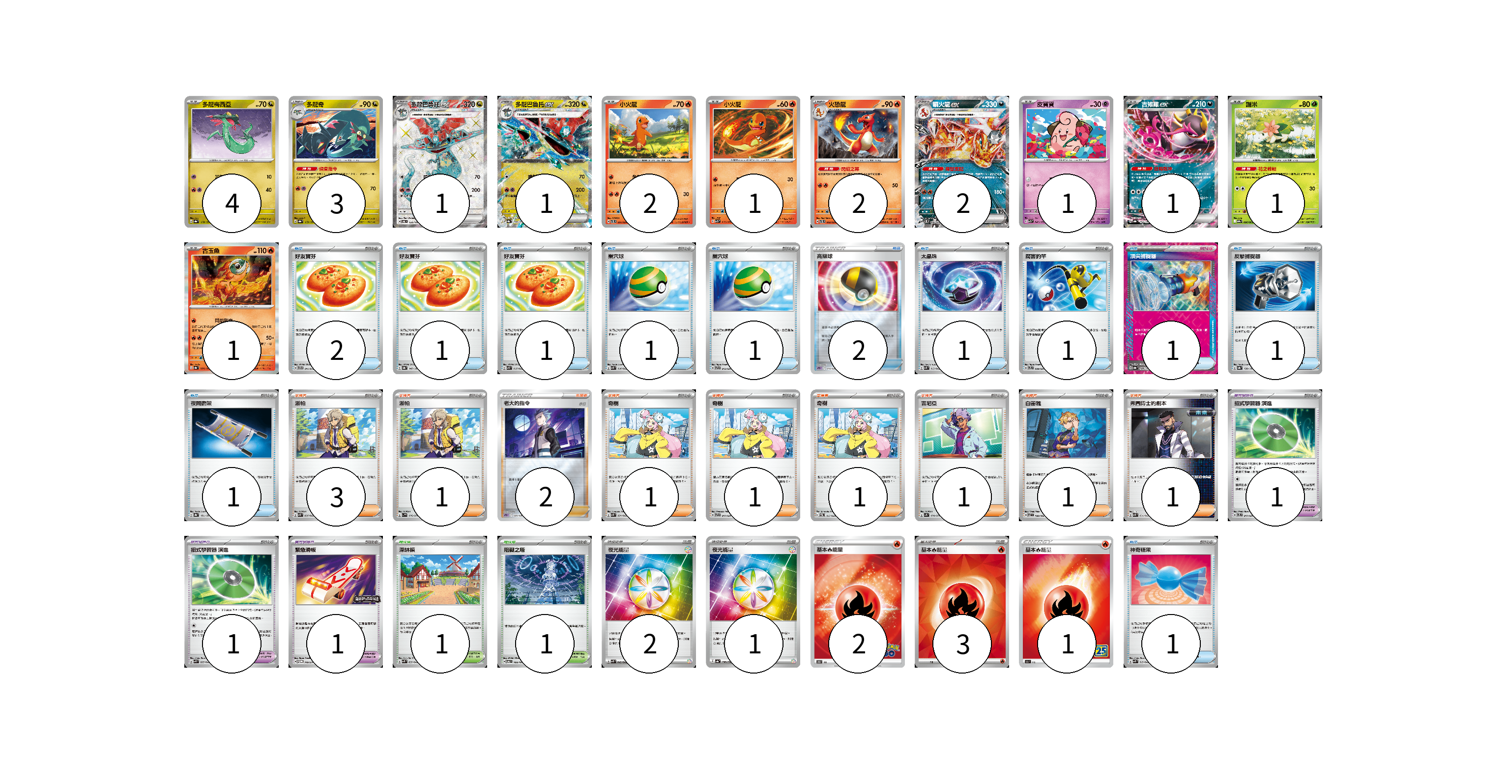 牌組構築方案 以此牌組為基礎新構築牌組 顯示卡面 顯示列表 寶可夢卡(20) 4 3 1 1 2 1 2 2 1 1 1 1 寶可夢道具(3) 1 1 1 物品卡(14) 2 1 1 1 1 2 1 1 1 1 1 1 支援者卡(12) 3 1 2 1 1 1 1 1 1 競技場卡(2) 1 1 能量卡(9) 2 1 2 3 1 寶可夢卡(20) 卡牌名稱 張數 卡牌名稱 張數 多龍梅西亞 SV8a 118/187 04 多龍奇 SV8a 119/187 03 多龍巴魯托ex SV6 120/101 01 多龍巴魯托ex SV8a 120/187 01 小火龍 SVTL 001/021 02 小火龍 SV3 012/108 01 火恐龍 SVTL 002/021 02 噴火龍ex SVTL 006/021 02 皮寶寶 SV3 042/108 01 吉雉雞ex SV8a 104/187 01 謝米 SV9a 006/063 01 古玉魚 SV8a 025/187 01 寶可夢道具(3) 卡牌名稱 張數 卡牌名稱 張數 招式學習器 演進 SVTL 017/021 01 招式學習器 演進 SVK 025/042 01 緊急滑板 SV-P 140/SV-P 01 物品卡(14) 卡牌名稱 張數 卡牌名稱 張數 好友寶芬 SVTG 011/019 02 好友寶芬 SV8a 147/187 01 好友寶芬 SVK 015/042 01 巢穴球 SVK 016/042 01 巢穴球 SVTR 013/021 01 高級球 SPD 010/020 02 太晶珠 SVK 013/042 01 厲害釣竿 SVTL 009/021 01 頂尖捕捉器 SV8a 148/187 01 反擊捕捉器 SV8a 139/187 01 夜間擔架 SV8a 151/187 01 神奇糖果 SVK 019/042 01 支援者卡(12) 卡牌名稱 張數 卡牌名稱 張數 派帕 SVK 035/042 03 派帕 SV1V 076/078 01 老大的指令(赤日) SPD 020/020 02 奇樹 SVK 031/042 01 奇樹 SVTR 017/021 01 奇樹 SVEM 017/020 01 吉尼亞 SV1S 074/078 01 白蕾雅 SV7 100/102 01 弗圖博士的劇本 SVK 034/042 01 競技場卡(2) 卡牌名稱 張數 卡牌名稱 張數 深缽鎮 SVK 039/042 01 阻礙之塔 SV6 100/101 01 能量卡(9) 卡牌名稱 張數 卡牌名稱 張數 夜光能量 SVK 042/042 02 夜光能量 SV4a 190/190 01 基本火能量 S10b FIR 02 基本【火】能量 SVM FIR 03 基本火能量 S8a FIR 01 以此牌組為基礎新構築牌組 牌組編碼 EYVzYO-EgaVyu-nkZBuQ copy 列印牌組單 牌組編碼已複製 分享至SNS