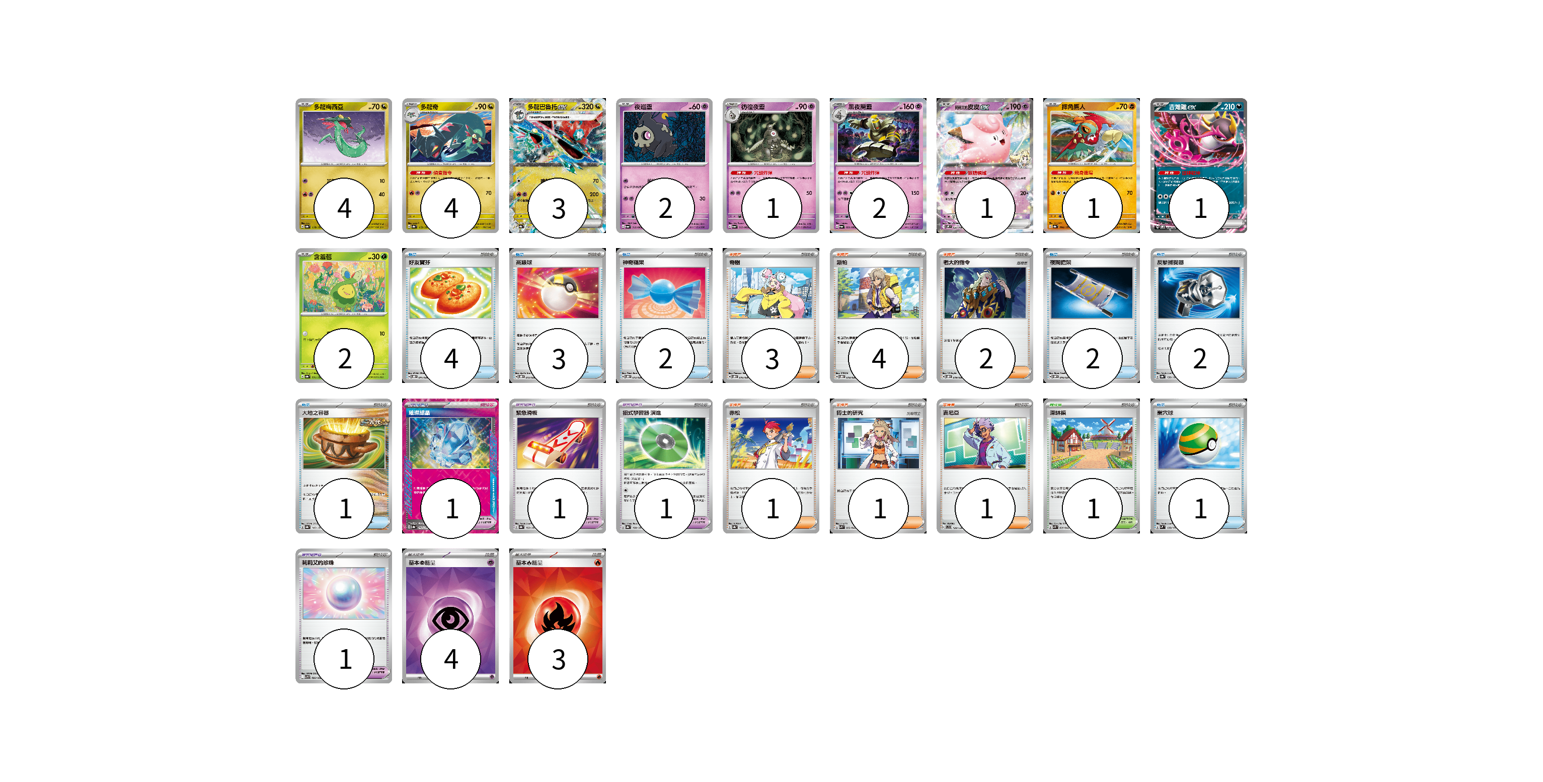 牌組構築方案 以此牌組為基礎新構築牌組 顯示卡面 顯示列表 寶可夢卡(21) 4 4 3 2 1 2 1 1 1 2 寶可夢道具(4) 1 1 1 1 物品卡(15) 4 3 2 2 2 1 1 支援者卡(12) 3 4 2 1 1 1 競技場卡(1) 1 能量卡(7) 4 3 寶可夢卡(21) 卡牌名稱 張數 卡牌名稱 張數 多龍梅西亞 SV8a 118/187 04 多龍奇 SV8a 119/187 04 多龍巴魯托ex SV8a 120/187 03 夜巡靈 SV6a 018/064 02 彷徨夜靈 SV6a 019/064 01 黑夜魔靈 SV6a 020/064 02 莉莉艾的皮皮ex SV9 033/100 01 摔角鷹人 SV8a 084/187 01 吉雉雞ex SVOM 009/021 01 含羞苞 SV8a 001/187 02 寶可夢道具(4) 卡牌名稱 張數 卡牌名稱 張數 璀璨結晶 SV8a 152/187 01 緊急滑板 SV8a 153/187 01 招式學習器 演進 SV8a 160/187 01 莉莉艾的珍珠 SV9 093/100 01 物品卡(15) 卡牌名稱 張數 卡牌名稱 張數 好友寶芬 SVOD 011/020 04 高級球 SVOD 012/020 03 神奇糖果 SVOD 013/020 02 夜間擔架 SVOM 016/021 02 反擊捕捉器 SV8a 139/187 02 大地之容器 SV8a 143/187 01 巢穴球 SVM 133/175 01 支援者卡(12) 卡牌名稱 張數 卡牌名稱 張數 奇樹 SVOD 016/020 03 派帕 SVOD 018/020 04 老大的指令 SVOD 019/020 02 赤松 SV8a 163/187 01 博士的研究 SVK 032/042 01 吉尼亞 SVD 129/139 01 競技場卡(1) 卡牌名稱 張數 卡牌名稱 張數 深缽鎮 SVK 039/042 01 能量卡(7) 卡牌名稱 張數 卡牌名稱 張數 基本【超】能量 SVOD PSY 04 基本【火】能量 SVK FIR 03 以此牌組為基礎新構築牌組 牌組編碼 EYZVnb-BcZZPI-WLvUNG copy 列印牌組單 牌組編碼已複製 分享至SNS