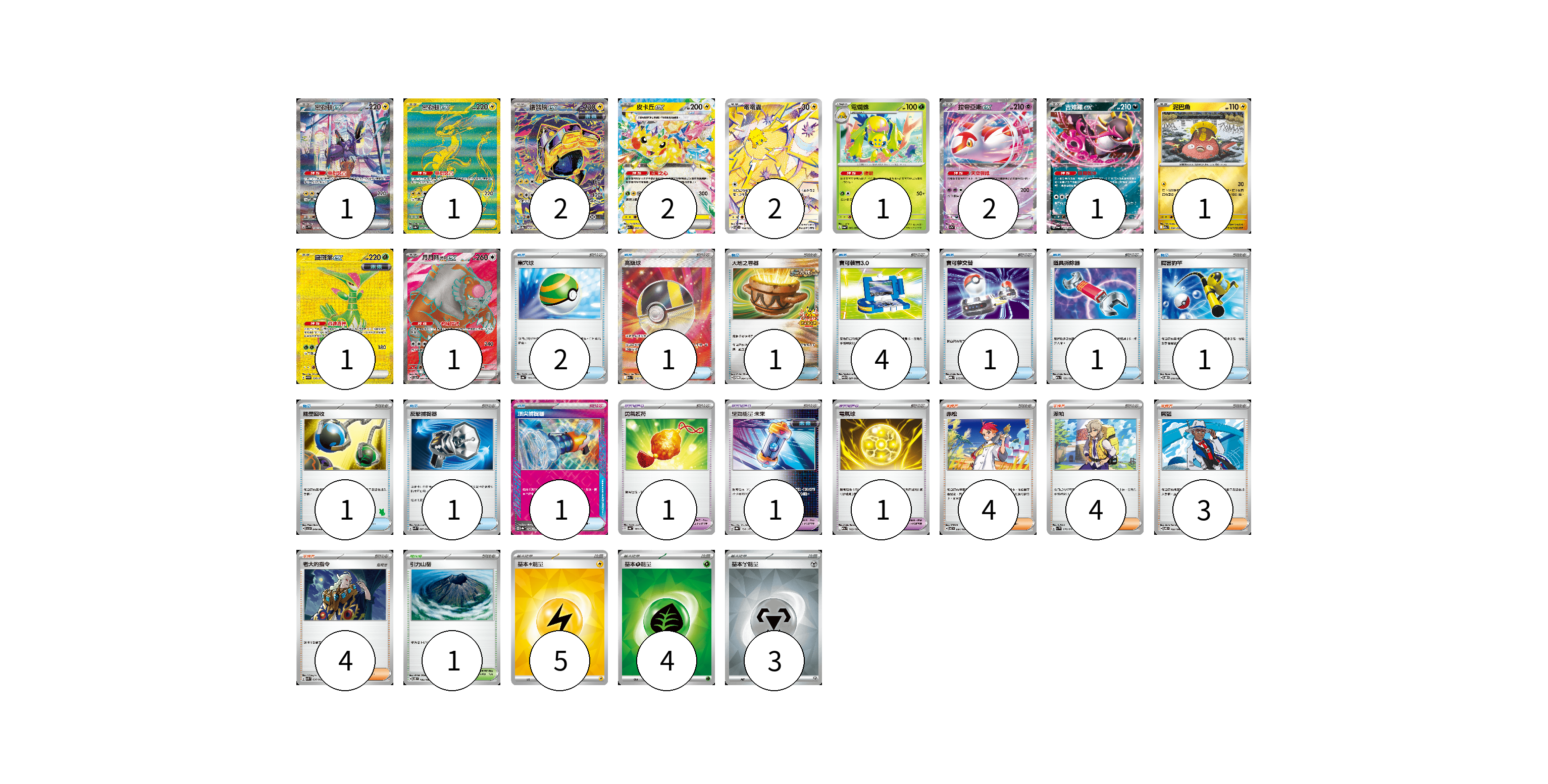 牌組構築方案 以此牌組為基礎新構築牌組 顯示卡面 顯示列表 寶可夢卡(15) 1 1 2 2 2 1 2 1 1 1 1 寶可夢道具(3) 1 1 1 物品卡(14) 2 1 1 4 1 1 1 1 1 1 支援者卡(15) 4 4 3 4 競技場卡(1) 1 能量卡(12) 5 4 3 寶可夢卡(15) 卡牌名稱 張數 卡牌名稱 張數 密勒頓ex SV1V 102/078 01 密勒頓ex SV4a 358/190 01 鐵臂膀ex SV8a 210/187 02 皮卡丘ex M2a 044/193 02 電電蟲 SV7 108/102 02 電蜘蛛 SV6a 002/064 01 拉帝亞斯ex SV7a 019/064 02 吉雉雞ex SV6a 038/064 01 泥巴魚 M2a 050/193 01 鐵斑葉ex SV5M 098/071 01 月月熊 赫月 ex SV5a 084/066 01 寶可夢道具(3) 卡牌名稱 張數 卡牌名稱 張數 勇氣護符 SV4a 169/190 01 驅勁能量 未來 SV8a 158/187 01 電氣球 M2a 163/193 01 物品卡(14) 卡牌名稱 張數 卡牌名稱 張數 巢穴球 SV4a 159/190 02 高級球 M2a 216/193 01 大地之容器 SV-P 084/SV-P 01 寶可裝置3.0 SV11B 081/086 04 寶可夢交替 MBG 015/022 01 道具拆除器 M2a 151/193 01 厲害釣竿 SVOD 010/020 01 能量回收 SVI 049/066 01 反擊捕捉器 SVK 009/042 01 頂尖捕捉器 SV8a 148/187 01 支援者卡(15) 卡牌名稱 張數 卡牌名稱 張數 赤松 SV7 097/102 04 派帕 SV1V 076/078 04 席藍 SV8 102/106 03 老大的指令 SVK 036/042 04 競技場卡(1) 卡牌名稱 張數 卡牌名稱 張數 引力山岳 SV8 106/106 01 能量卡(12) 卡牌名稱 張數 卡牌名稱 張數 基本【雷】能量 SVQP LIG 05 基本【草】能量 SVK GRA 04 基本【鋼】能量 SVM MET 03 以此牌組為基礎新構築牌組 牌組編碼 EZigwz-uwriyP-wLLmkX copy 列印牌組單 牌組編碼已複製 分享至SNS