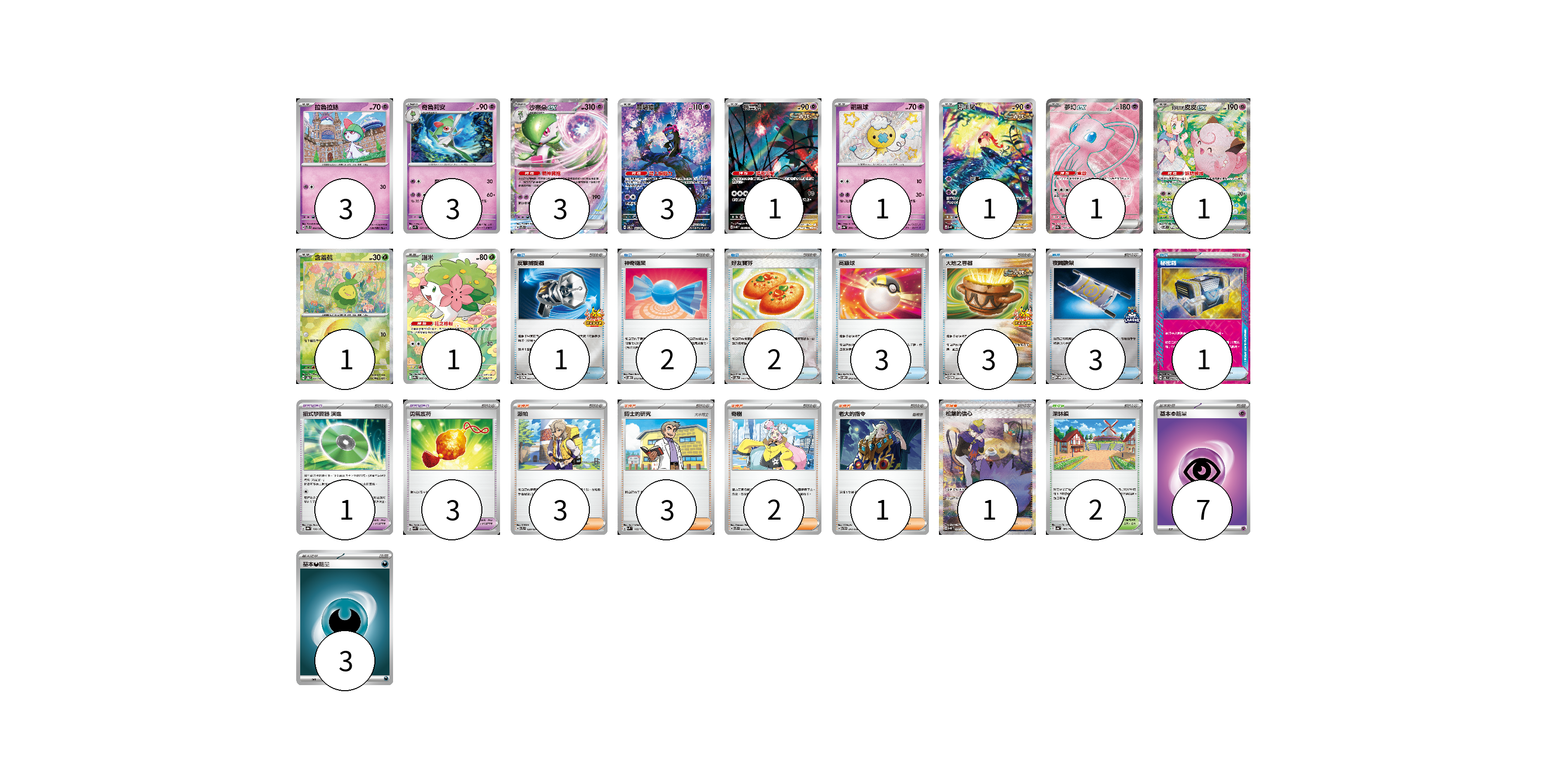 牌組構築方案 以此牌組為基礎新構築牌組 顯示卡面 顯示列表 寶可夢卡(19) 3 3 3 3 1 1 1 1 1 1 1 寶可夢道具(4) 1 3 物品卡(15) 1 2 2 3 3 3 1 支援者卡(10) 3 3 2 1 1 競技場卡(2) 2 能量卡(10) 7 3 寶可夢卡(19) 卡牌名稱 張數 卡牌名稱 張數 拉魯拉絲 SVTS 002/022 03 奇魯莉安 SV1S 027/078 03 沙奈朵ex SVTS 004/022 03 願增猿 SV6 107/101 03 振翼髮 SV5K 076/071 01 飄飄球 SV4a 260/190 01 吼叫尾 SV4K 071/066 01 夢幻ex SV2a 195/165 01 莉莉艾的皮皮ex SV9 126/100 01 含羞苞 SV8a 001/187 01 謝米 SV9a 066/063 01 寶可夢道具(4) 卡牌名稱 張數 卡牌名稱 張數 招式學習器 演進 SV8a 160/187 01 勇氣護符 SVK 024/042 03 物品卡(15) 卡牌名稱 張數 卡牌名稱 張數 反擊捕捉器 SV-P 083/SV-P 01 神奇糖果 SVOD 013/020 02 好友寶芬 SV8a 147/187 02 高級球 SVOM 013/021 03 大地之容器 SV-P 084/SV-P 03 夜間擔架 SV-P 204/SV-P 03 秘密箱 SV6 092/101 01 支援者卡(10) 卡牌名稱 張數 卡牌名稱 張數 派帕 SVTL 020/021 03 博士的研究 SVM 162/175 03 奇樹 SVTS 018/022 02 老大的指令 SVTH 017/018 01 松葉的信心 SV5K 097/071 01 競技場卡(2) 卡牌名稱 張數 卡牌名稱 張數 深缽鎮 SV4a 185/190 02 能量卡(10) 卡牌名稱 張數 卡牌名稱 張數 基本【超】能量 SVB PSY 07 基本惡能量 sv-p DAR 03 以此牌組為基礎新構築牌組 牌組編碼 EdtLcZ-xYLGUD-jgNTmC copy 列印牌組單 牌組編碼已複製 分享至SNS