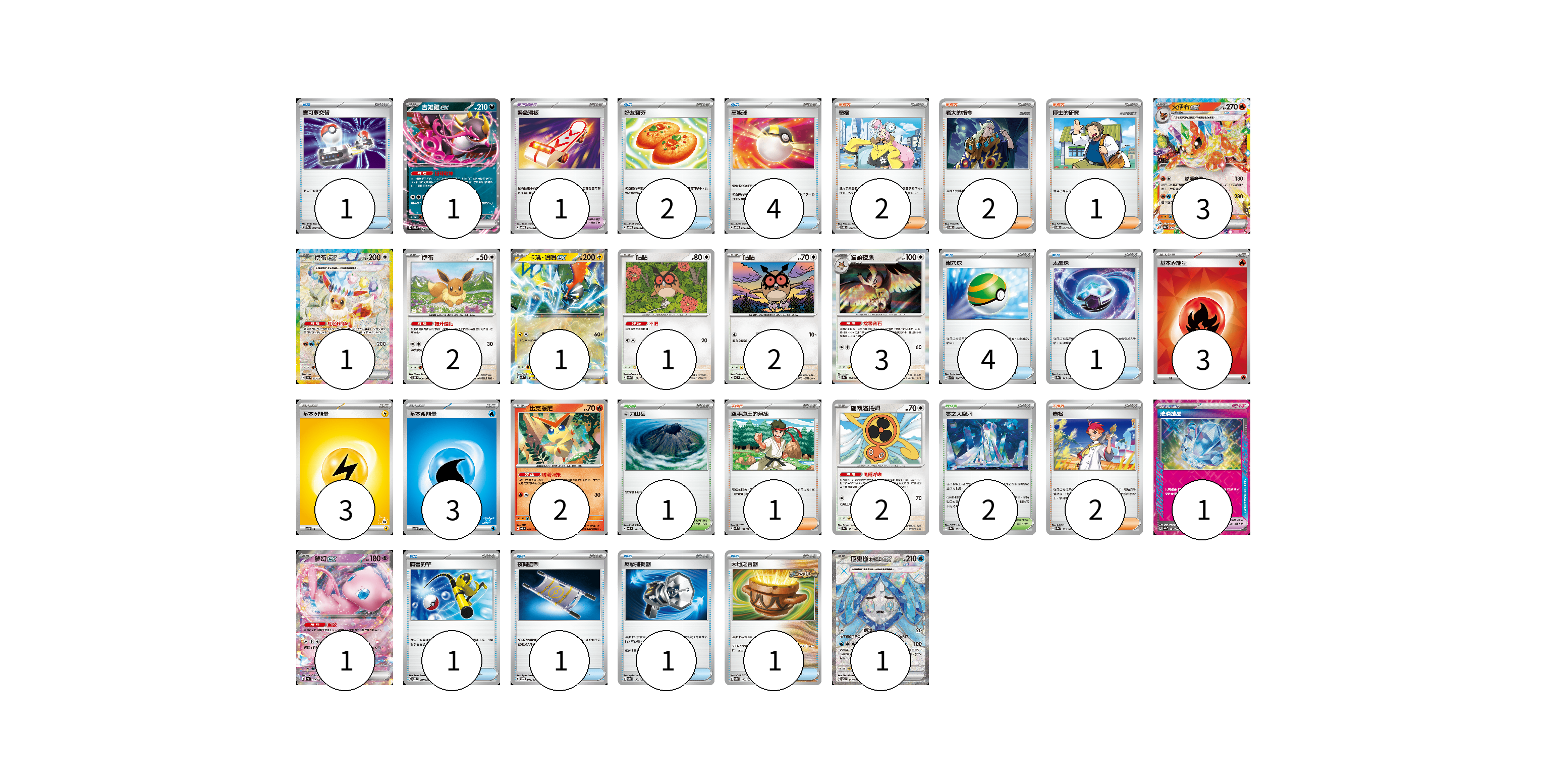 牌組構築方案 以此牌組為基礎新構築牌組 顯示卡面 顯示列表 寶可夢卡(20) 1 3 1 2 1 1 2 3 2 2 1 1 寶可夢道具(2) 1 1 物品卡(16) 1 2 4 4 1 1 1 1 1 支援者卡(8) 2 2 1 1 2 競技場卡(3) 1 2 能量卡(9) 3 3 3 寶可夢卡(20) 卡牌名稱 張數 卡牌名稱 張數 吉雉雞ex SVOD 004/020 01 火伊布ex SV8a 022/187 03 伊布ex SV8a 223/187 01 伊布 SVPN 008/008 02 卡璞・鳴鳴ex SVM 046/175 01 咕咕 SV8a 127/187 01 咕咕 SV7 076/102 02 貓頭夜鷹 SV8a 128/187 03 比克提尼 SV8 012/106 02 旋轉洛托姆 SV8a 131/187 02 夢幻ex SV4a 076/190 01 厄鬼椪 水井面具ex SV6 117/101 01 寶可夢道具(2) 卡牌名稱 張數 卡牌名稱 張數 緊急滑板 SVOD 015/020 01 璀璨結晶 SV8a 152/187 01 物品卡(16) 卡牌名稱 張數 卡牌名稱 張數 寶可夢交替 SV9a 058/063 01 好友寶芬 SVOD 011/020 02 高級球 SVOD 012/020 04 巢穴球 SVK 016/042 04 太晶珠 SV8a 145/187 01 厲害釣竿 SVOD 010/020 01 夜間擔架 SVOM 016/021 01 反擊捕捉器 SV8a 139/187 01 大地之容器 SV8a 143/187 01 支援者卡(8) 卡牌名稱 張數 卡牌名稱 張數 奇樹 SVOD 016/020 02 老大的指令 SVOD 019/020 02 博士的研究 SVOD 017/020 01 空手道王的演練 SVM 147/175 01 赤松 SV8a 163/187 02 競技場卡(3) 卡牌名稱 張數 卡牌名稱 張數 引力山岳 SV8 106/106 01 零之大空洞 SV8a 182/187 02 能量卡(9) 卡牌名稱 張數 卡牌名稱 張數 基本【火】能量 SVK FIR 03 基本【雷】能量 SVI LIG 03 基本【水】能量 SVI WAT 03 以此牌組為基礎新構築牌組 牌組編碼 EefwSF-bAbxyU-EreiUo copy 列印牌組單 牌組編碼已複製 分享至SNS