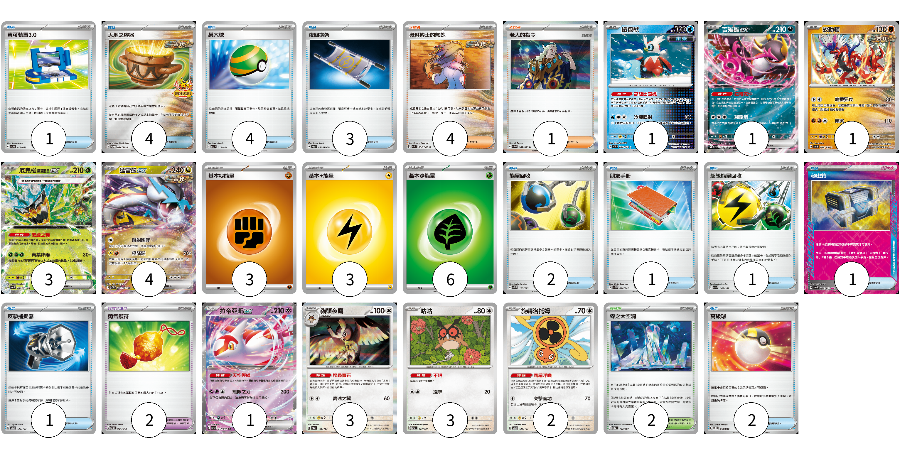 牌組構築方案 以此牌組為基礎新構築牌組 顯示卡面 顯示列表 寶可夢卡(19) 1 1 1 3 4 1 3 3 2 寶可夢道具(2) 2 物品卡(20) 1 4 4 3 2 1 1 1 1 2 支援者卡(5) 4 1 競技場卡(2) 2 能量卡(12) 3 3 6 寶可夢卡(19) 卡牌名稱 張數 卡牌名稱 張數 鐵包袱 SV4M 020/066 01 吉雉雞ex SV6a 038/064 01 故勒頓 SV8 069/106 01 厄鬼椪 碧草面具ex SV6 016/101 03 猛雷鼓ex SV5K 053/071 04 拉帝亞斯ex SV7a 019/064 01 貓頭夜鷹 SV8a 128/187 03 咕咕 SV8a 127/187 03 旋轉洛托姆 SV8a 131/187 02 寶可夢道具(2) 卡牌名稱 張數 卡牌名稱 張數 勇氣護符 SVK 024/042 02 物品卡(20) 卡牌名稱 張數 卡牌名稱 張數 寶可裝置3.0 SVAW 016/023 01 大地之容器 SV-P 084/SV-P 04 巢穴球 SVAL 012/021 04 夜間擔架 SV6a 056/064 03 能量回收 SVM 125/175 02 朋友手冊 SVK 014/042 01 超級能量回收 SV8a 141/187 01 秘密箱 SV6 092/101 01 反擊捕捉器 SV8a 139/187 01 高級球 SVOD 012/020 02 支援者卡(5) 卡牌名稱 張數 卡牌名稱 張數 奧琳博士的氣魄 SV4K 064/066 04 老大的指令 SV1a 069/073 01 競技場卡(2) 卡牌名稱 張數 卡牌名稱 張數 零之大空洞 SV8a 182/187 02 能量卡(12) 卡牌名稱 張數 卡牌名稱 張數 基本【鬥】能量 SVHK FIG 03 基本【雷】能量 SVHM LIG 03 基本【草】能量 SVF GRA 06 以此牌組為基礎新構築牌組 牌組編碼 EjdGtH-lsSwVp-iXZuDk copy 列印牌組單 牌組編碼已複製 分享至SNS