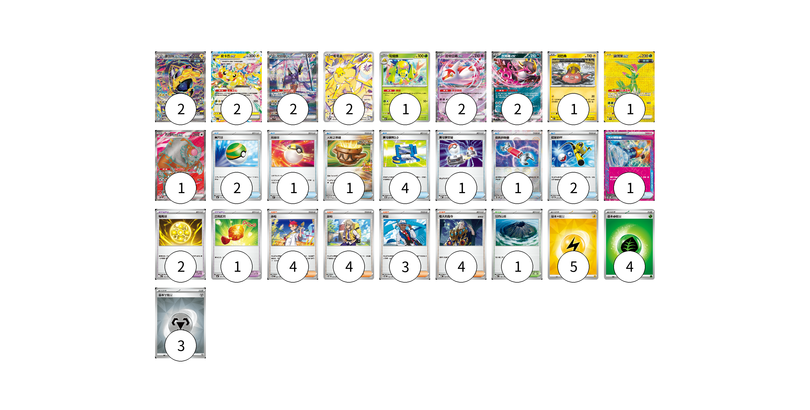牌組構築方案 以此牌組為基礎新構築牌組 顯示卡面 顯示列表 寶可夢卡(16) 2 2 2 2 1 2 2 1 1 1 寶可夢道具(3) 2 1 物品卡(13) 2 1 1 4 1 1 2 1 支援者卡(15) 4 4 3 4 競技場卡(1) 1 能量卡(12) 5 4 3 寶可夢卡(16) 卡牌名稱 張數 卡牌名稱 張數 鐵臂膀ex SV8a 210/187 02 皮卡丘ex M2a 044/193 02 密勒頓ex SV1V 102/078 02 電電蟲 SV7 108/102 02 電蜘蛛 SV6a 002/064 01 拉帝亞斯ex SV7a 019/064 02 吉雉雞ex SV6a 038/064 02 泥巴魚 M2a 050/193 01 鐵斑葉ex SV5M 098/071 01 月月熊 赫月 ex SV5a 084/066 01 寶可夢道具(3) 卡牌名稱 張數 卡牌名稱 張數 電氣球 M2a 163/193 02 勇氣護符 SV4a 169/190 01 物品卡(13) 卡牌名稱 張數 卡牌名稱 張數 巢穴球 SV4a 159/190 02 高級球 SVK 018/042 01 大地之容器 SV-P 084/SV-P 01 寶可裝置3.0 SV11B 081/086 04 寶可夢交替 MBG 015/022 01 道具拆除器 SV11W 080/086 01 厲害釣竿 SVOD 010/020 02 頂尖捕捉器 SV5M 062/071 01 支援者卡(15) 卡牌名稱 張數 卡牌名稱 張數 赤松 SV7 097/102 04 派帕 SVOD 018/020 04 席藍 SV8 102/106 03 老大的指令 MBD 020/022 04 競技場卡(1) 卡牌名稱 張數 卡牌名稱 張數 引力山岳 M2a 183/193 01 能量卡(12) 卡牌名稱 張數 卡牌名稱 張數 基本【雷】能量 SVQP LIG 05 基本【草】能量 M-P GRA 04 基本【鋼】能量 SVK MET 03 以此牌組為基礎新構築牌組 牌組編碼 Entcve-Esoozp-YvGqrf copy 列印牌組單 牌組編碼已複製 分享至SNS