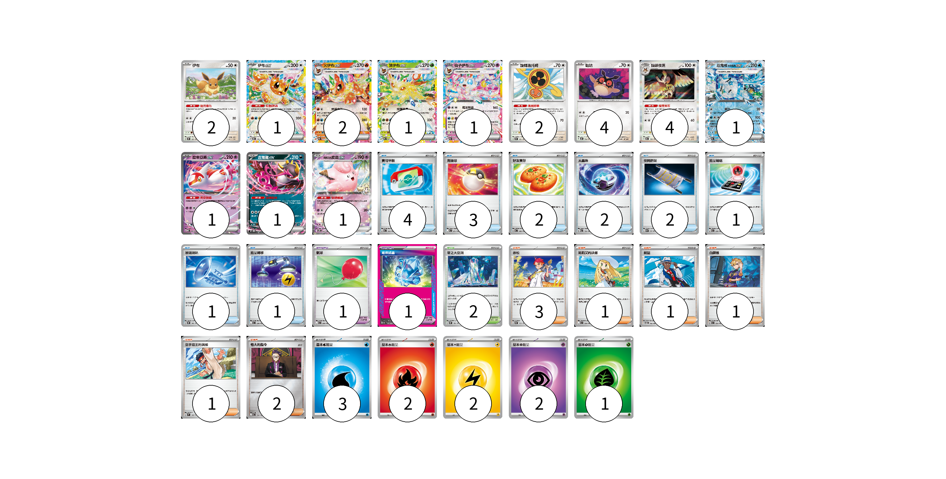 牌組構築方案 以此牌組為基礎新構築牌組 顯示卡面 顯示列表 寶可夢卡(21) 2 1 2 1 1 2 4 4 1 1 1 1 寶可夢道具(2) 1 1 物品卡(16) 4 3 2 2 2 1 1 1 支援者卡(9) 3 1 1 1 1 2 競技場卡(2) 2 能量卡(10) 3 2 2 2 1 寶可夢卡(21) 卡牌名稱 張數 卡牌名稱 張數 伊布 SV8a 125/187 02 伊布ex SV8a 126/187 01 火伊布ex SV8a 022/187 02 葉伊布ex SV8a 003/187 01 仙子伊布ex SV8a 069/187 01 旋轉洛托姆 SV8a 131/187 02 咕咕 SV5K 054/071 04 貓頭夜鷹 SV8a 128/187 04 厄鬼椪 水井面具ex SV8a 050/187 01 拉帝亞斯ex MBD 003/022 01 吉雉雞ex SVOD 004/020 01 莉莉艾的皮皮ex SV9 033/100 01 寶可夢道具(2) 卡牌名稱 張數 卡牌名稱 張數 氣球 MC 688/742 01 璀璨結晶 MC 680/742 01 物品卡(16) 卡牌名稱 張數 卡牌名稱 張數 寶可平板 MC 662/742 04 高級球 MC 651/742 03 好友寶芬 MC 648/742 02 太晶珠 M2a 152/193 02 夜間擔架 SV6a 056/064 02 能量輸送 MC 639/742 01 玻璃喇叭 SV8a 140/187 01 能量轉移 MC 638/742 01 支援者卡(9) 卡牌名稱 張數 卡牌名稱 張數 赤松 SV8a 163/187 03 莉莉艾的決意 MC 729/742 01 席藍 SV8 102/106 01 白蕾雅 MC 722/742 01 空手道王的演練 SVM 145/175 01 老大的指令 MC 724/742 02 競技場卡(2) 卡牌名稱 張數 卡牌名稱 張數 零之大空洞 SV8a 182/187 02 能量卡(10) 卡牌名稱 張數 卡牌名稱 張數 基本【水】能量 MC WAT 03 基本【火】能量 SVTL FIR 02 基本【雷】能量 SVHM LIG 02 基本【超】能量 SVHM PSY 02 基本【草】能量 SVTM GRA 01 以此牌組為基礎新構築牌組 牌組編碼 ErbpmY-DoWPVQ-QmehYN copy 列印牌組單 牌組編碼已複製 分享至SNS
