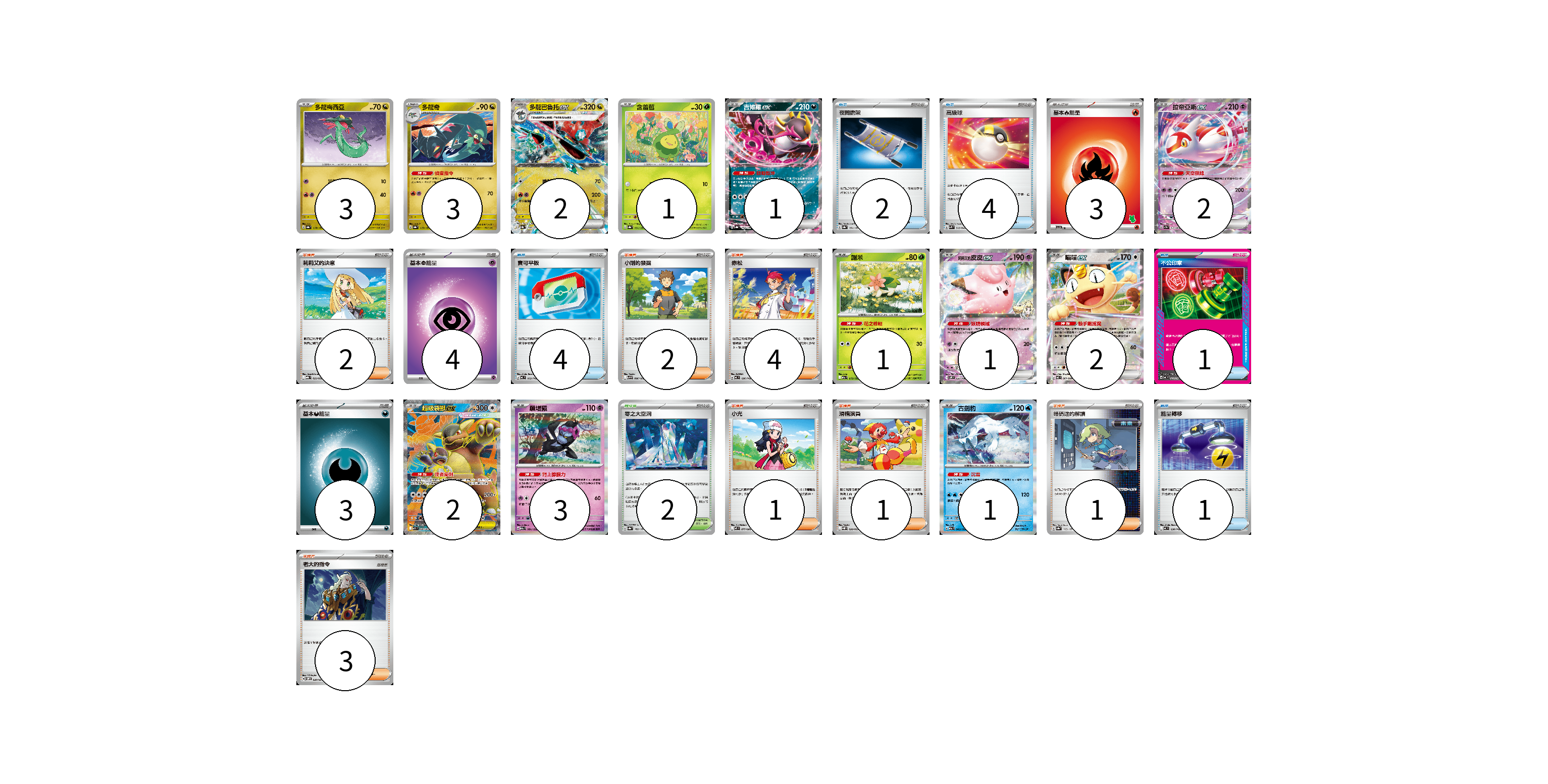 牌組構築方案 以此牌組為基礎新構築牌組 顯示卡面 顯示列表 寶可夢卡(22) 3 3 2 1 1 2 1 1 2 2 3 1 物品卡(12) 2 4 4 1 1 支援者卡(14) 2 2 4 1 1 1 3 競技場卡(2) 2 能量卡(10) 3 4 3 寶可夢卡(22) 卡牌名稱 張數 卡牌名稱 張數 多龍梅西亞 SV8a 118/187 03 多龍奇 SV8a 119/187 03 多龍巴魯托ex SV8a 120/187 02 含羞苞 SV8a 001/187 01 吉雉雞ex SV8a 104/187 01 拉帝亞斯ex SV7a 019/064 02 謝米 M2a 012/193 01 莉莉艾的皮皮ex SV9 033/100 01 喵喵ex M3 061/080 02 超級袋獸ex M1S 080/063 02 願增猿 M2a 081/193 03 古劍豹 M2a 043/193 01 物品卡(12) 卡牌名稱 張數 卡牌名稱 張數 夜間擔架 SV8a 151/187 02 高級球 SVK 018/042 04 寶可平板 MC 662/742 04 不公印章 MC 633/742 01 能量轉移 MC 638/742 01 支援者卡(14) 卡牌名稱 張數 卡牌名稱 張數 莉莉艾的決意 MBG 022/022 02 小剛的發掘 SV9 096/100 02 赤松 MC 696/742 04 小光 M2 077/080 01 滑稽演員 SVQP 020/023 01 暗碼迷的解讀 SV8a 165/187 01 老大的指令 SVOM 020/021 03 競技場卡(2) 卡牌名稱 張數 卡牌名稱 張數 零之大空洞 SV8a 182/187 02 能量卡(10) 卡牌名稱 張數 卡牌名稱 張數 基本【火】能量 SVI FIR 03 基本【超】能量 M-P PSY 04 基本【惡】能量 MC DAR 03 以此牌組為基礎新構築牌組 牌組編碼 EsGLnC-dwHFvZ-sikkXS copy 列印牌組單 牌組編碼已複製 分享至SNS