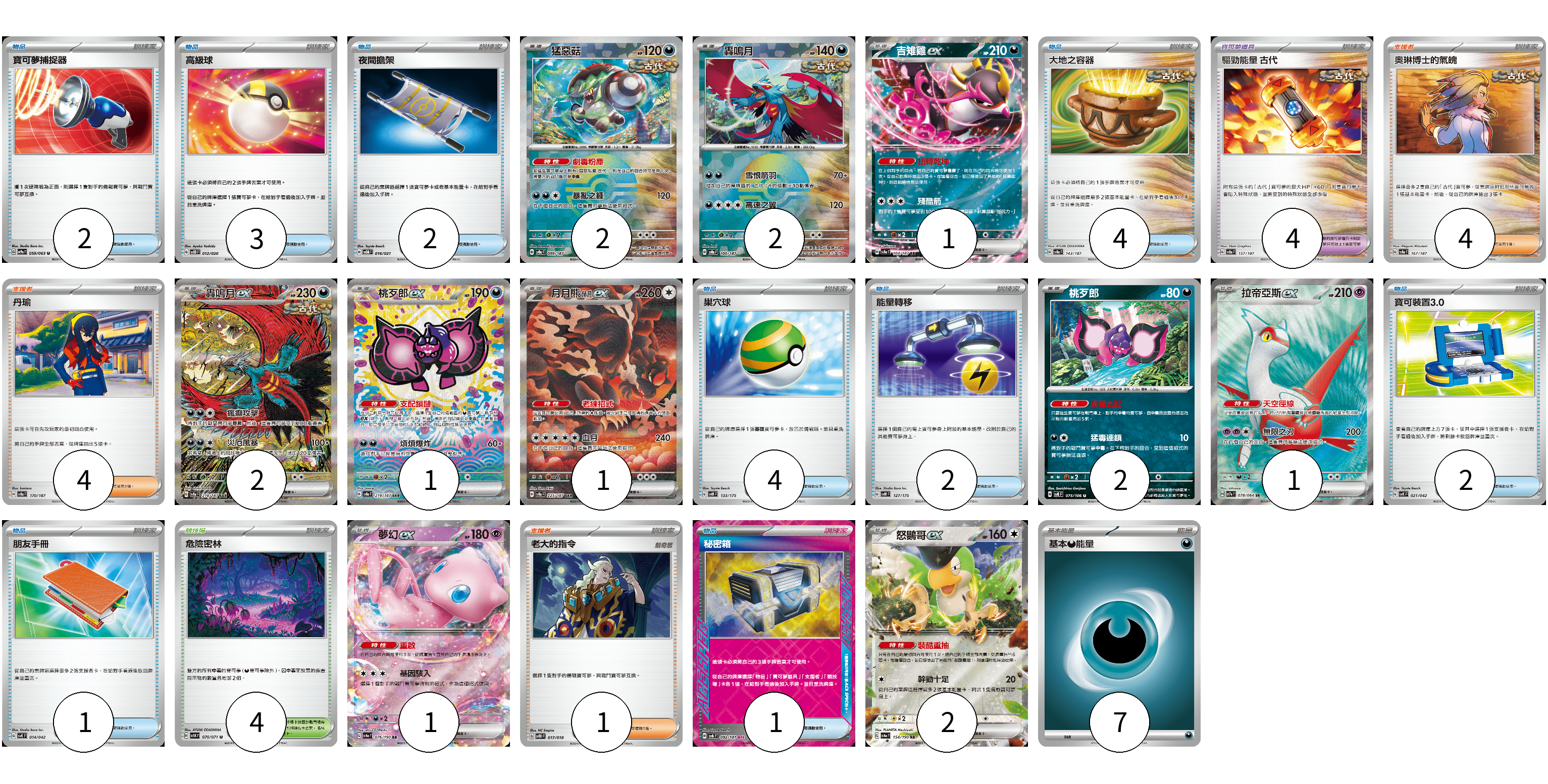 牌組構築方案 以此牌組為基礎新構築牌組 顯示卡面 顯示列表 寶可夢卡(15) 2 2 1 2 1 1 2 1 1 2 寶可夢道具(4) 4 物品卡(21) 2 3 2 4 4 2 2 1 1 支援者卡(9) 4 4 1 競技場卡(4) 4 能量卡(7) 7 寶可夢卡(15) 卡牌名稱 張數 卡牌名稱 張數 猛惡菇 SV8a 099/187 02 轟鳴月 SV8a 100/187 02 吉雉雞ex SV8a 104/187 01 轟鳴月ex SV8a 218/187 02 桃歹郎ex SV8a 219/187 01 月月熊 赫月ex SV8a 225/187 01 桃歹郎 SV8 075/106 02 拉帝亞斯ex SV7a 078/064 01 夢幻ex SV4a 076/190 01 怒鸚哥ex SV4a 154/190 02 寶可夢道具(4) 卡牌名稱 張數 卡牌名稱 張數 驅勁能量 古代 SV8a 157/187 04 物品卡(21) 卡牌名稱 張數 卡牌名稱 張數 寶可夢捕捉器 SV9a 059/063 02 高級球 SVOD 012/020 03 夜間擔架 SVOM 016/021 02 大地之容器 SV8a 143/187 04 巢穴球 SVM 133/175 04 能量轉移 SVM 127/175 02 寶可裝置3.0 SVK 021/042 02 朋友手冊 SVK 014/042 01 秘密箱 SV6 092/101 01 支援者卡(9) 卡牌名稱 張數 卡牌名稱 張數 奧琳博士的氣魄 SV8a 167/187 04 丹瑜 SV8a 170/187 04 老大的指令 SVTH 017/018 01 競技場卡(4) 卡牌名稱 張數 卡牌名稱 張數 危險密林 SV5K 070/071 04 能量卡(7) 卡牌名稱 張數 卡牌名稱 張數 基本惡能量 sv-p DAR 07 以此牌組為基礎新構築牌組 牌組編碼 EyqvLc-bSZNUF-ggClCv copy 列印牌組單 牌組編碼已複製 分享至SNS