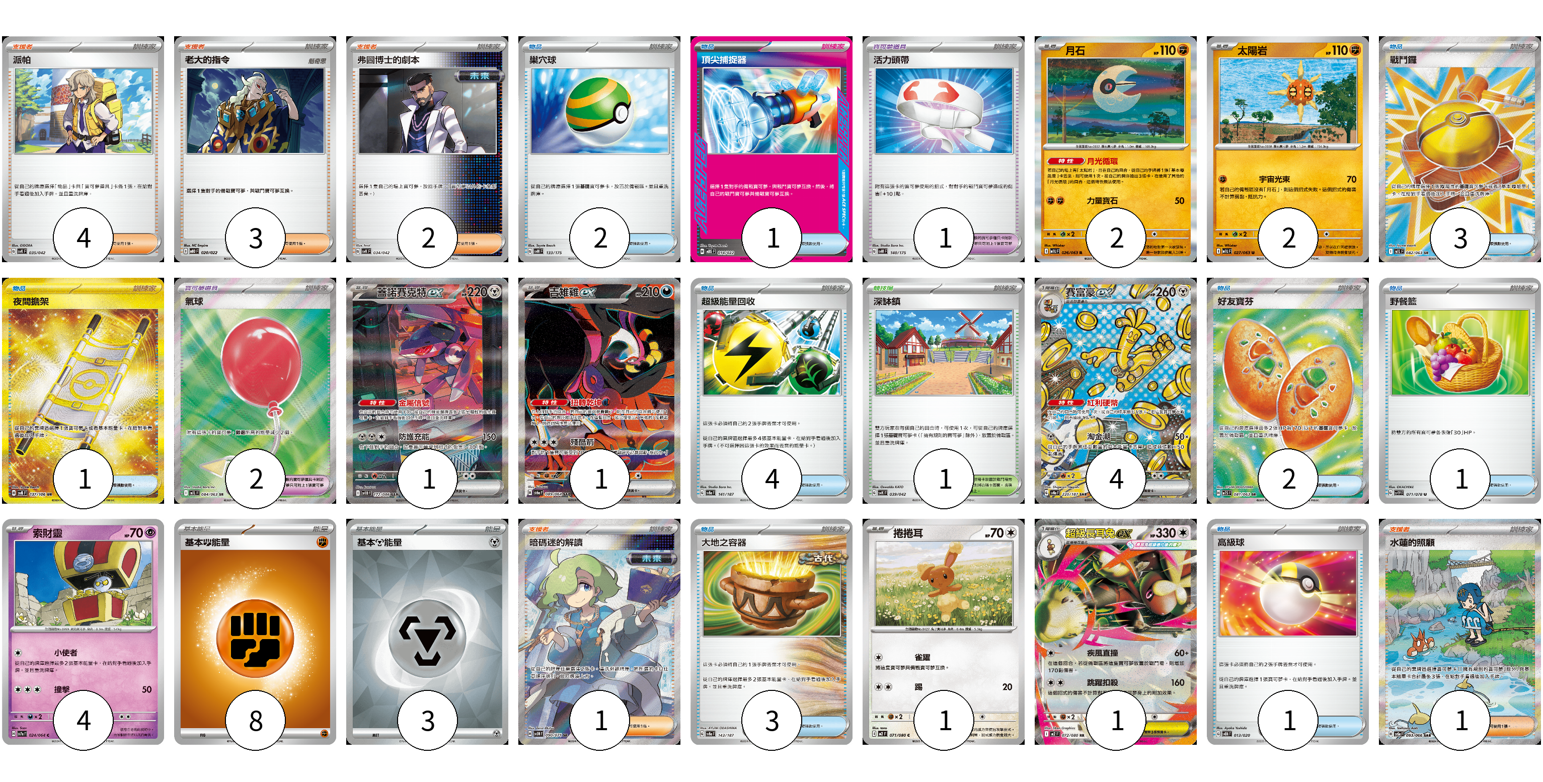 牌組構築方案 以此牌組為基礎新構築牌組 顯示卡面 顯示列表 寶可夢卡(16) 2 2 1 1 4 4 1 1 寶可夢道具(3) 1 2 物品卡(18) 2 1 3 1 4 2 1 3 1 支援者卡(11) 4 3 2 1 1 競技場卡(1) 1 能量卡(11) 8 3 寶可夢卡(16) 卡牌名稱 張數 卡牌名稱 張數 月石 M1L 026/063 02 太陽岩 M1L 027/063 02 蓋諾賽克特ex SV11B 172/086 01 吉雉雞ex SV6a 089/064 01 賽富豪ex SV8a 220/187 04 索財靈 SV7a 024/064 04 捲捲耳 M2 071/080 01 超級長耳兔ex M2 072/080 01 寶可夢道具(3) 卡牌名稱 張數 卡牌名稱 張數 活力頭帶 SVM 140/175 01 氣球 M1L 084/063 02 物品卡(18) 卡牌名稱 張數 卡牌名稱 張數 巢穴球 SVM 133/175 02 頂尖捕捉器 MBG 014/022 01 戰鬥鑼 M1L 082/063 03 夜間擔架 SV8 137/106 01 超級能量回收 SV8a 141/187 04 好友寶芬 M1S 081/063 02 野餐籃 SV1V 071/078 01 大地之容器 SV8a 143/187 03 高級球 SVEM 013/020 01 支援者卡(11) 卡牌名稱 張數 卡牌名稱 張數 派帕 SVK 035/042 04 老大的指令 MBD 020/022 03 弗圖博士的劇本 SVK 034/042 02 暗碼迷的解讀 SV5M 090/071 01 水蓮的照顧 SV5a 093/066 01 競技場卡(1) 卡牌名稱 張數 卡牌名稱 張數 深缽鎮 SVK 039/042 01 能量卡(11) 卡牌名稱 張數 卡牌名稱 張數 基本【鬥】能量 M-P FIG 08 基本【鋼】能量 SVOD MET 03 以此牌組為基礎新構築牌組 牌組編碼 EzjmNd-hHWQUR-TnPTVs copy 列印牌組單 牌組編碼已複製 分享至SNS
