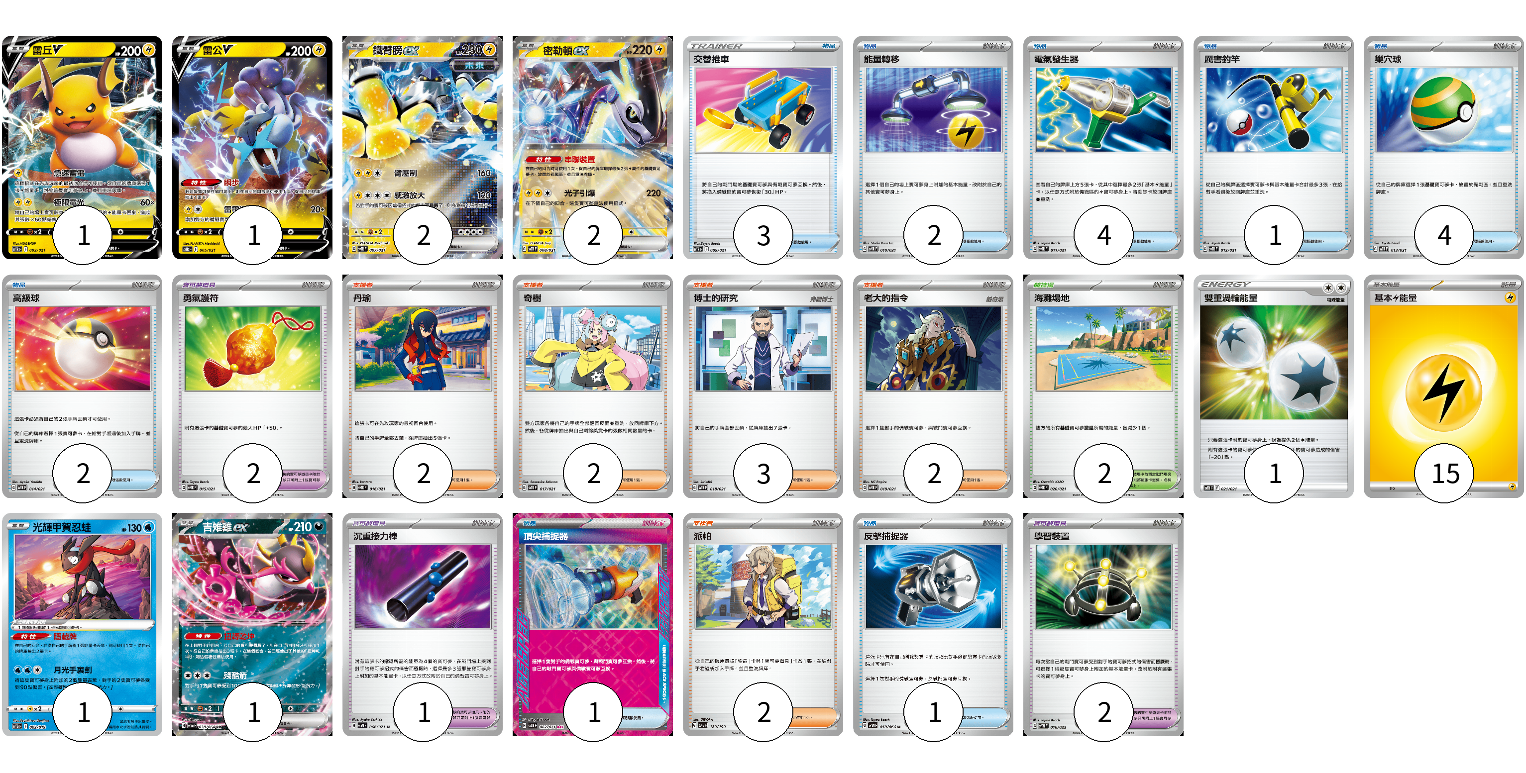 牌組構築方案 以此牌組為基礎新構築牌組 顯示卡面 顯示列表 寶可夢卡(8) 1 1 2 2 1 1 寶可夢道具(5) 2 1 2 物品卡(18) 3 2 4 1 4 2 1 1 支援者卡(11) 2 2 3 2 2 競技場卡(2) 2 能量卡(16) 1 15 寶可夢卡(8) 卡牌名稱 張數 卡牌名稱 張數 雷丘V SVTR 003/021 01 雷公V SVTR 005/021 01 鐵臂膀ex SVTR 007/021 02 密勒頓ex SVTR 008/021 02 光輝甲賀忍蛙 SVTG 002/019 01 吉雉雞ex SV6a 038/064 01 寶可夢道具(5) 卡牌名稱 張數 卡牌名稱 張數 勇氣護符 SVTR 015/021 02 沉重接力棒 SV5M 066/071 01 學習裝置 SVTM 016/022 02 物品卡(18) 卡牌名稱 張數 卡牌名稱 張數 交替推車 SVTR 009/021 03 能量轉移 SVTR 010/021 02 電氣發生器 SVTR 011/021 04 厲害釣竿 SVTR 012/021 01 巢穴球 SVTR 013/021 04 高級球 SVTR 014/021 02 頂尖捕捉器 SV5M 062/071 01 反擊捕捉器 SV4M 059/066 01 支援者卡(11) 卡牌名稱 張數 卡牌名稱 張數 丹瑜 SVTR 016/021 02 奇樹 SVTR 017/021 02 博士的研究 SVTR 018/021 03 老大的指令 SVTR 019/021 02 派帕 SV4a 180/190 02 競技場卡(2) 卡牌名稱 張數 卡牌名稱 張數 海灘場地 SVTR 020/021 02 能量卡(16) 卡牌名稱 張數 卡牌名稱 張數 雙重渦輪能量 SVTR 021/021 01 基本【雷】能量 SVTR LIG 15 以此牌組為基礎新構築牌組 牌組編碼 FCbFHC-LuWxfu-gCSmke copy 列印牌組單 牌組編碼已複製 分享至SNS