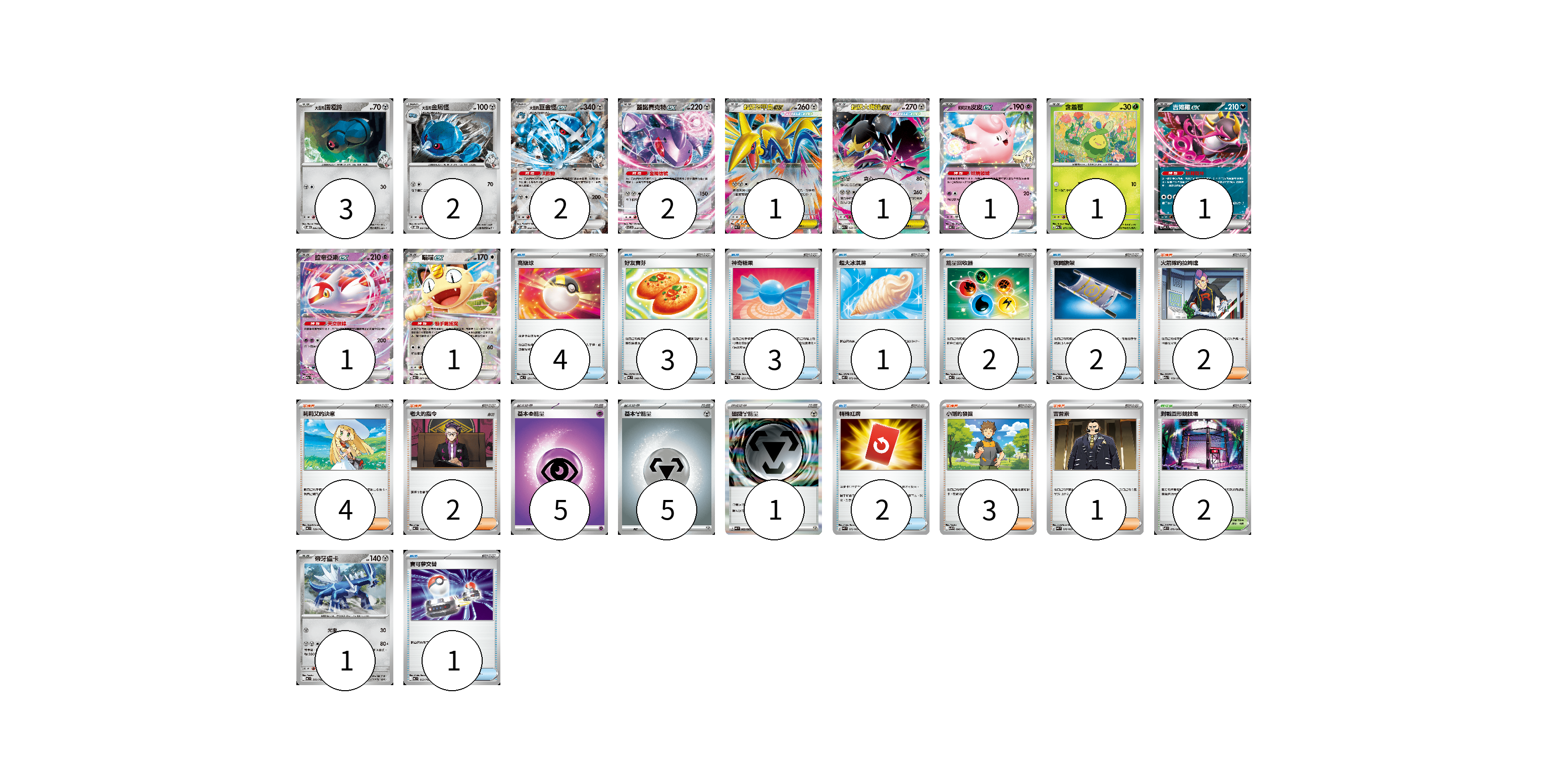 牌組構築方案 以此牌組為基礎新構築牌組 顯示卡面 顯示列表 寶可夢卡(17) 3 2 2 2 1 1 1 1 1 1 1 1 物品卡(18) 4 3 3 1 2 2 2 1 支援者卡(12) 2 4 2 3 1 競技場卡(2) 2 能量卡(11) 5 5 1 寶可夢卡(17) 卡牌名稱 張數 卡牌名稱 張數 <大吾的>鐵啞鈴 SVOD 006/020 03 <大吾的>金屬怪 SVOD 007/020 02 <大吾的>巨金怪ex SVOD 008/020 02 蓋諾賽克特ex SV11B 069/086 02 超級盔甲鳥ex M3 054/080 01 超級大嘴娃ex M1L 046/063 01 莉莉艾的皮皮ex MC 287/742 01 含羞苞 M2a 011/193 01 吉雉雞ex MC 489/742 01 拉帝亞斯ex M2a 075/193 01 喵喵ex M3 061/080 01 帝牙盧卡 MC 502/742 01 物品卡(18) 卡牌名稱 張數 卡牌名稱 張數 高級球 MC 651/742 04 好友寶芬 MC 648/742 03 神奇糖果 MC 655/742 03 超大冰淇淋 M2 073/080 01 能量回收器 MC 640/742 02 夜間擔架 MC 670/742 02 特殊紅牌 M4 072/083 02 寶可夢交替 MC 663/742 01 支援者卡(12) 卡牌名稱 張數 卡牌名稱 張數 火箭隊的拉姆達 M2a 179/193 02 莉莉艾的決意 MC 729/742 04 老大的指令 MC 724/742 02 小剛的發掘 SV9 096/100 03 吉普索 M4 076/083 01 競技場卡(2) 卡牌名稱 張數 卡牌名稱 張數 對戰圓形競技場 M2 079/080 02 能量卡(11) 卡牌名稱 張數 卡牌名稱 張數 基本【超】能量 MC PSY 05 基本【鋼】能量 MC MET 05 磁鐵【鋼】能量 M4 083/083 01 以此牌組為基礎新構築牌組 牌組編碼 FDfEAj-nUPTit-JAChVi copy 列印牌組單 牌組編碼已複製 分享至SNS
