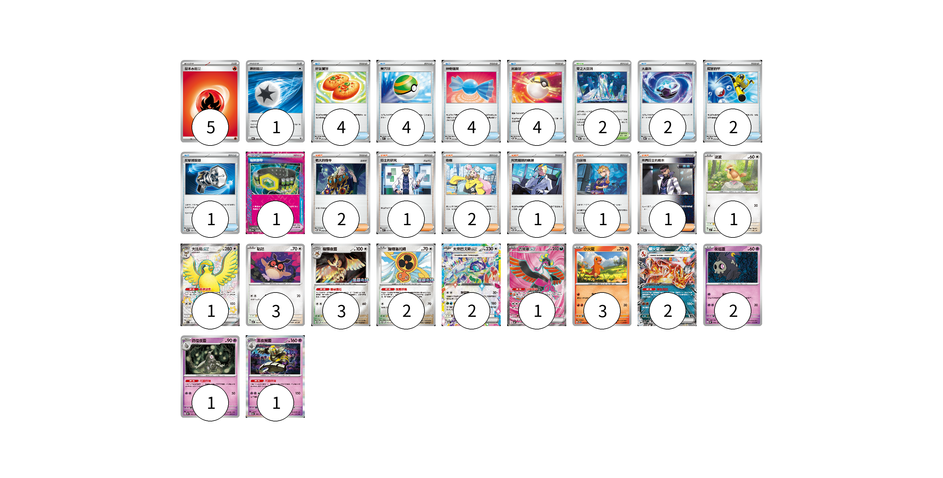 牌組構築方案 以此牌組為基礎新構築牌組 顯示卡面 顯示列表 寶可夢卡(22) 1 1 3 3 2 2 1 3 2 2 1 1 寶可夢道具(1) 1 物品卡(21) 4 4 4 4 2 2 1 支援者卡(8) 2 1 2 1 1 1 競技場卡(2) 2 能量卡(6) 5 1 寶可夢卡(22) 卡牌名稱 張數 卡牌名稱 張數 波波 SV3 087/108 01 大比鳥ex SV4a 335/190 01 咕咕 SV5K 054/071 03 貓頭夜鷹 SV-P 145/SV-P 03 旋轉洛托姆 SV-P 146/SV-P 02 太樂巴戈斯ex SV8a 136/187 02 吉雉雞ex SV6a 081/064 01 小火龍 SVTL 001/021 03 噴火龍ex SVTL 006/021 02 夜巡靈 SV8a 064/187 02 彷徨夜靈 SV8a 065/187 01 黑夜魔靈 SV8a 066/187 01 寶可夢道具(1) 卡牌名稱 張數 卡牌名稱 張數 極限腰帶 SV8a 159/187 01 物品卡(21) 卡牌名稱 張數 卡牌名稱 張數 好友寶芬 SVOD 011/020 04 巢穴球 SVM 133/175 04 神奇糖果 SVOD 013/020 04 高級球 SVOD 012/020 04 太晶珠 SV8a 145/187 02 厲害釣竿 SVOD 010/020 02 反擊捕捉器 SV8a 139/187 01 支援者卡(8) 卡牌名稱 張數 卡牌名稱 張數 老大的指令 SVOD 019/020 02 博士的研究 SVK 033/042 01 奇樹 SVM 160/175 02 阿克羅瑪的執著 SVOM 017/021 01 白蕾雅 SV8a 176/187 01 弗圖博士的劇本 SV8a 175/187 01 競技場卡(2) 卡牌名稱 張數 卡牌名稱 張數 零之大空洞 SV8a 182/187 02 能量卡(6) 卡牌名稱 張數 卡牌名稱 張數 基本火能量 sv-p FIR 05 噴射能量 SV8a 185/187 01 以此牌組為基礎新構築牌組 牌組編碼 FEhdXB-vfxiqB-eFaAjB copy 列印牌組單 牌組編碼已複製 分享至SNS