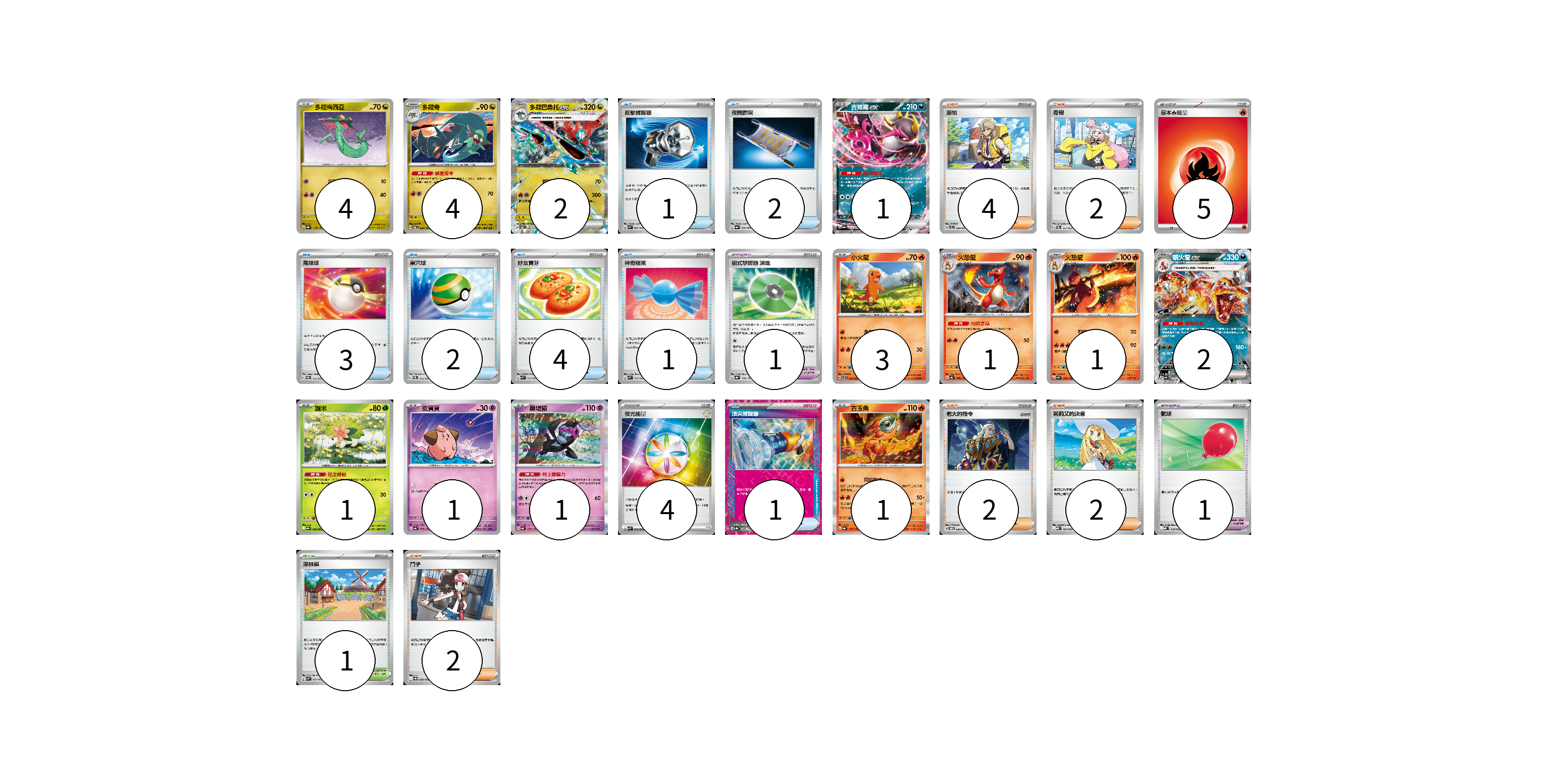 牌組構築方案 以此牌組為基礎新構築牌組 顯示卡面 顯示列表 寶可夢卡(22) 4 4 2 1 3 1 1 2 1 1 1 1 寶可夢道具(1) 1 物品卡(15) 1 2 3 2 4 1 1 1 支援者卡(12) 4 2 2 2 2 競技場卡(1) 1 能量卡(9) 5 4 寶可夢卡(22) 卡牌名稱 張數 卡牌名稱 張數 多龍梅西亞 SV8a 118/187 04 多龍奇 SV6 080/101 04 多龍巴魯托ex SV6 081/101 02 吉雉雞ex SV6a 038/064 01 小火龍 SVTL 001/021 03 火恐龍 SV4a 026/190 01 火恐龍 SV2a 005/165 01 噴火龍ex SV4a 115/190 02 謝米 SV9a 006/063 01 皮寶寶 SV4a 077/190 01 願增猿 SV8a 075/187 01 古玉魚 SV8a 025/187 01 寶可夢道具(1) 卡牌名稱 張數 卡牌名稱 張數 招式學習器 演進 SV8a 160/187 01 物品卡(15) 卡牌名稱 張數 卡牌名稱 張數 反擊捕捉器 SVK 009/042 01 夜間擔架 SV6a 056/064 02 高級球 SVEM 013/020 03 巢穴球 SVEM 012/020 02 好友寶芬 SVK 015/042 04 神奇糖果 SVK 019/042 01 頂尖捕捉器 SV8a 148/187 01 氣球 MBD 018/022 01 支援者卡(12) 卡牌名稱 張數 卡牌名稱 張數 派帕 SVTL 020/021 04 奇樹 SVEM 017/020 02 老大的指令 SVOM 020/021 02 莉莉艾的決意 MBD 021/022 02 鬥子 SV11W 085/086 02 競技場卡(1) 卡牌名稱 張數 卡牌名稱 張數 深缽鎮 SVK 039/042 01 能量卡(9) 卡牌名稱 張數 卡牌名稱 張數 基本火能量 sv-p FIR 05 夜光能量 SVK 042/042 04 以此牌組為基礎新構築牌組 牌組編碼 FGrKaI-NChqzZ-LsHceh copy 列印牌組單 牌組編碼已複製 分享至SNS