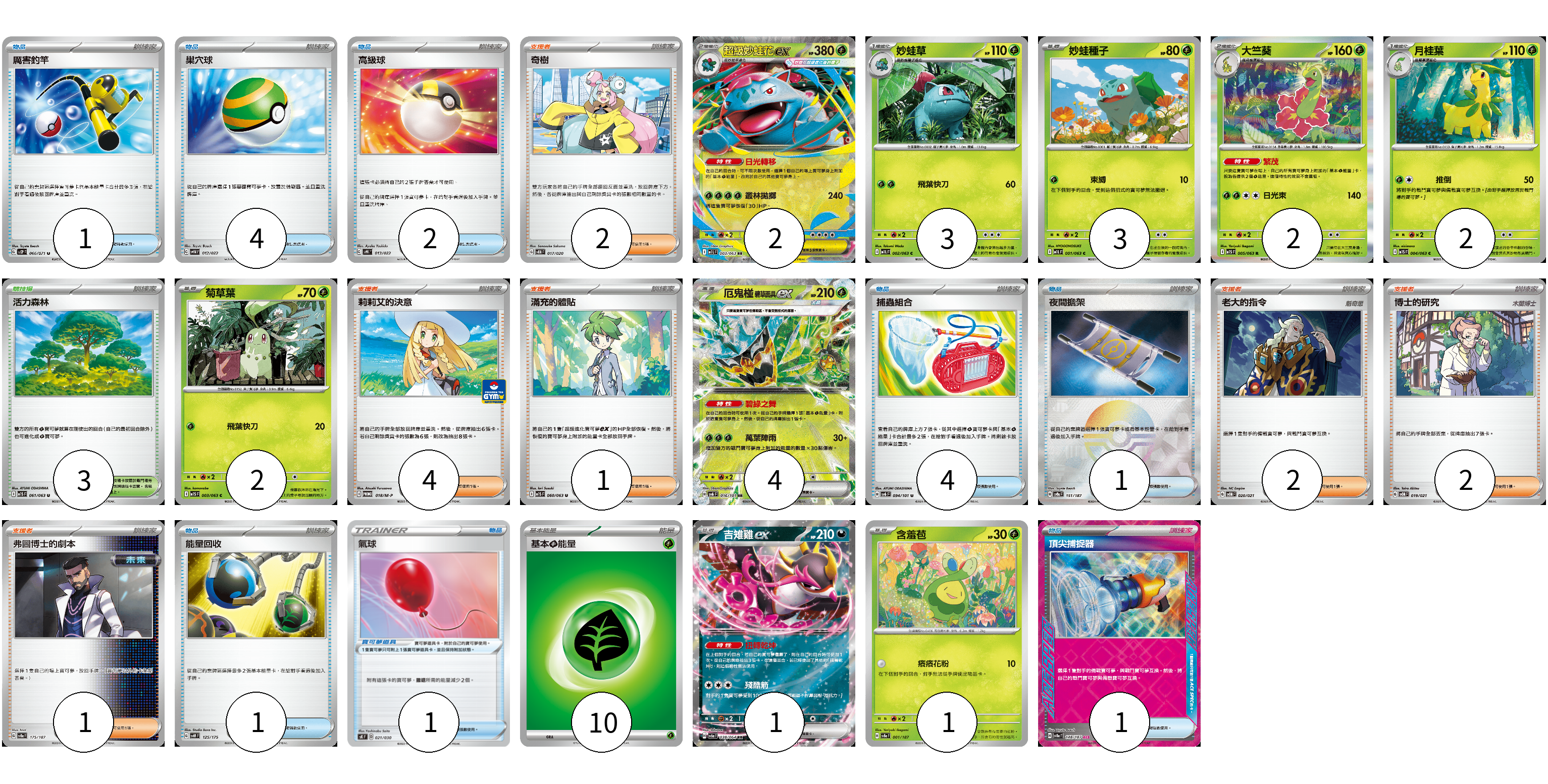 牌組構築方案 以此牌組為基礎新構築牌組 顯示卡面 顯示列表 寶可夢卡(20) 2 3 3 2 2 2 4 1 1 寶可夢道具(1) 1 物品卡(14) 1 4 2 4 1 1 1 支援者卡(12) 2 4 1 2 2 1 競技場卡(3) 3 能量卡(10) 10 寶可夢卡(20) 卡牌名稱 張數 卡牌名稱 張數 超級妙蛙花ex M1L 003/063 02 妙蛙草 M1L 002/063 03 妙蛙種子 M1L 001/063 03 大竺葵 M1S 005/063 02 月桂葉 M1S 004/063 02 菊草葉 M1S 003/063 02 厄鬼椪 碧草面具ex SV6 016/101 04 吉雉雞ex SV6a 038/064 01 含羞苞 SV8a 001/187 01 寶可夢道具(1) 卡牌名稱 張數 卡牌名稱 張數 氣球 SK 021/030 01 物品卡(14) 卡牌名稱 張數 卡牌名稱 張數 厲害釣竿 SV2P 066/071 01 巢穴球 SVHM 012/022 04 高級球 SVHK 013/022 02 捕蟲組合 SV6 094/101 04 夜間擔架 SV8a 151/187 01 能量回收 SVM 125/175 01 頂尖捕捉器 SV8a 148/187 01 支援者卡(12) 卡牌名稱 張數 卡牌名稱 張數 奇樹 SVEM 017/020 02 莉莉艾的決意 M-P 018/M-P 04 滿充的體貼 M1S 060/063 01 老大的指令 SVOM 020/021 02 博士的研究 SVOM 019/021 02 弗圖博士的劇本 SV8a 175/187 01 競技場卡(3) 卡牌名稱 張數 卡牌名稱 張數 活力森林 M1S 061/063 03 能量卡(10) 卡牌名稱 張數 卡牌名稱 張數 基本【草】能量 SVTM GRA 10 以此牌組為基礎新構築牌組 牌組編碼 FKKpak-eNFflt-ZOLyEl copy 列印牌組單 牌組編碼已複製 分享至SNS