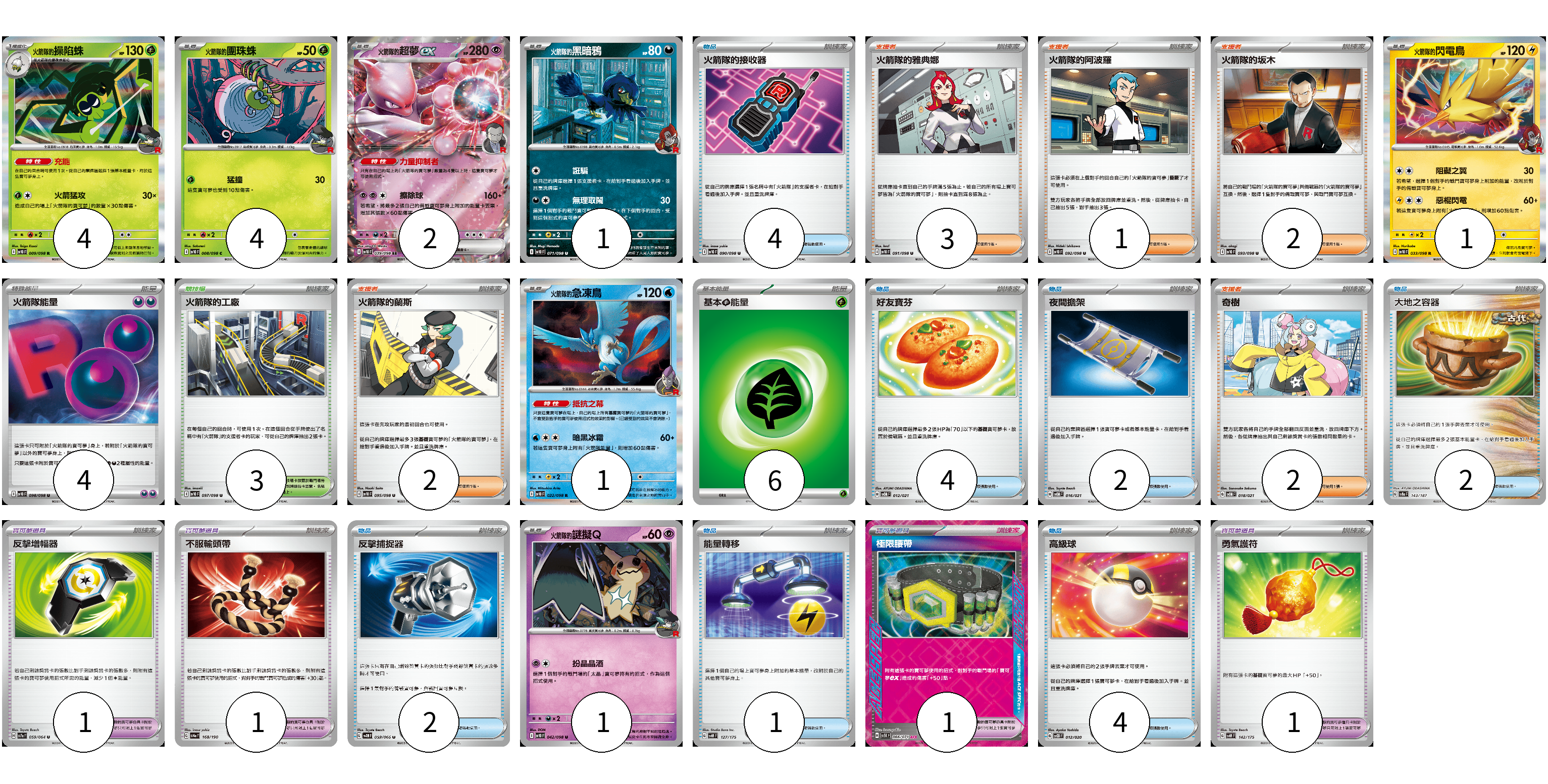 牌組構築方案 以此牌組為基礎新構築牌組 顯示卡面 顯示列表 寶可夢卡(14) 4 4 2 1 1 1 1 寶可夢道具(4) 1 1 1 1 物品卡(19) 4 4 2 2 2 1 4 支援者卡(10) 3 1 2 2 2 競技場卡(3) 3 能量卡(10) 4 6 寶可夢卡(14) 卡牌名稱 張數 卡牌名稱 張數 <火箭隊的>操陷蛛 SV10 009/098 04 <火箭隊的>團珠蛛 SV10 008/098 04 <火箭隊的>超夢ex SV10 039/098 02 <火箭隊的>黑暗鴉 SV10 071/098 01 <火箭隊的>閃電鳥 SV10 033/098 01 <火箭隊的>急凍鳥 SV10 022/098 01 <火箭隊的>謎擬Q SV10 042/098 01 寶可夢道具(4) 卡牌名稱 張數 卡牌名稱 張數 反擊增幅器 SV7a 059/064 01 不服輸頭帶 SV4a 168/190 01 極限腰帶 SV5K 066/071 01 勇氣護符 SVM 142/175 01 物品卡(19) 卡牌名稱 張數 卡牌名稱 張數 火箭隊的接收器 SV10 090/098 04 好友寶芬 SVOM 012/021 04 夜間擔架 SVOM 016/021 02 大地之容器 SV8a 143/187 02 反擊捕捉器 SV4M 059/066 02 能量轉移 SVM 127/175 01 高級球 SVOD 012/020 04 支援者卡(10) 卡牌名稱 張數 卡牌名稱 張數 火箭隊的雅典娜 SV10 091/098 03 火箭隊的阿波羅 SV10 092/098 01 火箭隊的坂木 SV10 093/098 02 火箭隊的蘭斯 SV10 095/098 02 奇樹 SVOM 018/021 02 競技場卡(3) 卡牌名稱 張數 卡牌名稱 張數 火箭隊的工廠 SV10 097/098 03 能量卡(10) 卡牌名稱 張數 卡牌名稱 張數 火箭隊能量 SV10 098/098 04 基本【草】能量 SVTM GRA 06 以此牌組為基礎新構築牌組 牌組編碼 FLwHvI-KIjoio-julcSK copy 列印牌組單 牌組編碼已複製 分享至SNS