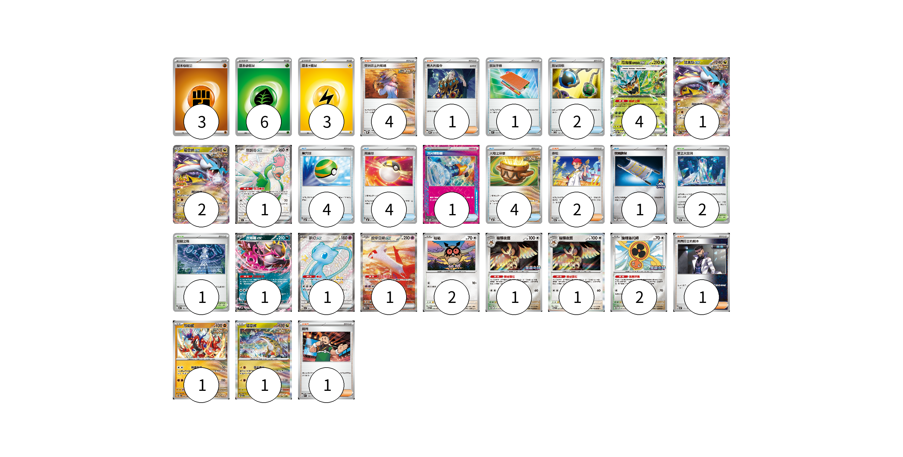 牌組構築方案 以此牌組為基礎新構築牌組 顯示卡面 顯示列表 寶可夢卡(19) 4 1 2 1 1 1 1 2 1 1 2 1 1 物品卡(17) 1 2 4 4 1 4 1 支援者卡(9) 4 1 2 1 1 競技場卡(3) 2 1 能量卡(12) 3 6 3 寶可夢卡(19) 卡牌名稱 張數 卡牌名稱 張數 厄鬼椪 碧草面具ex SV6 016/101 04 猛雷鼓ex SV5K 053/071 01 猛雷鼓ex SV-P 081/SV-P 02 怒鸚哥ex SV4a 337/190 01 吉雉雞ex SV8a 104/187 01 夢幻ex SV4a 327/190 01 拉帝亞斯ex SV7a 087/064 01 咕咕 SV7 076/102 02 貓頭夜鷹 SV-P 145/SV-P 01 貓頭夜鷹 SV7 077/102 01 旋轉洛托姆 SV-P 146/SV-P 02 故勒頓 SV8 069/106 01 猛雷鼓 SV7 075/102 01 物品卡(17) 卡牌名稱 張數 卡牌名稱 張數 朋友手冊 SV1S 069/078 01 能量回收 SVD 110/139 02 巢穴球 SVHK 012/022 04 高級球 SVHK 013/022 04 頂尖捕捉器 SV5M 062/071 01 大地之容器 SVHK 011/022 04 夜間擔架 SV-P 204/SV-P 01 支援者卡(9) 卡牌名稱 張數 卡牌名稱 張數 奧琳博士的氣魄 SVHK 017/022 04 老大的指令 SVHK 022/022 01 赤松 SV8a 163/187 02 弗圖博士的劇本 SV8a 175/187 01 裁判 SVM 154/175 01 競技場卡(3) 卡牌名稱 張數 卡牌名稱 張數 零之大空洞 SV8a 182/187 02 阻礙之塔 SV8a 181/187 01 能量卡(12) 卡牌名稱 張數 卡牌名稱 張數 基本【鬥】能量 SVHK FIG 03 基本【草】能量 SVF GRA 06 基本【雷】能量 SVF LIG 03 以此牌組為基礎新構築牌組 牌組編碼 FOdHnp-HNCzrM-iXhoNb copy 列印牌組單 牌組編碼已複製 分享至SNS