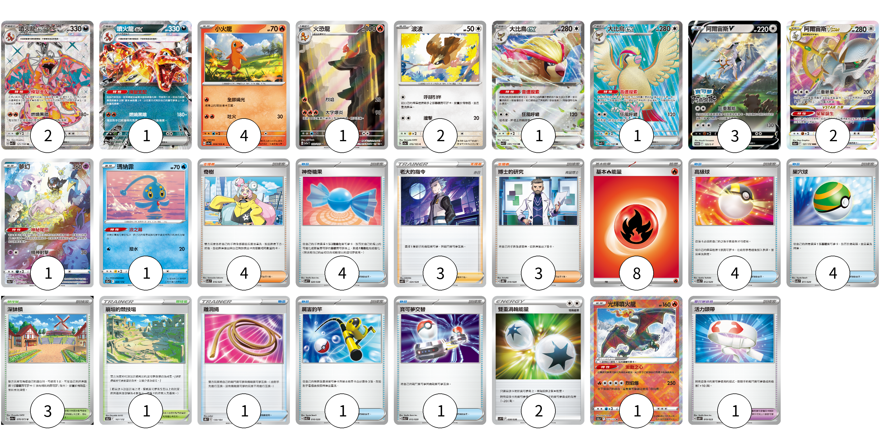 牌組構築方案 以此牌組為基礎新構築牌組 顯示卡面 顯示列表 寶可夢卡(21) 2 1 4 1 2 1 1 3 2 1 1 1 1 寶可夢道具(1) 1 物品卡(14) 4 4 4 1 1 支援者卡(10) 4 3 3 競技場卡(4) 3 1 能量卡(10) 8 2 寶可夢卡(21) 卡牌名稱 張數 卡牌名稱 張數 噴火龍ex SV3 125/108 02 噴火龍ex SV3 066/108 01 小火龍 SV2a 004/165 04 火恐龍 SV2a 169/165 01 波波 SV2a 016/165 02 大比鳥ex SV3 089/108 01 大比鳥ex SV3 128/108 01 阿爾宙斯V S-P 125/S-P 03 阿爾宙斯VSTAR S12a 127/172 02 夢幻 S12a 183/172 01 瑪納霏 S12a 029/172 01 厲害釣竿 SVEL 010/020 01 光輝噴火龍 S12a 015/172 01 寶可夢道具(1) 卡牌名稱 張數 卡牌名稱 張數 活力頭帶 SVAW 019/023 01 物品卡(14) 卡牌名稱 張數 卡牌名稱 張數 神奇糖果 SVF 020/038 04 高級球 SVEL 012/020 04 巢穴球 SVEL 011/020 04 離洞繩 S8b 130/184 01 寶可夢交替 SVEL 015/020 01 支援者卡(10) 卡牌名稱 張數 卡牌名稱 張數 奇樹 SVEL 016/020 04 老大的指令(赤日) SVB 024/028 03 博士的研究 SVEM 019/020 03 競技場卡(4) 卡牌名稱 張數 卡牌名稱 張數 深缽鎮 SV1a 070/073 03 崩塌的競技場 S12a 167/172 01 能量卡(10) 卡牌名稱 張數 卡牌名稱 張數 基本【火】能量 SVEL FIR 08 雙重渦輪能量 SVF 038/038 02 以此牌組為基礎新構築牌組 牌組編碼 FOduPv-nLTLJN-jYtDkN copy 列印牌組單 牌組編碼已複製 分享至SNS