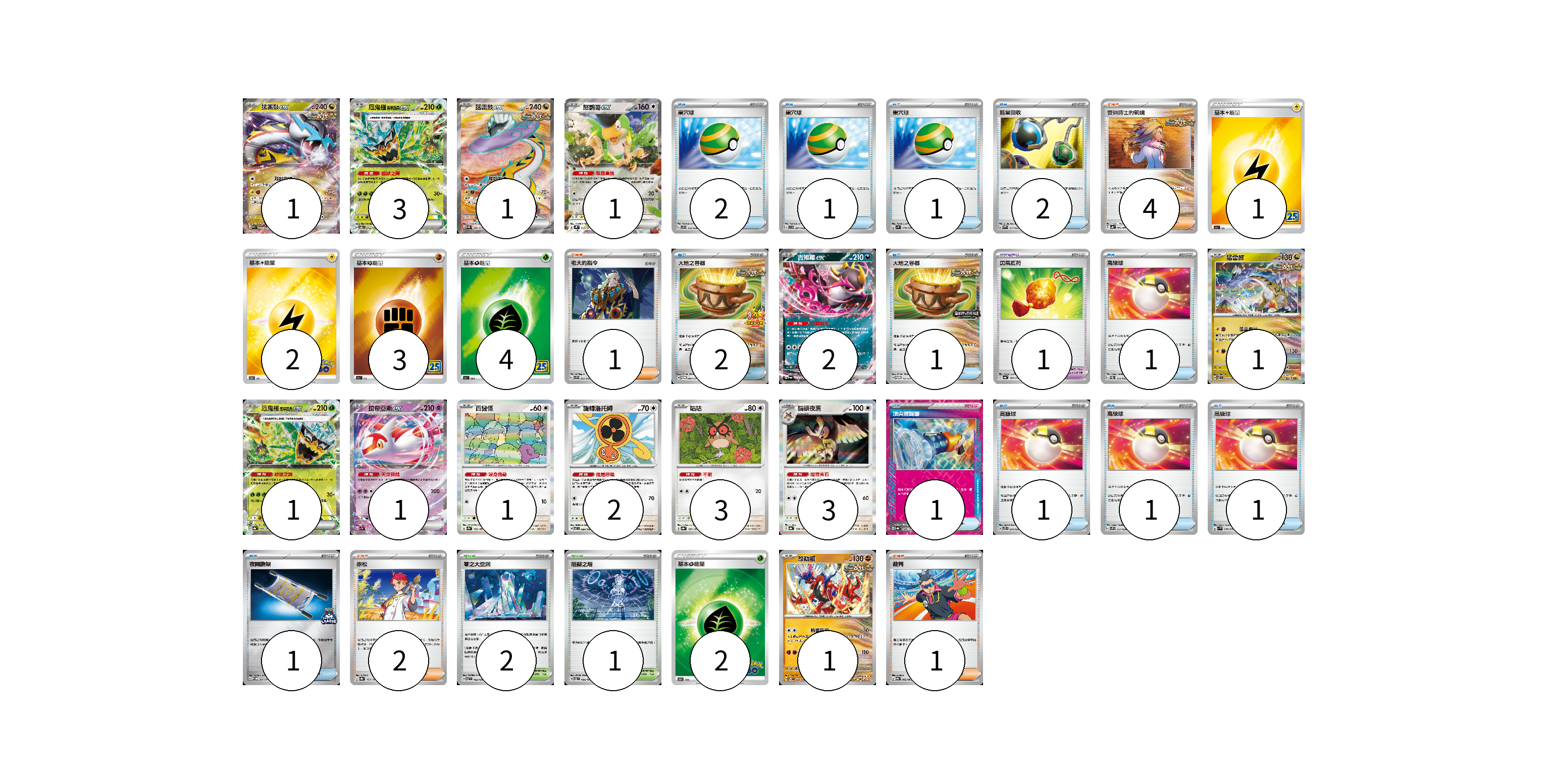 牌組構築方案 以此牌組為基礎新構築牌組 顯示卡面 顯示列表 寶可夢卡(21) 1 3 1 1 2 1 1 1 1 2 3 3 1 寶可夢道具(1) 1 物品卡(15) 2 1 1 2 2 1 1 1 1 1 1 1 支援者卡(8) 4 1 2 1 競技場卡(3) 2 1 能量卡(12) 1 2 3 4 2 寶可夢卡(21) 卡牌名稱 張數 卡牌名稱 張數 猛雷鼓ex SV5K 053/071 01 厄鬼椪 碧草面具ex SV6 016/101 03 猛雷鼓ex SV5K 089/071 01 怒鸚哥ex SV2P 065/071 01 吉雉雞ex SV6a 038/064 02 猛雷鼓 SV7 075/102 01 厄鬼椪 碧草面具ex SV8a 020/187 01 拉帝亞斯ex SV7a 019/064 01 百變怪 SV2a 132/165 01 旋轉洛托姆 SV7 080/102 02 咕咕 SV8a 127/187 03 貓頭夜鷹 SV8a 128/187 03 故勒頓 SV8 069/106 01 寶可夢道具(1) 卡牌名稱 張數 卡牌名稱 張數 勇氣護符 SV4a 169/190 01 物品卡(15) 卡牌名稱 張數 卡牌名稱 張數 巢穴球 SVF 016/038 02 巢穴球 SVB 001/028 01 巢穴球 SV1S 070/078 01 能量回收 SVAW 011/023 02 大地之容器 SV-P 084/SV-P 02 大地之容器 SV-P 137/SV-P 01 高級球 SVEM 013/020 01 頂尖捕捉器 SV8a 148/187 01 高級球 SVTS 014/022 01 高級球 SVF 017/038 01 高級球 SV1V 070/078 01 夜間擔架 SV-P 204/SV-P 01 支援者卡(8) 卡牌名稱 張數 卡牌名稱 張數 奧琳博士的氣魄 SV4K 064/066 04 老大的指令 SVF 032/038 01 赤松 SV8a 163/187 02 裁判 SV9a 062/063 01 競技場卡(3) 卡牌名稱 張數 卡牌名稱 張數 零之大空洞 SV7 102/102 02 阻礙之塔 SV6 100/101 01 能量卡(12) 卡牌名稱 張數 卡牌名稱 張數 基本雷能量 S8a LIG 01 基本雷能量 S10b LIG 02 基本鬥能量 S8a FIG 03 基本草能量 S8a GRA 04 基本草能量 S10b GRA 02 以此牌組為基礎新構築牌組 牌組編碼 FPuRUo-YFNifp-wLDdhn copy 列印牌組單 牌組編碼已複製 分享至SNS