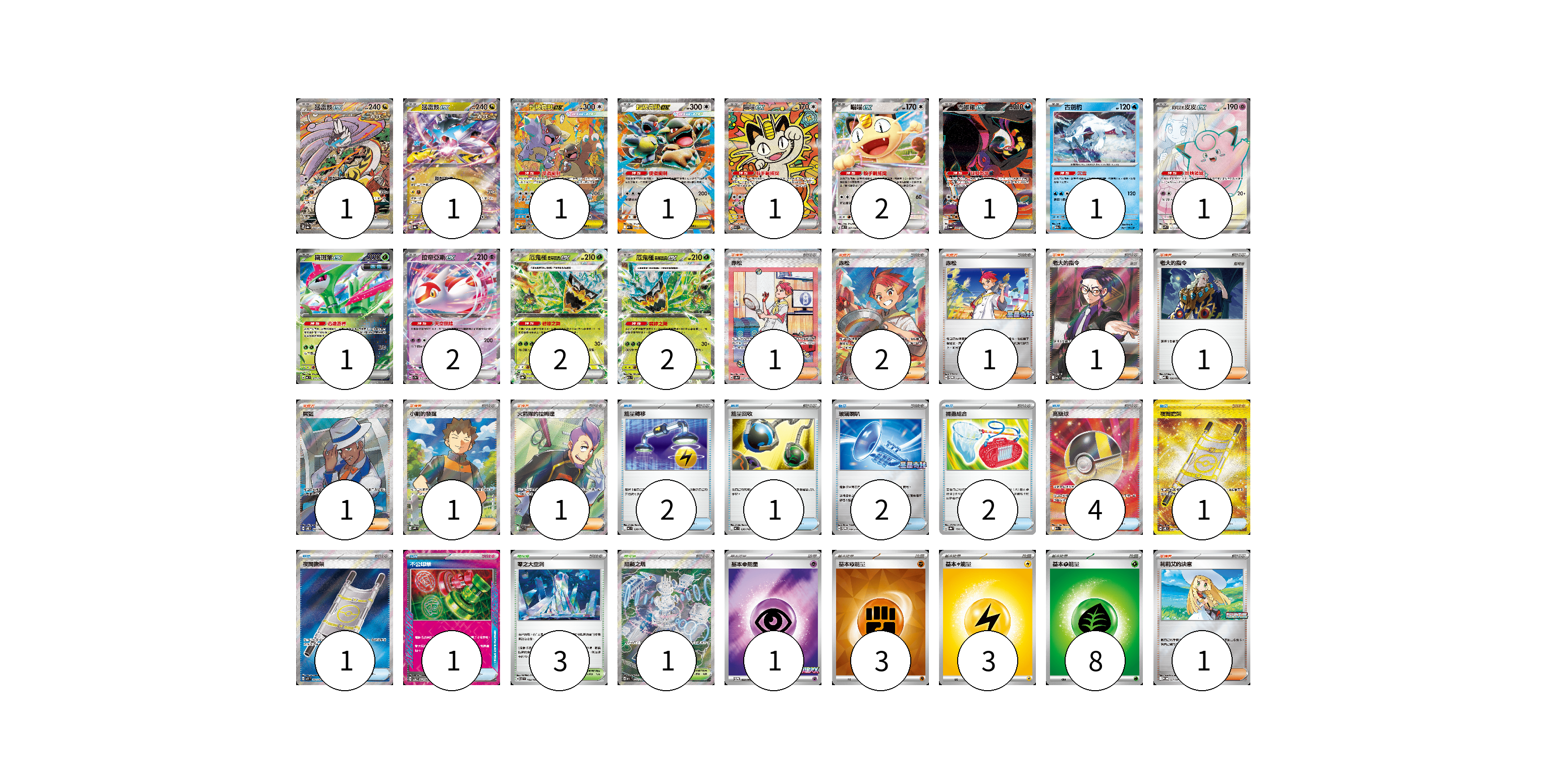 牌組構築方案 以此牌組為基礎新構築牌組 顯示卡面 顯示列表 寶可夢卡(17) 1 1 1 1 1 2 1 1 1 1 2 2 2 物品卡(14) 2 1 2 2 4 1 1 1 支援者卡(10) 1 2 1 1 1 1 1 1 1 競技場卡(4) 3 1 能量卡(15) 1 3 3 8 寶可夢卡(17) 卡牌名稱 張數 卡牌名稱 張數 猛雷鼓ex SV8a 222/187 01 猛雷鼓ex SV8a 124/187 01 超級袋獸ex M1S 089/063 01 超級袋獸ex M1S 051/063 01 喵喵ex M3 114/080 01 喵喵ex M3 061/080 02 吉雉雞ex SV6a 089/064 01 古劍豹 M2a 043/193 01 莉莉艾的皮皮ex SV9 115/100 01 鐵斑葉ex MC 077/742 01 拉帝亞斯ex SV7a 019/064 02 厄鬼椪 碧草面具ex SV8a 020/187 02 厄鬼椪 碧草面具ex M2a 017/193 02 物品卡(14) 卡牌名稱 張數 卡牌名稱 張數 能量轉移 MC 638/742 02 能量回收 MC 636/742 01 玻璃喇叭 SV-P 149/SV-P 02 捕蟲組合 SV8a 150/187 02 高級球 M2a 216/193 04 夜間擔架 SV8 137/106 01 夜間擔架 M1L 083/063 01 不公印章 SV5a 053/066 01 支援者卡(10) 卡牌名稱 張數 卡牌名稱 張數 赤松 SV8a 227/187 01 赤松 SV7 123/102 02 赤松 SV-P 150/SV-P 01 老大的指令(烏羽) MC 760/742 01 老大的指令 MBD 020/022 01 席藍 SV8 127/106 01 小剛的發掘 SV9 123/100 01 火箭隊的拉姆達 SV10 122/098 01 莉莉艾的決意 M-P 011/M-P 01 競技場卡(4) 卡牌名稱 張數 卡牌名稱 張數 零之大空洞 SV7 102/102 03 阻礙之塔 M2a 222/193 01 能量卡(15) 卡牌名稱 張數 卡牌名稱 張數 基本【超】能量 M-P 033/M-P 01 基本【鬥】能量 SVM FIG 03 基本【雷】能量 MC LIG 03 基本【草】能量 MC GRA 08 以此牌組為基礎新構築牌組 牌組編碼 FSDkzk-LwEuan-eAVynq copy 列印牌組單 牌組編碼已複製 分享至SNS