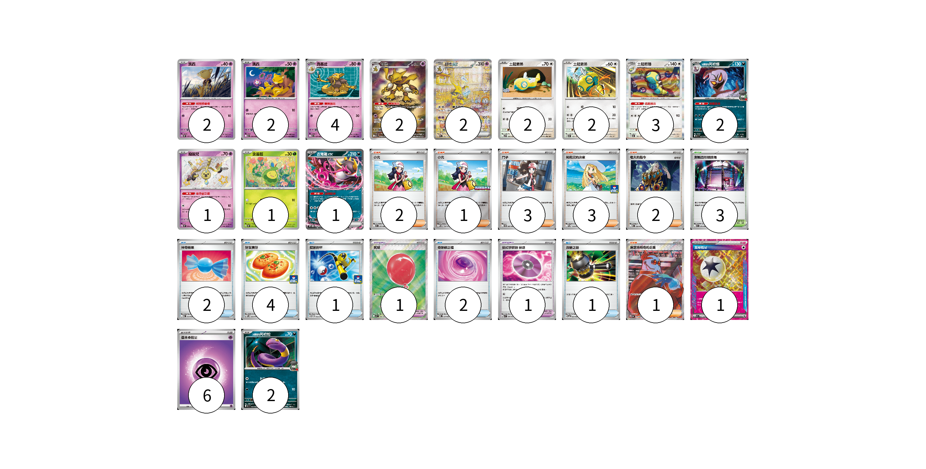 牌組構築方案 以此牌組為基礎新構築牌組 顯示卡面 顯示列表 寶可夢卡(26) 2 2 4 2 2 2 2 3 2 1 1 1 2 寶可夢道具(2) 1 1 物品卡(10) 2 4 1 2 1 支援者卡(12) 2 1 3 3 2 1 競技場卡(3) 3 能量卡(7) 1 6 寶可夢卡(26) 卡牌名稱 張數 卡牌名稱 張數 凱西 SV8a 057/187 02 凱西 M1S 036/063 02 勇基拉 M1S 037/063 04 胡地 M1S 071/063 02 胡地ex SV2a 203/165 02 土龍弟弟 SV9 078/100 02 土龍弟弟 SV8a 129/187 02 土龍節節 SV8a 130/187 03 <火箭隊的>阿柏怪 SV10 057/098 02 鑰圈兒 SV4a 264/190 01 含羞苞 SV8a 001/187 01 吉雉雞ex SVOM 009/021 01 <火箭隊的>阿柏蛇 SV10 056/098 02 寶可夢道具(2) 卡牌名稱 張數 卡牌名稱 張數 氣球 M1L 084/063 01 招式學習器 衰退 SVK 026/042 01 物品卡(10) 卡牌名稱 張數 卡牌名稱 張數 神奇糖果 MBG 013/022 02 好友寶芬 SV-P 212/SV-P 04 厲害釣竿 SV-P 112/SV-P 01 奇跡修正檔 MBD 017/022 02 改造之錘 SV5a 054/066 01 支援者卡(12) 卡牌名稱 張數 卡牌名稱 張數 小光 M2 077/080 02 小光 M-P 028/M-P 01 鬥子 SV11W 085/086 03 莉莉艾的決意 M-P 018/M-P 03 老大的指令 MBD 020/022 02 庫瑟洛斯奇的企圖 SV6a 086/064 01 競技場卡(3) 卡牌名稱 張數 卡牌名稱 張數 對戰圓形競技場 M2 079/080 03 能量卡(7) 卡牌名稱 張數 卡牌名稱 張數 富裕能量 SV7a 064/064 01 基本【超】能量 MBD PSY 06 以此牌組為基礎新構築牌組 牌組編碼 FSODMZ-jCPrYU-WsVxTc copy 列印牌組單 牌組編碼已複製 分享至SNS